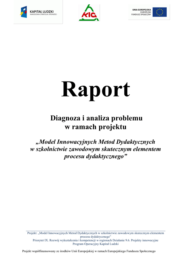 Raport Diagnoza i analiza problemu w ramach projektu „Model Innowacyjnych Metod Dydaktycznych w szkolnictwie zawodowym skutecznym elementem procesu dydaktycznego” __________________________________________________________________________ Projekt: „Model Innowacyjnych Metod Dydaktycznych w szkolnictwie zawodowym skutecznym elementem procesu dydaktycznego” Priorytet IX. Rozwój wykształcenia i kompetencji w regionach Działanie 9.6. Projekty innowacyjne Program Operacyjny Kapitał Ludzki Projekt współfinansowany ze środków Unii Europejskiej w ramach Europejskiego Funduszu Społecznego Skuteczna edukacja zawodowa jest jednym z priorytetowych zadań polityki oświatowej państwa. Dotychczasowy system edukacji zbudowany jest na następujących założeniach: Wszyscy ludzie otrzymują od szkoły ten sam, jednorodny zasób wiedzy do opanowania; Wiedza podzielona jest na obszary, zwane przedmiotami, zgodnie z tradycją akademicką Co 45 minut, każdy mózg, niezależnie od swoich właściwości, musi przeskakiwać do innego obszaru; Szkoła ocenia poziom opanowania wiedzy każdego ucznia, w każdym z obszarów. Uzyskane oceny są najważniejszym wyznacznikiem efektów pracy ucznia, nauczyciela i szkoły; Taki model, który został ukształtowany w XIX wieku coraz bardziej rozmija się z rzeczywistymi potrzebami współczesnego człowieka i społeczeństwa. Konieczne jest przeprowadzenie w systemie edukacji zawodowej takich zmian, aby wiedza i umiejętności nabywane w procesie kształcenia umożliwiały osobom uczącym się odnalezienie swojego miejsca na rynku pracy zgodnie z potwierdzonymi kwalifikacjami, jak najbliższymi zapotrzebowaniu pracodawców. Aby zmienić negatywne nastawienie szkoła zawodowa musi stać się szkołą pozytywnego wyboru, w której kształcenie ogólne jest tak samo ważne jak kształcenie zawodowe. Tylko integracja obu nurtów kształcenia – ogólnego i zawodowego – odpowiadająca potrzebom osób uczących się, umożliwi wyposażenie uczniów w kompetencje kluczowe i da im rzetelne przygotowanie zawodowe. Obowiązujący system kształcenia powinien umożliwić zwiększenie poziomu mobilności zawodowej Polaków oraz powiązanie systemu kształcenia zawodowego z rynkiem pracy. W celu podniesienia poziomu kształcenia instytucje szkoleniowe i doradcze od lat podejmują próby wprowadzenia do szkoły nowoczesnych metod nauczania. Organizowane są szkolenia, kursy, warsztaty i lekcje otwarte dające możliwość poszerzania wiedzy i umiejętności nauczycieli w zakresie nowoczesnych i innowacyjnych metod prowadzenia procesu __________________________________________________________________________ Projekt: „Model Innowacyjnych Metod Dydaktycznych w szkolnictwie zawodowym skutecznym elementem procesu dydaktycznego” Priorytet IX. Rozwój wykształcenia i kompetencji w regionach Działanie 9.6. Projekty innowacyjne Program Operacyjny Kapitał Ludzki Projekt współfinansowany ze środków Unii Europejskiej w ramach Europejskiego Funduszu Społecznego dydaktycznego. Mimo podejmowanych działań wyniki egzaminów zewnętrznych w subregionie konińskim są niezadawalające. Szczególnie niepokoi niska zdawalność egzaminów zawodowych w technikach. Szukając przyczyn występującego zjawiska przeprowadzono pogłębioną jego analizę. Celem podjętego działania była diagnoza dotycząca stosowania nowoczesnych metod nauczania w procesie edukacyjnym w zakresie stosowania w praktyce metod aktywizujących w tym szczególnie metody projektu, oceniania wspierającego ucznia w rozwoju (ocenianie kształtujące, orientujące), a także kształcenia modułowego. Wybrane do diagnozy obszary stosowane w praktyce szkolnej dałyby uczniom możliwość rozwijania szeroko pojętych umiejętności oraz motywowałyby do rozwoju. Diagnoza miała także odpowiedzieć na pytanie, dlaczego nauczyciele mimo możliwości pozyskania wiedzy teoretycznej tak rzadko wykorzystują ją w praktyce. Interesowało nas również zdefiniowanie barier utrudniających wprowadzanie nowoczesnych metod realizacji procesu dydaktycznego, oraz gotowości środowiska szkolnego (nauczyciele, uczniowie) do przyjęcia zmian. W celu zachowania zasady triangulacji badania, a także zbadania stanu wiedzy użytkowników i ostatecznych odbiorców zostały przygotowane narzędzia diagnozy: kwestionariusz ankiety dla nauczycieli, kwestionariusz ankiety dla uczniów i formularz wywiadu (załącznik 1, 2, 3). Dobór i treść pytań wynikał z zakreślonych wcześniej obszarów diagnozy oraz miał na celu określenie dalszych kierunków prac projektowych. Pytania były głównie zamknięte w celu ułatwienia analizy ilościowej i prezentacji wyników w formie wykresów. W wyborze szkół kierowano się następującymi kryteriami: - liczebność oddziałów (najbardziej i najmniej liczna szkoła zawodowa w Koninie) - różnorodność typów szkół (technika, szkoły zawodowe, różne kierunki) - lokalizacja (jedna szkoła jest usytuowana w nowej części Konina, druga w starej) - różne warunki bazowe szkół - różny stopień zainteresowania gimnazjalistów podjęciem nauki w każdej ze szkół Do diagnozy wybrano dwie konińskie szkoły: Zespół Szkół Technicznych i Hutniczych w Koninie oraz Zespół Szkół im. Mikołaja Kopernika w Koninie. __________________________________________________________________________ Projekt: „Model Innowacyjnych Metod Dydaktycznych w szkolnictwie zawodowym skutecznym elementem procesu dydaktycznego” Priorytet IX. Rozwój wykształcenia i kompetencji w regionach Działanie 9.6. Projekty innowacyjne Program Operacyjny Kapitał Ludzki Projekt współfinansowany ze środków Unii Europejskiej w ramach Europejskiego Funduszu Społecznego W kwietniu 2011 roku przed ankietowaniem nastąpiła standaryzacja narzędzi w celu podniesienia efektywności badania. Diagnozą zostało objętych 20 nauczycieli (14 kobiet i 6 mężczyzn) i 20 uczniów. Po ustaleniach z dyrekcjami