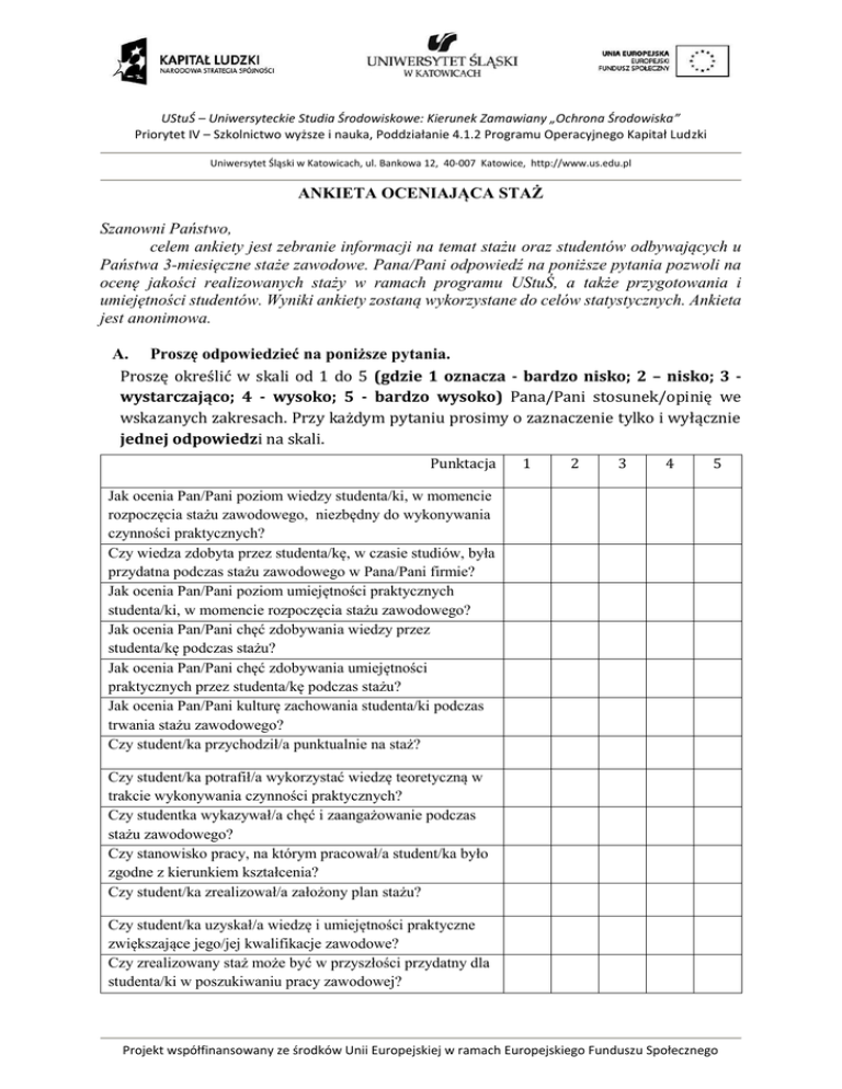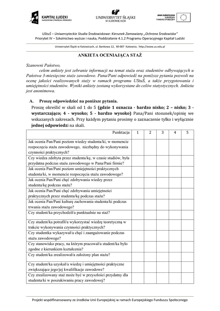 UStuŚ – Uniwersyteckie Studia Środowiskowe: Kierunek Zamawiany „Ochrona Środowiska” Priorytet IV – Szkolnictwo wyższe i nauka, Poddziałanie 4.1.2 Programu Operacyjnego Kapitał Ludzki Uniwersytet Śląski w Katowicach, ul. Bankowa 12, 40-007 Katowice, http://www.us.edu.pl ANKIETA OCENIAJĄCA STAŻ Szanowni Państwo, celem ankiety jest zebranie informacji na temat stażu oraz studentów odbywających u Państwa 3-miesięczne staże zawodowe. Pana/Pani odpowiedź na poniższe pytania pozwoli na ocenę jakości realizowanych staży w ramach programu UStuŚ, a także przygotowania i umiejętności studentów. Wyniki ankiety zostaną wykorzystane do celów statystycznych. Ankieta jest anonimowa. A. Proszę odpowiedzieć na poniższe pytania. Proszę okreslić w skali od 1 do 5 (gdzie 1 oznacza - bardzo nisko; 2 – nisko; 3 wystarczająco; 4 - wysoko; 5 - bardzo wysoko) Pana/Pani stosunek/opinię we wskazanyćh zakresaćh. Przy kazdym pytaniu prosimy o zaznaćzenie tylko i wyłąćznie jednej odpowiedzi na skali. Punktacja 1 2 3 4 5 Jak ocenia Pan/Pani poziom wiedzy studenta/ki, w momencie rozpoczęcia stażu zawodowego, niezbędny do wykonywania czynności praktycznych? Czy wiedza zdobyta przez studenta/kę, w czasie studiów, była przydatna podczas stażu zawodowego w Pana/Pani firmie? Jak ocenia Pan/Pani poziom umiejętności praktycznych studenta/ki, w momencie rozpoczęcia stażu zawodowego? Jak ocenia Pan/Pani chęć zdobywania wiedzy przez studenta/kę podczas stażu? Jak ocenia Pan/Pani chęć zdobywania umiejętności praktycznych przez studenta/kę podczas stażu? Jak ocenia Pan/Pani kulturę zachowania studenta/ki podczas trwania stażu zawodowego? Czy student/ka przychodził/a punktualnie na staż? Czy student/ka potrafił/a wykorzystać wiedzę teoretyczną w trakcie wykonywania czynności praktycznych? Czy studentka wykazywał/a chęć i zaangażowanie podczas stażu zawodowego? Czy stanowisko pracy, na którym pracował/a student/ka było zgodne z kierunkiem kształcenia? Czy student/ka zrealizował/a założony plan stażu? Czy student/ka uzyskał/a wiedzę i umiejętności praktyczne zwiększające jego/jej kwalifikacje zawodowe? Czy zrealizowany staż może być w przyszłości przydatny dla studenta/ki w poszukiwaniu pracy zawodowej? Projekt współfinansowany ze środków Unii Europejskiej w ramach Europejskiego Funduszu Społecznego UStuŚ – Uniwersyteckie Studia Środowiskowe: Kierunek Zamawiany „Ochrona Środowiska” Priorytet IV – Szkolnictwo wyższe i nauka, Poddziałanie 4.1.2 Programu Operacyjnego Kapitał Ludzki Uniwersytet Śląski w Katowicach, ul. Bankowa 12, 40-007 Katowice, http://www.us.edu.pl Czy student/ka wykonywał/a powierzone mu zadania w sposób kompetentny? Czy staż był przydatny dla Pana/Pani firmy? Czy współpraca z Uniwersytetem Śląskim przebiegała właściwie? B. Jakie są Pana/Pani najważniejsze spostrzeżenia dotyczące sposobu odbywania stażu? …………………………………………………………………………………….……… …………………………………………………………………..………………………... …………………………………………………………………………………………… ….………………………………………………………………………………………… ….……………………………………………………………………………..………… ………...………………………………………………………………………………… …………….…… C. Inne uwagi na temat organizacji i przebiegu stażu, propozycje zmian: ………………………………………………………………………………………………...… …………………………………………………………..…………………………………….… …………………………………………………………………………………………………... ………………………………………………………………………………………………...… …………………………………………………………..…………………………………….… ………………………………………………………………………………………………..…. ………………………………………………………………………………………………...… D. Czy wyraża Pan/Pani chęć dalszej współpracy z Uniwersytetem Śląskim? TAK NIE, dlaczego?....................................................................................................................................... ...................................................................................................................................................... Projekt współfinansowany ze środków Unii Europejskiej w ramach Europejskiego Funduszu Społecznego