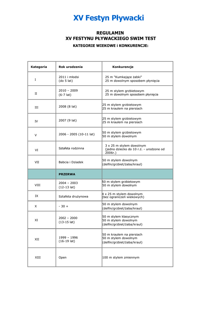 XV Festyn Pływacki REGULAMIN XV FESTYNU PŁYWACKIEGO SWIM TEST KATEGORIE WIEKOWE i KONKURENCJE: Kategoria Rok urodzenia Konkurencje I 2011 i młodsi (do 5 lat) 25 m "Kumkające żabki" 25 m dowolnym sposobem płynięcia II 2010 – 2009 (6-7 lat) 25 m stylem grzbietowym 25 m dowolnym sposobem płynięcia III 2008 (8 lat) 25 m stylem grzbietowym 25 m kraulem na piersiach IV 2007 (9 lat) 25 m stylem grzbietowym 25 m kraulem na piersiach V 2006 - 2005 (10-11 lat) 50 m stylem grzbietowym 50 m stylem dowolnym VI VII Sztafeta rodzinna Babcia i Dziadek 3 x 25 m stylem dowolnym (jedno dziecko do 10 r.ż. - urodzone od 2006r.) 50 m stylem dowolnym (delfin/grzbiet/żaba/kraul) PRZERWA 50 m stylem grzbietowym 50 m stylem dowolnym VIII 2004 – 2003 (12-13 lat) IX Sztafeta drużynowa 4 x 25 m stylem dowolnym (bez ograniczeń wiekowych) X - 30 + 50 m stylem dowolnym (delfin/grzbiet/żaba/kraul) XI 2002 – 2000 (13-15 lat) 50 m stylem klasycznym 50 m stylem dowolnym (delfin/grzbiet/żaba/kraul) XII 1999 – 1996 (16-19 lat) 50 m kraulem na piersiach 50 m stylem dowolnym (delfin/grzbiet/żaba/kraul) XIII Open 100 m stylem zmiennym OPIS KONKURENCJI: Konkurencje indywidualne: :: "Kumkające żabki” – Pokonanie dystansu 25m na brzuchu trzymając piankowy ‘makaron’ pod pachami. Sztafeta drużynowa: :: Każdy zawodnik pokonuje dystans 25m stylem dowolnym, kolejny zawodnik może rozpocząć swój dystans dopiero po dotknięciu ściany przez poprzedniego zawodnika. Sztafeta drużynowa: :: Każdy zawodnik pokonuje dystans 25m stylem dowolnym, kolejny zawodnik może rozpocząć swój dystans dopiero po dotknięciu ściany przez poprzedniego zawodnika. Start w każdej konkurencji indywidualnej może być wykonywany poprzez: skok startowy, skok na nogi, start z wody. WARUNKI UCZESTNICTWA: ::. uczestnikiem nie może być osoba, która posiada licencję sportową z roczną karencją ::. zawodnikiem może być osoba, która uczęszcza na zajęcia do szkółek pływackich ::. każdy uczestnik XV FESTYNU PŁYWACKIEGO SWIM TEST musi posiadać umiejętności pływackie zapewniające bezpieczne utrzymanie się na wodzie głębokiej, również przy pomocy sprzętu wypornościowego (skrzydełka, makaron) ::. organizator zakłada, że każda osoba zgłoszona do XV FESTYNU PŁYWACKIEGO SWIM TEST nie ma przeciwwskazań zdrowotnych do uczestnictwa w ww. Imprezie. w konkurencjach indywidualnych: ::. w kategoriach I-V oraz VII; VIII; XI; XII - dziewczęta i chłopcy klasyfikowani są osobno. ::. jeden zawodnik może brać udział maksymalnie w 2 konkurencjach indywidualnych ::. niepełnoletni uczestnik jest zobowiązany do przedstawienia Organizatorowi zgody Rodziców lub Opiekunów prawnych na udział w XV FESTYNIE PŁYWACKIM SWIM TEST w sztafetach: ::. w kategorii VI prawo do startu mają 3 osoby, w tym: minimum jedna urodzona od 2006 roku, pozostałe bez ograniczeń wiekowych (dowolny wiek), osoby startujące w danej sztafecie muszą być ze sobą spokrewnione. ::. w kategorii XI prawo do startu mają drużyna może wystawić dwie sztafety składające się z różnych członków. Jedna osoba może wziąć udział w jednej sztafecie, osoby startujące w danej sztafecie nie muszą być ze sobą spokrewnione. ::. obowiązkiem opiekuna zgłaszającego drużynę jest przedstawienie oświadczenia z informacją, że zawodnicy mu podlegli nie mają przeciwwskazań zdrowotnych do startu w XV FESTYNIE PŁYWACKIM SWIM TEST PUNKTACJA: Zarówno w konkurencjach sportowych jak i familijnych o zajętym miejscu decyduje uzyskany czas w poszczególnej konkurencji. W celu usprawnienie przebiegu imprezy Organizator dopuszcza możliwość wspólnego startu dziewcząt i chłopców przy zachowaniu klasyfikacji z podziałem dziewczęta - chłopcy. TERMIN ZAWODÓW: 4 grudnia 2016r. (niedziela). Rozpoczęcia zawodów, godz. 9:00. MIEJSCE ZAWODÓW: Międzyszkolny Basen Pływacki, ul. Francesco Nullo 23 Imprezę poprowadzi: Maciej Starowicz ZGŁOSZENIA: Ze względu na ograniczony czas na przeprowadzenie XV FESTYNU PŁYWACKIEGO SWIM TEST o starcie w imprezie decyduje kolejność zgłoszeń. Termin zgłoszenia upływa dnia 24 listopada 2016r. Zgłoszenia dokonane po tym terminie nie będą brane pod uwagę. Zastrzega się możliwość nie przyjęcia zgłoszeń ze względu na zbyt dużą liczbę uczestników. Zgłoszenia do festynu można dokonywać: osobiście w biurze SWIM TEST Kraków Al. Pokoju 78 (pn - pt.: 9:00 - 15:00), mailowo: [email protected] poprzez wypełnienie formularza dla zawodników indywidualnych, drużynowych oraz szkółek pływackich. Warunkiem zgłoszenia jest otrzymanie potwierdzenia zgłoszenia przez BOK Swim Test. OPŁATA STARTOWA: Każdy uczestnik jest zobligowany do dokonania jednorazowej opłaty startowej w wysokości 20,00 zł/osoby. Opłatę startową należy uiścić najpóźniej w terminie do dnia 24.11.2016r. (Po otrzymaniu potwierdzenia zgłoszenia): ::. w biurze firmy przy Al. Pokoju 78 ::. przelewem na konto: BSR o/Kraków 80 8589 0006 0000 0021 1451 0001 – z dopiskiem „Festyn pływacki” oraz imię i nazwisko uczestnika. Wniesienie opłaty nie jest równoznaczne ze zgłoszeniem uczestnictwa w imprezie. Nie przewiduje się zwrotów opłaty startowej. Zgodę rodzica/opiekuna na start w XV FESTYNIE PŁYWACKIM SWIM TEST należy przedstawić: w biurze firmy przy Al. Pokoju 78 w Krakowie do dnia 18.11.2015r. (skanem lub osobiście) NAGRODY: dla zwycięzców w poszczególnych kategoriach od miejsca I - III przyznane będą dyplomy i medale dla zawodników z kategorii I i II - pamiątkowe dyplomy uczestnictwa SPRAWY PORZĄDKOWE: W sprawach nie objętych regulaminem decyzje podejmuje Sędzia Główny zawodów, organizator. Na płycie basenowej obowiązuje obuwie zamienne (dotyczy uczestników oraz widzów). KONTAKT Wszelkie pytania związane z festynem proszę kierować na adres info @swimtest.pl