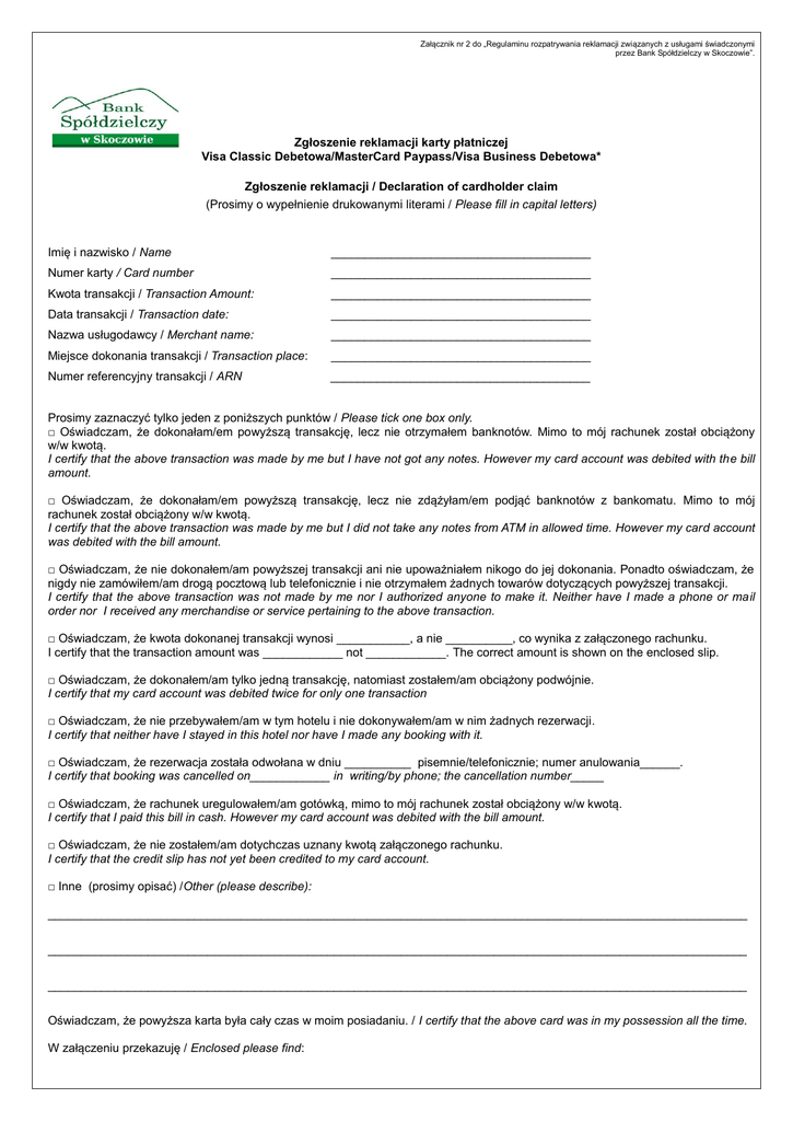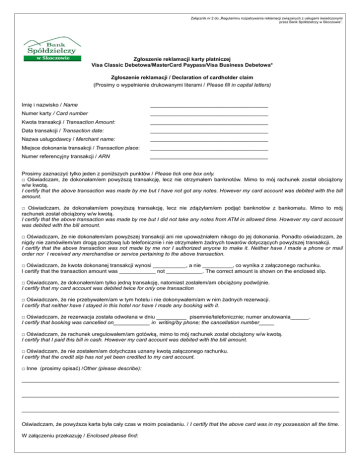 Załącznik nr 2 do „Regulaminu rozpatrywania reklamacji związanych z usługami świadczonymi przez Bank Spółdzielczy w Skoczowie”. Zgłoszenie reklamacji karty płatniczej Visa Classic Debetowa/MasterCard Paypass/Visa Business Debetowa* Zgłoszenie reklamacji / Declaration of cardholder claim (Prosimy o wypełnienie drukowanymi literami / Please fill in capital letters) Imię i nazwisko / Name _______________________________________ Numer karty / Card number _______________________________________ Kwota transakcji / Transaction Amount: _______________________________________ Data transakcji / Transaction date: _______________________________________ Nazwa usługodawcy / Merchant name: _______________________________________ Miejsce dokonania transakcji / Transaction place: _______________________________________ Numer referencyjny transakcji / ARN _______________________________________ Prosimy zaznaczyć tylko jeden z poniższych punktów / Please tick one box only. □ Oświadczam, że dokonałam/em powyższą transakcję, lecz nie otrzymałem banknotów. Mimo to mój rachunek został obciążony w/w kwotą. I certify that the above transaction was made by me but I have not got any notes. However my card account was debited with the bill amount. □ Oświadczam, że dokonałam/em powyższą transakcję, lecz nie zdążyłam/em podjąć banknotów z bankomatu. Mimo to mój rachunek został obciążony w/w kwotą. I certify that the above transaction was made by me but I did not take any notes from ATM in allowed time. However my card account was debited with the bill amount. □ Oświadczam, że nie dokonałem/am powyższej transakcji ani nie upoważniałem nikogo do jej dokonania. Ponadto oświadczam, że nigdy nie zamówiłem/am drogą pocztową lub telefonicznie i nie otrzymałem żadnych towarów dotyczących powyższej transakcji. I certify that the above transaction was not made by me nor I authorized anyone to make it. Neither have I made a phone or mail order nor I received any merchandise or service pertaining to the above transaction. □ Oświadczam, że kwota dokonanej transakcji wynosi ___________, a nie __________, co wynika z załączonego rachunku. I certify that the transaction amount was ____________ not ____________. The correct amount is shown on the enclosed slip. □ Oświadczam, że dokonałem/am tylko jedną transakcję, natomiast zostałem/am obciążony podwójnie. I certify that my card account was debited twice for only one transaction □ Oświadczam, że nie przebywałem/am w tym hotelu i nie dokonywałem/am w nim żadnych rezerwacji. I certify that neither have I stayed in this hotel nor have I made any booking with it. □ Oświadczam, że rezerwacja została odwołana w dniu __________ pisemnie/telefonicznie; numer anulowania______. I certify that booking was cancelled on____________ in writing/by phone; the cancellation number_____ □ Oświadczam, że rachunek uregulowałem/am gotówką, mimo to mój rachunek został obciążony w/w kwotą. I certify that I paid this bill in cash. However my card account was debited with the bill amount. □ Oświadczam, że nie zostałem/am dotychczas uznany kwotą załączonego rachunku. I certify that the credit slip has not yet been credited to my card account. □ Inne (prosimy opisać) /Other (please describe): _________________________________________________________________________________________________________ _________________________________________________________________________________________________________ _________________________________________________________________________________________________________ Oświadczam, że powyższa karta była cały czas w moim posiadaniu. / I certify that the above card was in my possession all the time. W załączeniu przekazuję / Enclosed please find: 1 3 2 4 Numer telefonu do kontaktu (bardzo ważne) / Telephone number ______________________________ Wyrażam zgodę na ewentualne udostępnianie organom ścigania moich danych osobowych oraz innych danych bezpośrednio lub pośrednio związanych z reklamowanymi prze mnie transakcjami. / I agree that bank may confidentially transfer my personal data as well as any information related to the claimed transactions to law enforcement bodies. Data / Date:________________ Podpis Posiadacza rachunku/Klienta / Signature:______________________________ Wypełnia placówka Banku: Dane dotyczące placówki Banku: Bank Spółdzielczy w Skoczowie Oddział w .............................. imię i nazwisko pracownika do kontaktu oraz jego nr telefonu: .......................................................................................... .......................................................................................... * niepotrzebne skreślić właściwe zaznaczyć krzyżykiem (X) stempel memoriałowy