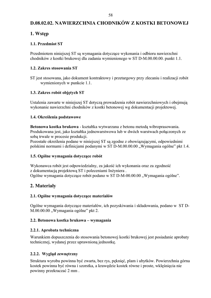 58 D.08.02.02. NAWIERZCHNIA CHODNIKÓW Z KOSTKI BETONOWEJ 1. Wstęp 1.1. Przedmiot ST Przedmiotem niniejszej ST są wymagania dotyczące wykonania i odbioru nawierzchni chodników z kostki brukowej dla zadania wymienionego w ST D-M.00.00.00. punkt 1.1. 1.2. Zakres stosowania ST ST jest stosowana, jako dokument kontraktowy i przetargowy przy zlecaniu i realizacji robót wymienionych w punkcie 1.1. 1.3. Zakres robót objętych ST Ustalenia zawarte w niniejszej ST dotyczą prowadzenia robót nawierzchniowych i obejmują wykonanie nawierzchni chodników z kostki betonowej wg dokumentacji projektowej. 1.4. Określenia podstawowe Betonowa kostka brukowa - kształtka wytwarzana z betonu metodą wibroprasowania. Produkowana jest, jako kształtka jednowarstwowa lub w dwóch warstwach połączonych ze sobą trwale w procesie produkcji. Pozostałe określenia podane w niniejszej ST są zgodne z obowiązującymi, odpowiednimi polskimi normami i definicjami podanymi w ST D-M.00.00.00 „Wymagania ogólne” pkt 1.4. 1.5. Ogólne wymagania dotyczące robót Wykonawca robót jest odpowiedzialny, za jakość ich wykonania oraz za zgodność z dokumentacją projektową ST i poleceniami Inżyniera . Ogólne wymagania dotyczące robót podano w ST D-M-00.00.00 „Wymagania ogólne”. 2. Materiały 2.1. Ogólne wymagania dotyczące materiałów Ogólne wymagania dotyczące materiałów, ich pozyskiwania i składowania, podano w ST DM.00.00.00 „Wymagania ogólne” pkt 2. 2.2. Betonowa kostka brukowa – wymagania 2.2.1. Aprobata techniczna Warunkiem dopuszczenia do stosowania betonowej kostki brukowej jest posiadanie aprobaty technicznej, wydanej przez uprawnioną jednostkę. 2.2.2. Wygląd zewnętrzny Struktura wyrobu powinna być zwarta, bez rys, pęknięć, plam i ubytków. Powierzchnia górna kostek powinna być równa i szorstka, a krawędzie kostek równe i proste, wklęśnięcia nie powinny przekraczać 2 mm . 59 2.2.3. Kształt, wymiary i kolor kostki brukowej Do wykonania nawierzchni chodnika stosuje się betonową kostkę brukową o grubości 80 mm. Tolerancje wymiarowe wynoszą: na długości ± 3 mm, na szerokości ± 3 mm, na grubości ± 5 mm. 2.2.4. Cechy fizykomechaniczne betonowych kostek brukowych Betonowe kostki brukowe powinny mieć cechy fizykomechaniczne określone w tablicy 1. Tablica 1. Cechy fizykomechaniczne betonowych kostek brukowych Lp. Cechy 1 Wytrzymałość na ściskanie po 28 dniach, MPa, co najmniej - średnia z sześciu kostek - najmniejsza pojedynczej kostki 60 50 2 Nasiąkliwość wodą wg PN-B-06250 [2], %, nie więcej niż 5 3 Odporność na zamrażanie, po 50 cyklach zamrażania, wg PN-B-06250 : - pęknięcia próbki - strata masy, %, nie więcej niż - obniżenie wytrzymałości na ściskanie w stosunku do wytrzymałości próbek nie zamrażanych, %, nie więcej niż 4 Wartość Ścieralność na tarczy Boehmego wg PN-B-04111 [1], mm, nie więcej niż brak 5 20 4 2.3. Materiały na podsypkę i do zapraw Piasek na podsypkę cementowo-piaskową powinien odpowiadać wymaganiom PN-B-06712 , a do zaprawy cementowo-piaskowej PN-B-06711 . Cement na podsypkę i do zaprawy cementowo-piaskowej powinien być cementem portlandzkim klasy nie mniejszej niż „32,5”, odpowiadający wymaganiom PN-B-19701. Woda powinna być odmiany „1” i odpowiadać wymaganiom PN-B-32250 . 3. Sprzęt 3.1. Ogólne wymagania dotyczące sprzętu Ogólne wymagania dotyczące sprzętu podano w ST D-M.00.00.00 „Wymagania ogólne” pkt 3. 3.2. Sprzęt do wykonania chodnika z kostki brukowej Chodnik z kostki brukowej wykonuje się ręcznie . Do zagęszczenia nawierzchni stosuje się wibratory płytowe z osłoną z tworzywa sztucznego. 4. Transport 4.1. Ogólne wymagania dotyczące transportu Ogólne wymagania dotyczące transportu podano w ST D-M.00.00.00 „Wymagania ogólne” pkt 4. 60 4.2. Transport kostki Kostki betonowe można przewozić samochodami na paletach transportowych producenta. 5. Wykonanie robót 5.1. Ogólne zasady wykonania robót Ogólne zasady wykonania robót podano w ST D-M.00.00.00 „Wymagania ogólne” pkt 5. 5.2. Przygotowanie podłoża Podłoże powinno być wyprofilowane zgodnie z spadkami poprzecznymi i podłużnymi. 5.3. Podsypka Na podsypkę należy stosować piasek odpowiadający wymaganiom PN-B-06712 [3]. Grubość podsypki cementowo-piaskowej po zagęszczeniu powinna wynosić 5 cm. Podsypka powinna być zwilżona wodą, zagęszczona i wyprofilowana. 5.4. Układanie kostki betonowej Kostkę układa się na podsypce w taki sposób, aby szczeliny między kostkami wynosiły od 2 do 3 mm. Kostkę należy układać ok. 1,5 cm wyżej od projektowanej niwelety chodnika, gdyż w czasie wibrowania (ubijania) podsypka ulega zagęszczeniu. Po ułożeniu kostki, szczeliny należy wypełnić piaskiem, a następnie zamieść powierzchnię ułożonych kostek przy użyciu szczotek ręcznych lub mechanicznych i przystąpić do ubijania nawierzchni chodnika. Do ubijania stosuje się wibratory płytowe z osłoną z tworzywa sztucznego dla ochrony kostek przed uszkodzeniem i zabrudzeniem. Wibrowanie należy prowadzić od krawędzi powierzchni ubijanej w kierunku środka i jednocześnie w kierunku poprzecznym kształtek. Do zagęszczania nawierzchni z betonowych kostek brukowych nie wolno używać walca. Po ubiciu nawierzchni należy uzupełnić szczeliny materiałem do wypełnienia i zamieść nawierzchnię. 6. Kontrola jakości robót 6.1. Ogólne zasady kontroli jakości robót Ogólne zasady kontroli, jakości robót podano w ST D-M.00.00.00 „Wymagania ogólne” pkt 6. 6.2. Badania przed przystąpieniem do robót Przed przystąpieniem do robót Wykonawca powinien sprawdzić, czy producent kostek brukowych posiada aprobatę techniczną. Sprawdzenie wyglądu zewnętrznego należy przeprowadzić na podstawie oględzin elementu i przez pomiar, zgodnie z wymaganiami i tolerancjami punktu 2.2. 6.3. Badania w czasie robót 61 6.3.1. Sprawdzenie podłoża Sprawdzenie podłoża poleg