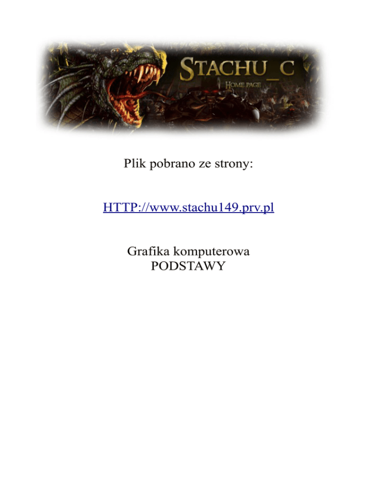 Plik pobrano ze strony: HTTP://www.stachu149.prv.pl Grafika komputerowa PODSTAWY Grafika komputerowa – Jest to obraz tworzony lub poddawany obróbce za pomocą komputera. Istnieje rozróżnienie pomiędzy grafiką BITMAPOWĄ i WEKTOROWĄ. Bitmapy to obrazy będące zbiorami punktów (pikseli) w różnych kolorach. Natomiast pliki grafiki wektorowej zawierają nie sam obraz, a instrukcje, które wykorzystywane są przez komputer do "budowania" grafiki na ekranie. Grafika komputerowa dzieli się na dwie główne kategorie: OBRAZY RASTROWE i GRAFIKĘ WEKTOROWĄ. Prace tworzone za pomocą min. Programów Adobe Photoshop, Corel Photopaint lub Painter są bitmapami (rastrami).Natomiast obrazki tworzone przez programy ilustracyjne Corel Draw, Adobe Ilustrator albo Freehand są grafiką wektorową. Zrozumienie różnicy między tymi dwoma rodzajami grafiki ułatwia tworzenie i modyfikowanie obrazków cyfrowych. Obrazy rastrowe zwane również bitmapami, składają się z siatki, czyli rastra małych kwadracików nazywanych pikselami. Każdy piksel w obrazie bitmapowym ma swoje miejsce oraz kolor. Pracując z obrazami bitmapowymi modyfikuje się grupy pikseli, a nie obiekty i kształty. Bitmapy są najczęściej wykorzystywanym rodzajem grafiki przy pracy z obrazami o płynnych przejściach tonów, takimi jak fotografie lub obrazy stworzone w programach do malowania, ponieważ mogą one odzwierciedlić gradacje cieni i kolorów. Obrazy bitmapowe zależą od rozdzielczości składają się z określonej liczby pikseli. Z tego powodu mogą być zatarte i pozbawione niektórych szczegółów, jeśli zmieni się ich rozmiar na ekranie lub wydrukuje w większej rozdzielczości niż ta, z jaką zostały utworzone.W zależności od liczby kolorów, jakie możemy wykorzystać w mapie bitowej, rozróżniamy mapy: 1-bitowe, 8-bitowe, 16-bitowe, 24-bitowe i 32-bitowe. Mapy 1-bitowe to mapy czarno-białe, natomiast w mapach 8bitowych na jeden piksel przypada 256 kolorów, w 16-bitowych 65 536 kolorów, w 24-bitowych 16777216 kolorów itd. Liczba pikseli użytych do odwzorowania obrazu w komputerze zależy od jego rozdzielczości. Na objętość zbioru graficznego istotny wpływ ma również ilość możliwych do zapamiętania kolorów. Jak łatwo się można domyślić im więcej kolorów tym większa objętość. Do zapamiętania wystąpień 16 777 216 kolorów na tej samej powierzchni trzeba użyć większej ilości bitów niż do zapamiętania 256 kolorów. Do wstępnego oszacowania wielkości pliku możemy posłużyć się prostym wzorem: Wp = ilość pikseli w pionie x ilość pikseli w poziomie x ilość kolorów. Przetwarzanie map bitowych wymaga odpowiedniej ilości pamięci RAM w komputerze. Oczywiście im więcej, tym lepiej. W przypadku obrazów rastrowych liczba pikseli przypadająca na jednostkę powierzchni jest wielkością stałą (rozdzielczość), dlatego też przy powiększeniu mapy bitowej występuje efekt powiększenia piksela. W praktyce objawia się to widocznymi na ekranie monitora lub wydruku schodkami, stąd jakość obrazu nie jest najlepsza. Występująca wtedy utrata ostrości obrazu map bitowych jest ich podstawową wadą. Inną wadą jest brak możliwości operowania na fragmentach obrazu. Grafikę rastrową można przyrównać do obrazka namalowanego farbkami. Zmiana barwy dowolnego fragmentu polega na nałożeniu pędzelkiem innego koloru. Nie można tutaj zmienić np. kształtu namalowanego obiektu przez jego modelowanie, a jedynie przez namalowanie w jego miejsce nowego. Grafika wektorowa składa się z linii prostych i krzywych, zdefiniowanych przez obiekty matematyczne - wektory. Wektory opisują grafikę w kategoriach geometrycznych. Jeśli na przykład w programie wektorowym chce się narysować koło, program utworzy je na podstawie wzoru matematycznego opisującego kształt, rozmiar i położenie. Koło można następnie przesuwać oraz zmieniać jego wielkość i kolor, a grafika nie straci przy tym na jakości. Grafika wektorowa nie zależy od rozdzielczości, tzn. nie jest określana przez stałą liczbę pikseli i jest zawsze odtwarzana z maksymalną rozdzielczością dowolnego urządzenia wyjściowego. Z tego powodu grafika wektorowa najlepiej nadaje się do tworzenia grafiki tekstowej (zwłaszcza z małą czcionką), wizytówek, emblematów, znaków firmowych, gdzie linie muszą być ostre i wyraźne niezależnie od wielkości, w jakiej są odtwarzane. Bez względu na to, w jakim programie pracujemy, monitor zawsze wyświetla grafikę jako piksele ekran składa się z siatki pikseli. Dlatego np. narysowane w programie wektorowym koło może na monitorze wydawać się kanciaste, co nie będzie widoczne na wydruku. Podstawowe formaty plików graficznych: - BMP Format przechowywania grafiki rastrowej opracowany dla OS/2, a następnie zastosowany jako podstawowy format plików graficznych Windows, co jest główną przyczyną popularności tego formatu. Pliki BMP zwane również bitmapami (ich rozszerzenie to .Bmp) mogą zawierać obrazy o głębi kolorów do 24 bitów, a więc ok. 16,7 milionów kolorów. Możliwa jest również ich kompresja. - JPEG Jeden z popularnych formatów zapisu plików graficznych. JPEG potrafi zapisywać 24-bitowy kolor ze stuprocentową wiernością, ale można także pominąć niektóre szczegóły, dzięki czemu plik wynikowy zajmuje znacznie mniej miejsca (jest to tak zwana kompresja stratna) Pliki w formacie JPEG mają rozszerzenia.Jpg lub.Jpeg Od ang. Joint Photographic Experts Group - GIF Zaletą GIF-ów jest ich mały rozmiar (dzięki kompresji) oraz możliwość tworzenia animacji. Są one szeroko wykorzystywane w internecie, jednak powoli odchodzą w zapomnienie. Pliki w tym formacie mają rozszerzenie.Gif Od ang. Graphics Interchange Format - TIFF Format zapisu plików graficznych. TIFF jest rodzajem bitmapy wykorzystującym różne metody kompresji; istnieje też możliwość zapisu bez kompresji. TIFF zapisuje 24-bitowy kol