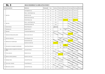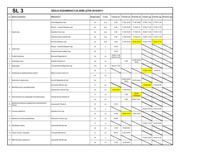 SL 3 Lp Nazwa przedmiotu 1 2 Język obcy SESJA EGZAMINACYJA-SEM.LETNI 2010/2011 Wykładowca Rodzaj zajęć V sem. I termin zal. II termin zal. III termin zal. I termin egz. II termin egz. III termin egz. Lalko Magdalena mgr ćw zo,e 4.06 11.06-10:45 17.06-18:00 18.06-11:45 17.09-11:30 Rawicz - Lipiński Zbigniew mgr ćw zo,e 4.06 11.06-10:45 17.09-8:15 18.06-11:45 17.09-11:30 Szembek Anna mgr ćw zo,e 4.06 11.06-10:45 17.09-8:15 18.06-11:45 17.09-11:30 Wojciechowska Izabela mgr ćw zo,e 4.06 11.06-10:45 17.09-8:15 18.06-11:45 17.09-11:30 Gromiec Maurycy mgr ćw zo,e 4.06 11.06-10:45 16.09-16:15 18.06-11:45 16.09-17:15 Rawicz - Lipiński Zbigniew mgr W z 14.05 Wojciechowska Izabela mgr W z 14.05 18.06-11:00 i25.06-11:00 5.06 23.09-16:00 wpisy 17.06-17:00 16.09-16 18.06-9:00 17.09-18:00 25.06-10:00 10.09-12:00 19.06-11:00 16.09-18:00 19.06-10:00 16.09-17:00 Język obcy 3 Projekt badawczy Bukowski Bogusław dr ćw zo 4 Socjologia pracy Sopalak GraŜyna dr ćw zo 5 Negocjacje Tomaszewska Małgorzata mgr w-ty zo W e 6 Współczesne Społeczeństwo polskie Mazur-Łuczak Joanna dr ćw zo Kunicki Bogusław dr hab. ćw z Kucharska Monika mgr K zo Szynkarczuk Jolanta mgr ćw zo K zo 5.06 ćw zo 5.06 W zo W e ćw zo 11.06 K zo 28.05 K e ćw zo 11.06 19.06-9:00 K zo 28.05 3.06-18:45 W e ćw zo 7 Seminarium dyplomowe 8 Metodyka pracy resocjalizacyjnej 9 10 Wprowadzenie do pedagogiki resocjalizacyjnej Społeczno-polityczne zagadnienie transformacji w Polsce 11 Procesy społeczne 25.06-17:00 18.06-10:00wpisy 18.06-9:00 17.09-18:00 Filipiak-Strawa ElŜbieta dr Leszczyński Paweł dr 23.09-wpisy 24.0910:00wpisy 26.06-13:00 13.05 Pławska Anna mgr 12 Społeczne problemy globalizacji Pisarewicz Joanna mgr 13 Socjologia rodziny Jackowiak Renata mgr 14 Teorie emocji i motywacji Tomczak Marzena dr 15 Makrostruktury społeczne Jackowiak Renata mgr 11.06 19.06-13:30 19.06-9:00 9.09-17:00