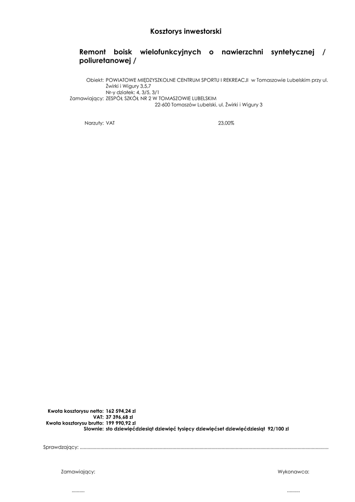 Kosztorys inwestorski - Zespół Szkół nr 2 w Tomaszowie