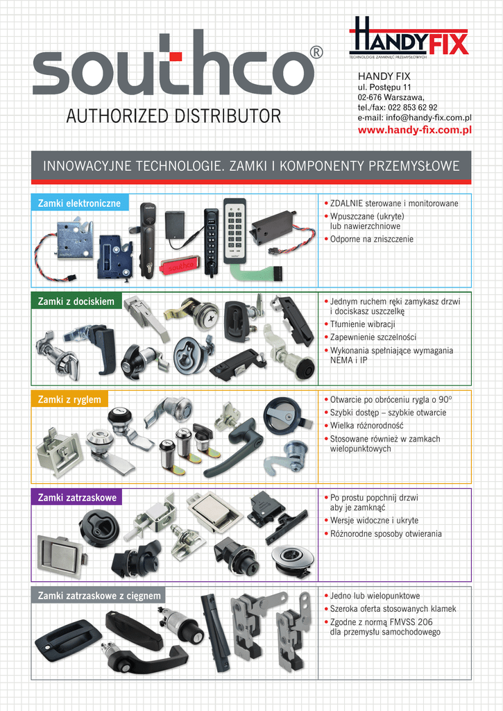 HANDY FIX ul. Postępu 11 02-676 Warszawa, tel./fax: 022 853 62 92 e-mail: info@handy-fix.com.pl www.handy-fix.com.pl INNOWACYJNE TECHNOLOGIE. ZAMKI I KOMPONENTY PRZEMYSŁOWE Zamki elektroniczne • ZDALNIE sterowane i monitorowane • Wpuszczane (ukryte) lub nawierzchniowe • Odporne na zniszczenie Zamki z dociskiem • Jednym ruchem ręki zamykasz drzwi Zamki z ryglem • Otwarcie po obróceniu rygla o 90º • Szybki dostęp – szybkie otwarcie • Wielka różnorodność • Stosowane również w zamkach i dociskasz uszczelkę • Tłumienie wibracji • Zapewnienie szczelności • Wykonania spełniające wymagania NEMA i IP wielopunktowych Zamki zatrzaskowe • Po prostu popchnij drzwi Zamki zatrzaskowe z cięgnem • Jedno lub wielopunktowe • Szeroka oferta stosowanych klamek • Zgodne z normą FMVSS 206 aby je zamknąć • Wersje widoczne i ukryte • Różnorodne sposoby otwierania dla przemysłu samochodowego Zamki wielopunktowe • Jedna klamka zamyka w 2, 3 Zamki drzwiowe • Zamki drzwiowe lub więcej punktach • Dostępne wykonania w wersji dociskowej z użyciem uszczelki Szczególnie dla: - jachtów, statków - pojazdów rekreacyjnych - autobusów Zamki dociągowe • Do zamykania w jednej płaszczyźnie Zawiasy • Zapewniają dodatkowe funkcje: Szybkozłącza • Zaprojektowane dla szybkiego dostępu • Łączniki związane z panelem, lub w płaszczyznach tworzących kąt • Wielka różnorodność wymiarów i odmian - możliwość zdejmowania drzwi - blokowanie drzwi w wybranym położeniu - zawiasy chowane - zawiasy dociskowe zabezpieczone przed zgubieniem • Wielka różnorodność napędów • Szczególnie stosowane w sprzęcie elektrotechnicznym i elektronicznym Łączniki śrubowe na uwięzi • Łączniki związane z panelem Rączki i uchwyty • Szybki, łatwy montaż • Również: zabezpieczone przed zgubieniem • Wielka różnorodność: - kształtów, gwintów - sposobów montażu • Szczególnie stosowane w sprzęcie elektrotechnicznym i elektronicznym - wykonanie kryte i niskoprofilowe POWYŻSZE KOMPONENTY PRZEMYSŁOWE STANOWIĄ TYLKO CZĘŚĆ DOSTĘPNYCH. PYTAJ O PEŁNY KATALOG (TECHNICZNY) PRODUKTÓW SOUTHCO