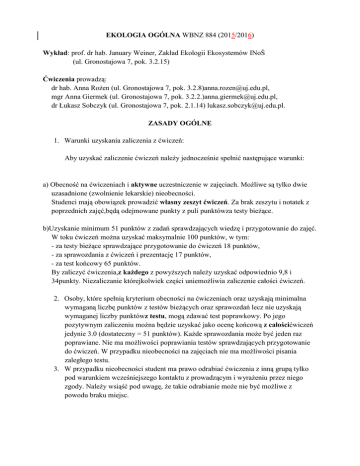 EKOLOGIA OGÓLNA WBNZ 884 (2015/2016) Wykład: prof. dr hab. January Weiner, Zakład Ekologii Ekosystemów INoŚ (ul. Gronostajowa 7, pok. 3.2.15) Ćwiczenia prowadzą: dr hab. Anna RoŜen (ul. Gronostajowa 7, pok. 3.2.8)[email protected], mgr Anna Giermek (ul. Gronostajowa 7, pok. 3.2.2.)[email protected], dr Łukasz Sobczyk (ul. Gronostajowa 7, pok. 2.1.14) [email protected]. ZASADY OGÓLNE 1. Warunki uzyskania zaliczenia z ćwiczeń: Aby uzyskać zaliczenie ćwiczeń naleŜy jednocześnie spełnić następujące warunki: a) Obecność na ćwiczeniach i aktywne uczestniczenie w zajęciach. MoŜliwe są tylko dwie uzasadnione (zwolnienie lekarskie) nieobecności. Studenci mają obowiązek prowadzić własny zeszyt ćwiczeń. Za brak zeszytu i notatek z poprzednich zajęć,będą odejmowane punkty z puli punktówza testy bieŜące. b)Uzyskanie minimum 51 punktów z zadań sprawdzających wiedzę i przygotowanie do zajęć. W toku ćwiczeń moŜna uzyskać maksymalnie 100 punktów, w tym: - za testy bieŜące sprawdzające przygotowanie do ćwiczeń 18 punktów, - za sprawozdania z ćwiczeń i prezentację 17 punktów, - za test końcowy 65 punktów. By zaliczyć ćwiczenia,z kaŜdego z powyŜszych naleŜy uzyskać odpowiednio 9,8 i 34punkty. Niezaliczanie którejkolwiek części uniemoŜliwia zaliczenie całości ćwiczeń. 2. Osoby, które spełnią kryterium obecności na ćwiczeniach oraz uzyskają minimalna wymaganą liczbę punktów z testów bieŜących oraz sprawozdań lecz nie uzyskają wymaganej liczby punktówz testu, mogą zdawać test poprawkowy. Po jego pozytywnym zaliczeniu moŜna będzie uzyskać jako ocenę końcową z całościćwiczeń jedynie 3.0 (dostateczny = 51 punktów). KaŜde sprawozdania moŜe być jeden raz poprawiane. Nie ma moŜliwości poprawiania testów sprawdzających przygotowanie do ćwiczeń. W przypadku nieobecności na zajęciach nie ma moŜliwości pisania zaległego testu. 3. W przypadku nieobecności student ma prawo odrabiać ćwiczenia z inną grupą tylko pod warunkiem wcześniejszego kontaktu z prowadzącym i wyraŜeniu przez niego zgody. NaleŜy wsiąść pod uwagę, Ŝe takie odrabianie moŜe nie być moŜliwe z powodu braku miejsc. 4. Ocena uzyskana podczas ćwiczeń stanowi 30% oceny z kursu (70% oceny to wynik egzaminu) 5. W przypadku nie uzyskania zaliczenia z ćwiczeń student powtarza cały kurs w następnym roku akademickim (wg zasad regulaminu). 6. Studenci maja prawo do dodatkowych konsultacji, wyjaśnień i dyskusji z prowadzącymi, poza godzinami zajęć. KaŜdy prowadzący zajęcia uzgadnia ze swoją grupą stały termin na dodatkowe spotkania, w tym terminie kursanci mają pierwszeństwo przed innymi obowiązkami nauczyciela. MoŜna się umawiać równieŜ w innych terminach w miarę wolnego czasu osób prowadzących. 7. Na ćwiczeniach wymagana jest znajomość arkusza kalkulacyjnego i edytora tekstu na poziomie szkoły średniej (patrz podstawa programowa nauczania informatyki). NaleŜy umieć sporządzić tabele i wykresy. NaleŜy umieć posługiwać się formułami, wiedzieć co to jest adresowanie względne i bezwzględne itp.
