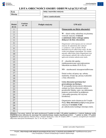 LISTA OBECNOŚCI OSOBY ODBYWAJĄCEJ STAŻ Imię i nazwisko stażysty Rok Miesiąc Adres zamieszkania Dzień m-ca 1 2 3 4 5 6 7 8 9 10 11 12 13 14 15 16 17 18 19 20 21 22 23 24 25 26 27 28 29 30 31 Godzina od - do Podpis stażysty UWAGI Oznaczenia na liście obecności: W – dzień wolny udzielony na pisemny wniosek stażysty (wniosek o udzielenie dnia wolnego należy dołączyć do listy obecności) Organizator zobowiązany jest na wniosek stażysty do udzielenia dni wolnych w wymiarze 2 dni za każde 30 dni kalendarzowych odbywania stażu. Za dni wolne przysługuje stypendium. Za ostatni miesiąc odbywania stażu Organizator jest zobowiązany udzielić dni wolnych przed upływem terminu zakończenia stażu. C – choroba lub opieka (udokumentowana zaświadczeniem lekarskim na druku ZUS ZLA) NN – nieobecność nieusprawiedliwiona Dzień wolny od pracy np. sobota, niedziela, święto itp. proszę wykreślić z listy obecności. Lista obecności powinna być prowadzona na bieżąco. W przypadku konieczności dokonania zmiany na liście obecności należy przekreślić błędny wpis i po dokonaniu poprawy potwierdzić ją podpisem i pieczątką (prosimy nie używać korektora). Organizator stażu dostarcza do Urzędu Pracy listę obecności podpisywaną przez stażystę w terminie 5 dni po zakończeniu każdego miesiąca stażu. UWAGA: Czas pracy stażysty nie może przekraczać 8 godzin na dobę i 40 godzin tygodniowo, a stażysty będącego osobą niepełnosprawną zaliczoną do znacznego lub umiarkowanego stopnia niepełnosprawności – 7 godzin na dobę i 35 godzin tygodniowo (Rozporządzenie Ministra Pracy i Polityki Społecznej z dnia 20 sierpnia 2009 r. w sprawie szczegółowych warunków odbywania stażu przez bezrobotnych - Dz. U. Nr 142, poz. 1160). …………………………………………………………………………… (podpis i pieczątka Organizatora) Projekt „Aktywizacja osób młodych pozostających bez pracy w powiecie pszczyńskim (I)” współfinansowany przez Unię Europejską w ramach Europejskiego Funduszu Społecznego WERSJA 5