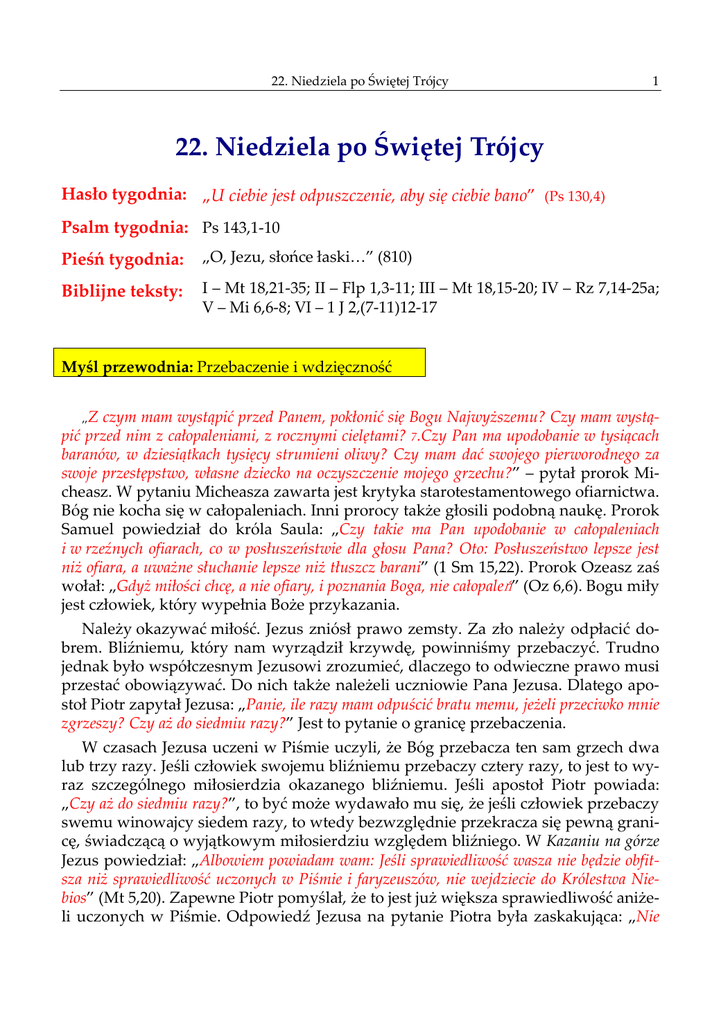 22. Niedziela po Świętej Trójcy 1 22. Niedziela po Świętej Trójcy Hasło tygodnia: „U ciebie jest odpuszczenie, aby się ciebie bano” (Ps 130,4) Psalm tygodnia: Ps 143,1-10 Pieśń tygodnia: „O, Jezu, słońce łaski…” (810) Biblijne teksty: I – Mt 18,21-35; II – Flp 1,3-11; III – Mt 18,15-20; IV – Rz 7,14-25a; V – Mi 6,6-8; VI – 1 J 2,(7-11)12-17 Myśl przewodnia: Przebaczenie i wdzięczność „Z czym mam wystąpić przed Panem, pokłonić się Bogu Najwyższemu? Czy mam wystąpić przed nim z całopaleniami, z rocznymi cielętami? 7.Czy Pan ma upodobanie w tysiącach baranów, w dziesiątkach tysięcy strumieni oliwy? Czy mam dać swojego pierworodnego za swoje przestępstwo, własne dziecko na oczyszczenie mojego grzechu?” – pytał prorok Micheasz. W pytaniu Micheasza zawarta jest krytyka starotestamentowego ofiarnictwa. Bóg nie kocha się w całopaleniach. Inni prorocy także głosili podobną naukę. Prorok Samuel powiedział do króla Saula: „Czy takie ma Pan upodobanie w całopaleniach i w rzeźnych ofiarach, co w posłuszeństwie dla głosu Pana? Oto: Posłuszeństwo lepsze jest niż ofiara, a uważne słuchanie lepsze niż tłuszcz barani” (1 Sm 15,22). Prorok Ozeasz zaś wołał: „GdyŜ miłości chcę, a nie ofiary, i poznania Boga, nie całopaleń” (Oz 6,6). Bogu miły jest człowiek, który wypełnia Boże przykazania. Należy okazywać miłość. Jezus zniósł prawo zemsty. Za zło należy odpłacić dobrem. Bliźniemu, który nam wyrządził krzywdę, powinniśmy przebaczyć. Trudno jednak było współczesnym Jezusowi zrozumieć, dlaczego to odwieczne prawo musi przestać obowiązywać. Do nich także należeli uczniowie Pana Jezusa. Dlatego apostoł Piotr zapytał Jezusa: „Panie, ile razy mam odpuścić bratu memu, jeżeli przeciwko mnie zgrzeszy? Czy aż do siedmiu razy?” Jest to pytanie o granicę przebaczenia. W czasach Jezusa uczeni w Piśmie uczyli, że Bóg przebacza ten sam grzech dwa lub trzy razy. Jeśli człowiek swojemu bliźniemu przebaczy cztery razy, to jest to wyraz szczególnego miłosierdzia okazanego bliźniemu. Jeśli apostoł Piotr powiada: „Czy aż do siedmiu razy?”, to być może wydawało mu się, że jeśli człowiek przebaczy swemu winowajcy siedem razy, to wtedy bezwzględnie przekracza się pewną granicę, świadczącą o wyjątkowym miłosierdziu względem bliźniego. W Kazaniu na górze Jezus powiedział: „Albowiem powiadam wam: Jeśli sprawiedliwość wasza nie będzie obfitsza niż sprawiedliwość uczonych w Piśmie i faryzeuszów, nie wejdziecie do Królestwa Niebios” (Mt 5,20). Zapewne Piotr pomyślał, że to jest już większa sprawiedliwość aniżeli uczonych w Piśmie. Odpowiedź Jezusa na pytanie Piotra była zaskakująca: „Nie 2 22. Niedziela po Świętej Trójcy powiadam ci: Do siedmiu razy, lecz do siedemdziesięciu siedmiu razy”, to znaczy zawsze, niezależnie od okoliczności i sytuacji. Wtedy też Pan Jezus powiedział uczniom swoim przypowieść o królu i jego słudze, który był winien swojemu Panu bardzo dużą sumę pieniędzy. Sługa ów nie miał z czego oddać królowi, dlatego prosił o zwłokę. Król okazał się wspaniałomyślny i cały dług darował swojemu słudze. Jednakże sługa, któremu dług darowano, nie okazał ani trochę serca swojemu dłużnikowi. Pan Jezus powiada, że dusił on swojego współsługę i nalegał, aby natychmiast oddał mu dług, nieporównanie mniejszy od tego, który został mu darowany przez króla. Wtedy – powiada Pan Jezus – król dowiedziawszy się o tym, nakazał go przyprowadzić i powiedział do niego: „Sługo zły! Wszystek tamten dług darowałem ci, boś mnie prosił. Czy i ty nie powinieneś był zlitować się nad współsługą swoim, jak i ja zlitowałem się nad tobą?” Sługę bez serca i litości spotkała kara. I dodał Pan Jezus do opowiedzianej przypowieści: „Tak i Ojciec mój niebieski uczyni wam, jeśli każdy nie odpuści z serca swego bratu swemu”. Druga ewangelia przeznaczona na 22. Niedzielę po Świętej Trójcy zawiera napomnienie Jezusa, które ma związek ze słowami o przebaczeniu bliźniemu jego win. „A jeśliby zgrzeszył brat twój, idź, upomnij go sam na sam; jeśliby cię usłuchał, pozyskałeś brata swego. Jeśliby zaś nie usłuchał, weź z sobą jeszcze jednego lub dwóch, aby na oświadczeniu dwu lub trzech świadków była oparta każda sprawa. A jeśliby ich nie usłuchał, powiedz zborowi; a jeśliby zboru nie usłuchał, niech będzie dla ciebie jak poganin i celnik”. Tu jednak nie chodzi o to, że w niektórych wypadkach nie należy przebaczać aż do siedemdziesięciu siedmiu razy, lecz o to, że czyniącemu zło należy przebaczyć, ale i upomnieć. Jeśli bliźni czyniący zło nie chce przyjąć napomnienia, należy się od niego odsunąć. Ta zasada musi mieć zastosowanie w Kościele. Człowiek, który lekceważy sobie napomnienia, powinien być wyłączony z Kościoła, bowiem społeczność wierzących to wprawdzie społeczność niedoskonałych, ale dążących do doskonałości. Apostoł Paweł był świadomy, że człowiek nie jest w stanie żyć bez grzechu. Grzech przenika wszystkich i dlatego wszyscy że są grzeszni czynią zło i życie ich owocuje w nieprawości. Jeśli komuś się wydaje, że jest inaczej, powinien dobrze wsłuchać się w słowa Wielkiego Apostoła Narodów: „Nie rozeznaję się w tym, co czynię; gdyż nie to czynię, co chcę, ale czego nienawidzę, to czynię. 16.A jeśli to czynię, czego nie chcę, zgadzam się z tym, że zakon jest dobry. Ale wtedy czynię to już nie ja, lecz grzech, który mieszka we mnie. Wiem tedy, że nie mieszka we mnie, to jest w ciele moim, dobro; mam bowiem zawsze dobrą wolę, ale wykonania tego, co dobre, brak; albowiem nie czynię dobrego, które chcę, tylko złe, którego nie chcę, to czynię. A jeśli czynię to, czego nie chcę, już nie ja to czynię, ale grzech, który mieszka