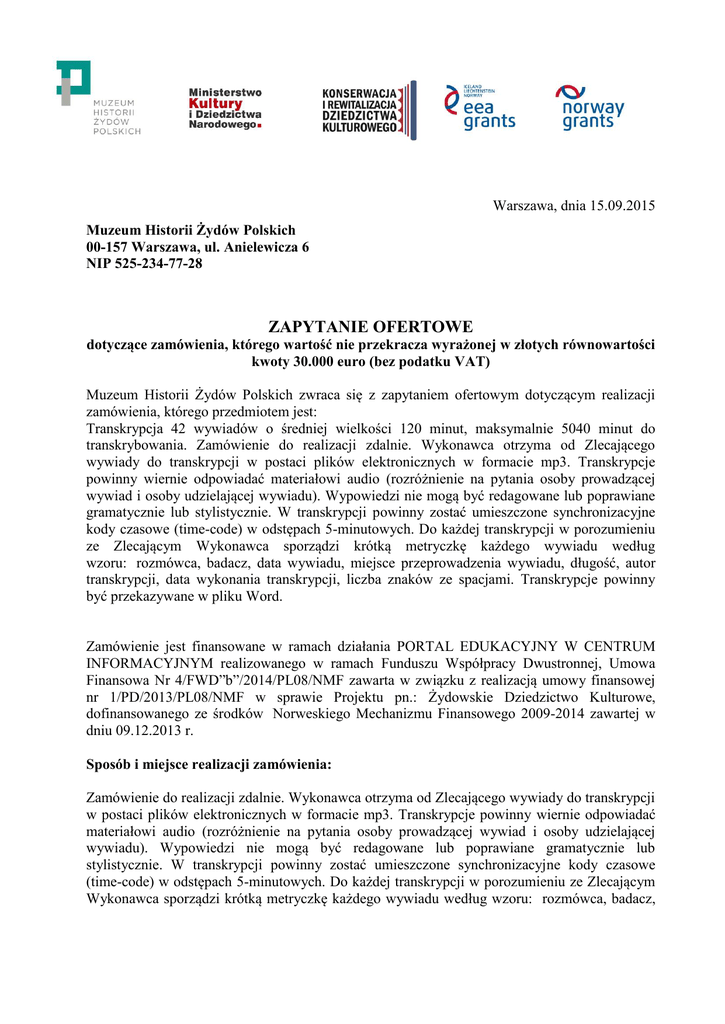 Warszawa, dnia 15.09.2015 Muzeum Historii Żydów Polskich 00-157 Warszawa, ul. Anielewicza 6 NIP 525-234-77-28 ZAPYTANIE OFERTOWE dotyczące zamówienia, którego wartość nie przekracza wyrażonej w złotych równowartości kwoty 30.000 euro (bez podatku VAT) Muzeum Historii Żydów Polskich zwraca się z zapytaniem ofertowym dotyczącym realizacji zamówienia, którego przedmiotem jest: Transkrypcja 42 wywiadów o średniej wielkości 120 minut, maksymalnie 5040 minut do transkrybowania. Zamówienie do realizacji zdalnie. Wykonawca otrzyma od Zlecającego wywiady do transkrypcji w postaci plików elektronicznych w formacie mp3. Transkrypcje powinny wiernie odpowiadać materiałowi audio (rozróżnienie na pytania osoby prowadzącej wywiad i osoby udzielającej wywiadu). Wypowiedzi nie mogą być redagowane lub poprawiane gramatycznie lub stylistycznie. W transkrypcji powinny zostać umieszczone synchronizacyjne kody czasowe (time-code) w odstępach 5-minutowych. Do każdej transkrypcji w porozumieniu ze Zlecającym Wykonawca sporządzi krótką metryczkę każdego wywiadu według wzoru: rozmówca, badacz, data wywiadu, miejsce przeprowadzenia wywiadu, długość, autor transkrypcji, data wykonania transkrypcji, liczba znaków ze spacjami. Transkrypcje powinny być przekazywane w pliku Word. Zamówienie jest finansowane w ramach działania PORTAL EDUKACYJNY W CENTRUM INFORMACYJNYM realizowanego w ramach Funduszu Współpracy Dwustronnej, Umowa Finansowa Nr 4/FWD”b”/2014/PL08/NMF zawarta w związku z realizacją umowy finansowej nr 1/PD/2013/PL08/NMF w sprawie Projektu pn.: Żydowskie Dziedzictwo Kulturowe, dofinansowanego ze środków Norweskiego Mechanizmu Finansowego 2009-2014 zawartej w dniu 09.12.2013 r. Sposób i miejsce realizacji zamówienia: Zamówienie do realizacji zdalnie. Wykonawca otrzyma od Zlecającego wywiady do transkrypcji w postaci plików elektronicznych w formacie mp3. Transkrypcje powinny wiernie odpowiadać materiałowi audio (rozróżnienie na pytania osoby prowadzącej wywiad i osoby udzielającej wywiadu). Wypowiedzi nie mogą być redagowane lub poprawiane gramatycznie lub stylistycznie. W transkrypcji powinny zostać umieszczone synchronizacyjne kody czasowe (time-code) w odstępach 5-minutowych. Do każdej transkrypcji w porozumieniu ze Zlecającym Wykonawca sporządzi krótką metryczkę każdego wywiadu według wzoru: rozmówca, badacz, data wywiadu, miejsce przeprowadzenia wywiadu, długość, autor transkrypcji, data wykonania transkrypcji, liczba znaków ze spacjami. Transkrypcje powinny być przekazywane sukcesywnie w miarę postępu prac w formie elektronicznych dokumentów tekstowych w pliku Word. Termin realizacji – dwa miesiące od podpisania umowy, w ramach umowy Wykonawca zobowiązuje się przesyłać transkrypcje z 3 wywiadów tygodniowo, rozliczenie tygodniowe. Kryteria oceny ofert: 1) 50% - udokumentowane doświadczenie w postaci referencji lub/i udokumentowane przeprowadzenie transkrypcji w postaci umowy, faktury lub rachunku , (Zamawiający przyzna 10 punktów za każdą zrealizowaną transkrypcję powyżej 2 wymaganych, max. 50 pkt.) 2) cena –50% 𝐶= 𝐶𝑚𝑖𝑛 ∗ 50𝑝𝑘𝑡 𝐶𝑏𝑎𝑑 gdzie: Cmin oznacza najmniejszą zaproponowaną cenę Cbad oznacza cenę zaproponowaną w danej ofercie C oznacza liczbę punktów przyznanych danej ofercie Wykonawca zobowiązany jest podać w formularzu ofertowym cenę za 1 stronę znormalizowanego maszynopisu transkrypcji (1800 znaków ze spacjami) w j. polskim W przypadku, gdy cena najkorzystniejszej oferty przekroczy możliwości finansowe Zamawiającego, postępowanie może zostać unieważnione. Zamawiający może odstąpić od zawarcia umowy, w każdym czasie bez podania przyczyn lub zamknąć postępowanie o udzielenie zamówienia publicznego. W przypadku możliwości zrealizowania wyżej wymienionego zamówienia, prosimy o przesłanie oferty według załącznika nr 1 do zapytania e-mailem na adres [email protected] najpóźniej do dnia 17 września 2015 r. do końca dnia ........................................................... (podpis pracownika ) Muzeum Historii Żydów Polskich 00-157 Warszawa, ul. Anielewicza 6 NIP 525-234-77-28 FORMULARZ OFERTOWY Pełna nazwa wykonawcy: ______________________________________________________ Siedziba i adres wykonawcy: ____________________________________________________ Nr REGON: ____________________ NIP: ____________________ Telefon: ____________________ Fax: ____________________ Adres e-mail: ______________________________ W odpowiedzi na zapytanie ofertowe na: oferujemy wykonanie ww. przedmiotu zamówienia zgodnie z wymogami opisanymi w zapytaniu ofertowym /ogłoszeniu za cenę: Cena ……………………..………………………………….……………………………………………. zł brutto (słownie złotych:… ……………………………………………………………………….…………………………………………...) za 1 stronę znormalizowanego maszynopisu transkrypcji (1800 znaków ze spacjami) w j. polskim Wykonawca zobowiązany jest podać w formularzu ofertowym cenę brutto w PLN *Ceny należy podać z dokładnością do dwóch miejsc po przecinku zgodnie z polskim systemem płatniczym (data i podpis)