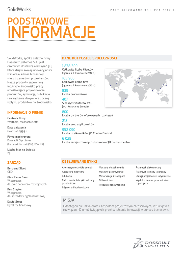 SolidWorks ................................................................................................ Z A K T UA L I Z O WA N O 3 0 lipca 2 0 1 2 PODSTAWOWE INFORMACJE ................................................................................................ SolidWorks, spółka zależna firmy Dassault Systèmes S.A., jest czołowym dostawcą rozwiązań 3D, które dzięki swojej innowacyjności wspierają sukces biznesowy wielu inżynierów i projektantów. Nasze produkty zapewniają intuicyjne środowisko pracy umożliwiające projektowanie produktów, symulację, publikację i zarządzanie danymi oraz ocenę wpływu produktów na środowisko. DANE DOTYCZĄCE SPOŁECZNOŚCI 1 878 300 Całkowita liczba klientów (łącznie z II kwartałem 2012 r.) 165 900 Całkowita liczba firm (łącznie z II kwartałem 2012 r.) 839 Liczba pracowników 407 Sieć dystrybutorów VAR (w 71 krajach na świecie) INFORMACJE O FIRMIE 800 Centrala firmy Waltham, Massachusetts 218 Data założenia Grudzień 1993 r. Firma macierzysta Dassault Systèmes (Euronext Paris #13065, DSY.PA) Liczba partnerów oferowanych rozwiązań Liczba grup użytkowników 952 090 Liczba użytkowników 3D ContentCentral 6 029 Liczba zarejestrowanych dostawców 3D ContentCentral Liczba biur na świecie 23 ZARZĄD OBSŁUGIWANE RYNKI Bertrand Sicot CEO Alternatywne źródła energii Maszyny do pakowania Przemysł elektroniczny Aparatura medyczna Maszyny przemysłowe Przemysł lotniczy i obronny Gian Paolo Bassi Wiceprezes ds. prac badawczo-rozwojowych Edukacja Motoryzacja i transport Usługi projektowe i inżynierskie Elektrownie, fabryki i zakłady przetwórcze Odlewnictwo Wydobycie oraz przetwórstwo ropy i gazu Ken Clayton Wiceprezes ds. sprzedaży ogólnoświatowej David Stott Dyrektor finansowy Inżynieria i budownictwo Produkty konsumenckie MISJA Udostępnienie inżynierom i zespołom projektowym całościowych, intuicyjnych rozwiązań 3D umożliwiających przekształcenie innowacji w sukces biznesowy. R . KAMIENIE MILOWE DANE FINANSOWE 1993 482,621 miliona USD Rok założenia Przychody w 2011 r. 1995 132,4 miliona USD Dostarczenie pierwszej licencji programu Przychody w II kwartale 2012 r. SolidWorks 95 1 783,0 miliona euro 1997 Przychody spółki Dassault Systèmes w 2011 r. Przejęcie przez Dassault Systèmes 2001 $500 Dassault Systèmes przejmuje SRAC, $450 SolidWorks dołącza symulację do $400 głównego procesu projektowania 2006 Przejęcie firmy Conisio, dodanie oprogramowania SolidWorks Enterprise PDM do oferty produktów 2007 Dassault Systèmes przejmuje firmę $350 $300 $250 $200 $150 $100 Seemage, dodanie oprogramowania $50 SolidWorks 3DVIA Composer do oferty $0 produktów 2008 Przejęcie firmy Priware, dodanie LICENCJE produktów SolidWorks PRZYCHODY W 2011 R. WG REGIONÓW 2009 178,1 miliona USD Całkowita liczba dostarczonych licencji oprogramowania CircuitWorks do oferty Opracowanie i dodanie oprogramowania SolidWorks Sustainability i SolidWorks SustainabilityXpress do oferty produktów Ameryka Północna i Południowa AZJA I REGION PACYFIKU 196,5 miliona USD Europa EUROPA 108 miliona USD Azja i region Pacyfiku 1 878 300 (łącznie z II kwartałem 2012 r.) AMERYKA PÓŁNOCNA I POŁUDNIOWA 515 100 Całkowita liczba dostarczonych licencji komercyjnych (łącznie z II kwartałem 2012 r.) 1 363 200 Całkowita liczba dostarczonych licencji edukacyjnych (łącznie z II kwartałem 2012 r.) NAGRODY 2010 SolidWorks Sustainability 2010 zdobywa nagrodę Golden Mousetrap magazynu Design News za najlepszy produkt Oprogramowanie SolidWorks Sustainability zdobywa nagrodę uznania Global GREEN AWARDS™ 2010 „Best New Green Product Innovation” 2009 Nagroda inżynierów magazynu Control Engineering w kategorii symulacji 2008 Firma została wymieniona na liście START-IT 125 (lista najbardziej wpływowych dostawców technologii produkcyjnej, według redakcji magazynu START-IT) 2007 Oprogramowanie CAD SolidWorks 2008 3D wygrywa nagrodę Produkt roku czytelników magazynu NASA Tech Briefs w 2007 r. 2003, 2004, 2006 i 2008 Wybrana przez magazyn START-IT jako jedna z „najbardziej innowacyjnych firm” Siedziba główna Dassault Systèmes SolidWorks Corp. 175 Wyman Street Waltham, MA 02451 USA Telefon: +1-781-810-5011 E-mail: [email protected] Centrala w Europie Telefon: +33-(0)4-13-10-80-20 E-mail: [email protected] Biuro lokalne Telefon: +49 89 612 956 0 E-mail: [email protected] SolidWorks jest zastrzeżonym znakiem towarowym firmy Dassault Systèmes SolidWorks Corp. Wszystkie inne nazwy firm i produktów są znakami towarowymi lub zastrzeżonymi znakami towarowymi ich właścicieli. ©2012 Dassault Systèmes SolidWorks Corp. Wszelkie prawa zastrzeżone.