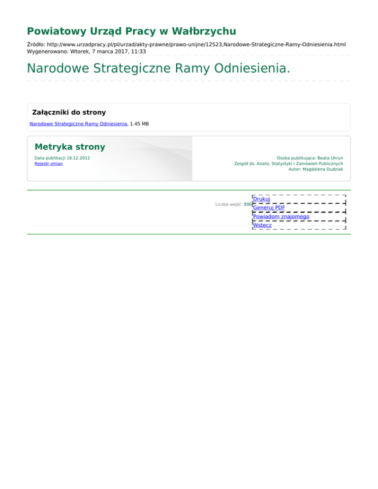 Powiatowy Urząd Pracy w Wałbrzychu Źródło: http://www.urzadpracy.pl/pl/urzad/akty-prawne/prawo-unijne/12523,Narodowe-Strategiczne-Ramy-Odniesienia.html Wygenerowano: Wtorek, 7 marca 2017, 11:33 Narodowe Strategiczne Ramy Odniesienia. Załączniki do strony Narodowe Strategiczne Ramy Odniesienia. 1.45 MB Metryka strony Data publikacji 18.12.2012 Rejestr zmian Osoba publikująca: Beata Uhryn Zespół ds. Analiz, Statystyki i Zamówień Publicznych Autor: Magdalena Dudziak Liczba wejść: 996 Drukuj Generuj PDF Powiadom znajomego Wstecz