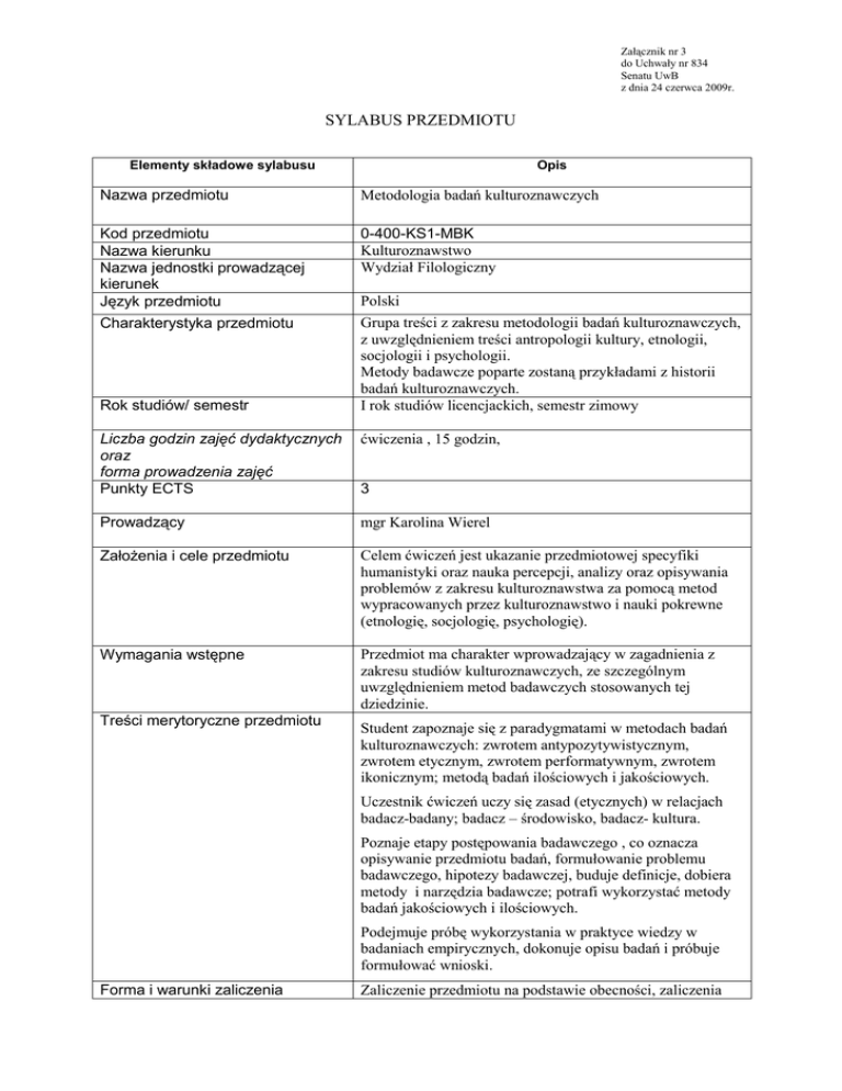 Załącznik nr 3 do Uchwały nr 834 Senatu UwB z dnia 24 czerwca 2009r. SYLABUS PRZEDMIOTU Elementy składowe sylabusu Opis Nazwa przedmiotu Metodologia badań kulturoznawczych Kod przedmiotu Nazwa kierunku Nazwa jednostki prowadzącej kierunek Język przedmiotu 0-400-KS1-MBK Kulturoznawstwo Wydział Filologiczny Charakterystyka przedmiotu Grupa treści z zakresu metodologii badań kulturoznawczych, z uwzględnieniem treści antropologii kultury, etnologii, socjologii i psychologii. Metody badawcze poparte zostaną przykładami z historii badań kulturoznawczych. I rok studiów licencjackich, semestr zimowy Rok studiów/ semestr Polski Liczba godzin zajęć dydaktycznych oraz forma prowadzenia zajęć Punkty ECTS ćwiczenia , 15 godzin, Prowadzący mgr Karolina Wierel Założenia i cele przedmiotu Celem ćwiczeń jest ukazanie przedmiotowej specyfiki humanistyki oraz nauka percepcji, analizy oraz opisywania problemów z zakresu kulturoznawstwa za pomocą metod wypracowanych przez kulturoznawstwo i nauki pokrewne (etnologię, socjologię, psychologię). Wymagania wstępne Przedmiot ma charakter wprowadzający w zagadnienia z zakresu studiów kulturoznawczych, ze szczególnym uwzględnieniem metod badawczych stosowanych tej dziedzinie. Treści merytoryczne przedmiotu 3 Student zapoznaje się z paradygmatami w metodach badań kulturoznawczych: zwrotem antypozytywistycznym, zwrotem etycznym, zwrotem performatywnym, zwrotem ikonicznym; metodą badań ilościowych i jakościowych. Uczestnik ćwiczeń uczy się zasad (etycznych) w relacjach badacz-badany; badacz – środowisko, badacz- kultura. Poznaje etapy postępowania badawczego , co oznacza opisywanie przedmiotu badań, formułowanie problemu badawczego, hipotezy badawczej, buduje definicje, dobiera metody i narzędzia badawcze; potrafi wykorzystać metody badań jakościowych i ilościowych. Podejmuje próbę wykorzystania w praktyce wiedzy w badaniach empirycznych, dokonuje opisu badań i próbuje formułować wnioski. Forma i warunki zaliczenia Zaliczenie przedmiotu na podstawie obecności, zaliczenia Załącznik nr 3 do Uchwały nr 834 Senatu UwB z dnia 24 czerwca 2009r. Przedmiotu Wykaz literatury podstawowej i uzupełniającej wykładu z Metodologii badań kulturoznawczych, aktywności oraz wykonania projektu badawczego na wybrany temat ( w grupach 2-4 osobowych). - Myśled jak antropolog, Philip Carl Salzman, Patricia C. Rice, s. GWP, Gdańsk 2009 - Ewa Nowicka, Świat człowieka – świat kultury, PWN, Warszawa 2002 - Badanie kultury. Elementy teorii antropologicznej, PWN, Warszawa 2003 - Badanie kultury. Elementy teorii antropologicznej. Kontynuacje, PWN, Warszawa 2004 - Michael Herzfeld, Antropologia, WUJ, Kraków 2004 - Amerykaoska antropologia postmodernistyczna, Instytut Kultury, Warszawa 1999 - Metody badao jakościowych, red. Norman K. Denzin, Yvonna S. Lincoln, t.I, PWN, Warszawa 2010 - Metody badao jakościowych, red. Norman K. Denzin, Yvonna S. Lincoln, t.II, PWN, Warszawa 2010 - Steinar Kvale, Prowadzenie wywiadów, PWN, Warszawa 2010 - Rosaline Barbour, Badania fokusowe, PWN, Warszawa 2010 - Uwe Flick, Jakośd w badaniach jakościowych, PWN, Warszawa 2011 - Uwe Flick, Projektowanie badania jakościowego, PWN, warszawa 2010 - Tim Rapley, Analiza konwersacji, dyskursu i dokumentów, PWM, Warszawa 2010 - Michael Angrosino, Badania etnograficzne i obserwacyjne, PWN, Warszawa 2010 - Rosaline Barbour, Badania fokusowe, PWN, Warszawa 2010 - Bartłomiej Walczak, Antropolog jako Inny, Scholar, Warszawa, 2009