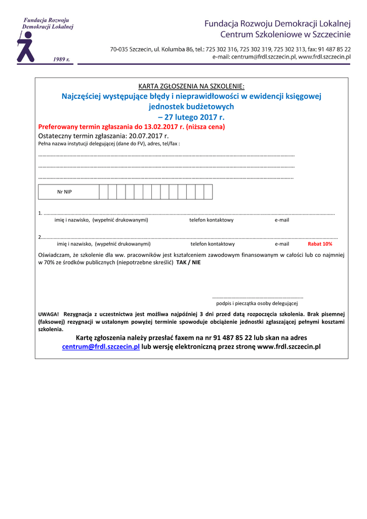 KARTA ZGŁOSZENIA NA SZKOLENIE: Najczęściej występujące błędy i nieprawidłowości w ewidencji księgowej jednostek budżetowych – 27 lutego 2017 r. Preferowany termin zgłaszania do 13.02.2017 r. (niższa cena) Ostateczny termin zgłaszania: 20.07.2017 r. Pełna nazwa instytucji delegującej (dane do FV), adres, tel/fax : ………………………………………………………………………………………………………………………………………………………………. ………………………………………………………………………………………………………………………………………………………………. ……………………………………………………………………………………………………………………………………………………………... - Nr NIP - - 1. ................................................................................................................................................................................................................ imię i nazwisko, (wypełnić drukowanymi) telefon kontaktowy e-mail 2.................................................................................................................................................................................................................... imię i nazwisko, (wypełnić drukowanymi) telefon kontaktowy e-mail Rabat 10% Oświadczam, że szkolenie dla ww. pracowników jest kształceniem zawodowym finansowanym w całości lub co najmniej w 70% ze środków publicznych (niepotrzebne skreślić) TAK / NIE ……………………….………………………………….... podpis i pieczątka osoby delegującej UWAGA! Rezygnacja z uczestnictwa jest możliwa najpóźniej 3 dni przed datą rozpoczęcia szkolenia. Brak pisemnej (faksowej) rezygnacji w ustalonym powyżej terminie spowoduje obciążenie jednostki zgłaszającej pełnymi kosztami szkolenia. Kartę zgłoszenia należy przesłać faxem na nr 91 487 85 22 lub skan na adres [email protected] lub wersję elektroniczną przez stronę www.frdl.szczecin.pl