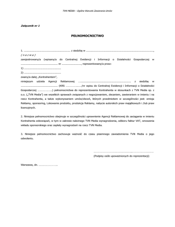 TVN MEDIA – Ogólne Warunki Zawierania Umów Załącznik nr 1 PEŁNOMOCNICTWO 1. .......................................................... z siedzibą w ...................................................................................., (nazwa) zarejestrowany/a (wpisany/a do Centralnej Ewidencji i Informacji o Działalności Gospodarczej w .............................................. nr ........................, reprezentowany/a przez: 1) .............................................. 2) .............................................. zwany/a dalej „Kontrahentem”, niniejszym udziela Agencji Reklamowej …............................................................... z siedzibą w .............................................. (KRS …………….……/nr wpisu do Centralnej Ewidencji i Informacji o Działalności Gospodarczej ………………..) pełnomocnictwa do reprezentowania Kontrahenta w stosunkach z TVN Media sp. z o.o. („TVN Media”) we wszelkich sprawach związanych z negocjowaniem, zlecaniem, zawieraniem w imieniu i na rzecz Kontrahenta, a także wykonywaniem umów/zleceń, których przedmiotem w szczególności jest: emisja Reklamy, sponsoring, Lokowanie produktu, produkcja Reklamy, nabycie autorskich praw majątkowych i /lub praw licencyjnych. 2. Niniejsze pełnomocnictwo obejmuje w szczególności uprawnienie Agencji Reklamowej do zaciągania w imieniu Kontrahenta zobowiązań, w tym w zakresie należnego TVN Media wynagrodzenia, odbioru faktur VAT, wnoszenia wkładu sponsorskiego oraz zapłaty wynagrodzeń na rzecz TVN Media. 3. Niniejsze pełnomocnictwo zachowuje ważność do czasu pisemnego zawiadomienia TVN Media o jego odwołaniu. ……………………………………………..………………………… (Podpisy osób upoważnionych do reprezentacji) Warszawa, dn. ……………………..