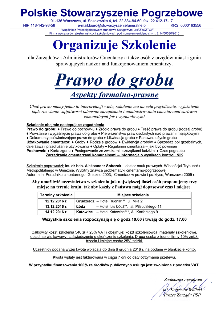 Polskie Stowarzyszenie Pogrzebowe 01-136 Warszawa, ul. Sokołowska 4, tel. 22 834-84-60, fax. 22 412-17-17 NIP 118-142-98-58 e-mail:[email protected] KRS: 0000163556 Wspólnie z Przedsiębiorstwem Handlowo Usługowym „KRZYSZTOF” Firma wpisana do rejestru instytucji szkoleniowych pod numerem ewidencyjnym: 2.14/00380/2010 Organizuje Szkolenie dla Zarządców i Administratorów Cmentarzy a także osób z urzędów miast i gmin sprawujących nadzór nad funkcjonowaniem cmentarzy. Prawo do grobu Aspekty formalno-prawne Choć prawo mamy jedno to interpretacji wiele, szkolenie ma na celu przybliżenie, wyjaśnienie bądź rozwianie wątpliwości odnośnie zarządzania i administrowania cmentarzami zarówno komunalnymi jak i wyznaniowymi Szkolenie obejmie następujące zagadnienia Prawo do grobu: ♦ Prawo do pochówku ♦ Źródło prawa do grobu ♦ Treść prawa do grobu (rodzaj grobu) ♦ Powstanie i wygaśnięcie prawa do grobu ♦ Pierwszeństwo praw osobistych nad prawami majątkowymi ♦ Dokumenty poświadczające prawo do grobu ♦ Likwidacja grobu ♦ Ponowne użycie grobu Użytkowanie cmentarza: ♦ Groby ♦ Rodzaje grobów ♦ Ewidencja grobów ♦ Sprzedaż pół grzebalnych, dzierżawa i przedłużanie użytkowania ♦ Opłaty ♦ Regulamin cmentarza – jaki być powinien Pochówek: ♦ Karta zgonu ♦ Postępowanie ze zwłokami i szczątkami ludzkimi ♦ Czas pogrzebu Zarządzanie cmentarzami komunalnymi – Informacja o wynikach kontroli NIK Szkolenie poprowadzi; ks. dr hab. Aleksander Sobczak – doktor nauk prawnych. Wiceoficjał Trybunału Metropolitalnego w Gnieźnie. Wybitny znawca problematyki cmentarno-pogrzebowej. Autor m.in. Poradnika cmentarnego, Gniezno 2003, Cmentarz w prawie i praktyce, Warszawa 2005 r. Aby umożliwić uczestnictwo w szkoleniu jak największej ilości osób proponujemy trzy miejsc na terenie kraju, tak aby każdy z Państwa mógł dopasować czas i miejsce. Terminy szkolenia 12.12.2016 r. 13.12.2016 r. 14.12.2016 r. Miejsce szkolenia Grudziądz – Hotel Rudnik***, ul. Miła 2 Łódź – Hotel Ibis Łódź**, al. Piłsudskiego 11 Katowice – Hotel Katowice***, Al. Korfantego 9 Wszystkie szkolenia rozpoczynają się o godz.10.00 i trwają do godz. 17.00 Całkowity koszt szkolenia 540 zł + 23% VAT i obejmuje; koszt szkoleniowca, materiały szkoleniowe, obiad, serwis kawowy, zaświadczenie o ukończeniu szkolenia. Druga osoba z jednej firmy 10% zniżki trzecia i kolejne osoby 25% zniżki. Uczestnicy podaną wyżej kwotę wpłacają do dnia 6 grudnia 2016 r. na podane w blankiecie konto. Kwota wpłaty jest fakturowana w ciągu 7 dni od daty otrzymania przelewu. W przypadku finansowania 100% ze środków publicznych usługa jest zwolniona z podatku VAT. Serdecznie zapraszam inż. Krzysztof Wolicki Prezes Zarządu PSP ........................................................................ Polskie Stowarzyszenie Pogrzebowe Konto: 39 1020 1013 0000 0502 0125 2386 Blankiet zgłoszenia udziału w szkoleniu Prawo do grobu .................................................................................. (proszę podać termin szkolenia i miasto) po wypełnieniu, prosimy blankiet wysłać faksem na nr 22 412 17 17 – do 6.12.2016 r. lub po zeskanowaniu wysłać na adres e-mail [email protected] Zgłaszamy udział w szkoleniu następujących osób: 1 . ........................................ 2 . . ........................................ 3 . ........................................ 4 . . ........................................ . ........................................ (Nazwa przedsiębiorstwa/ instytucji z dokładnym adresem, telefonem i numerem NIP) . ........................................ (Prezes/dyrektor, podpis, pieczątka) Szkolenie jest finansowania w 100% ze środków publicznych* * Właściwe postawić krzyżyk TAK NIE