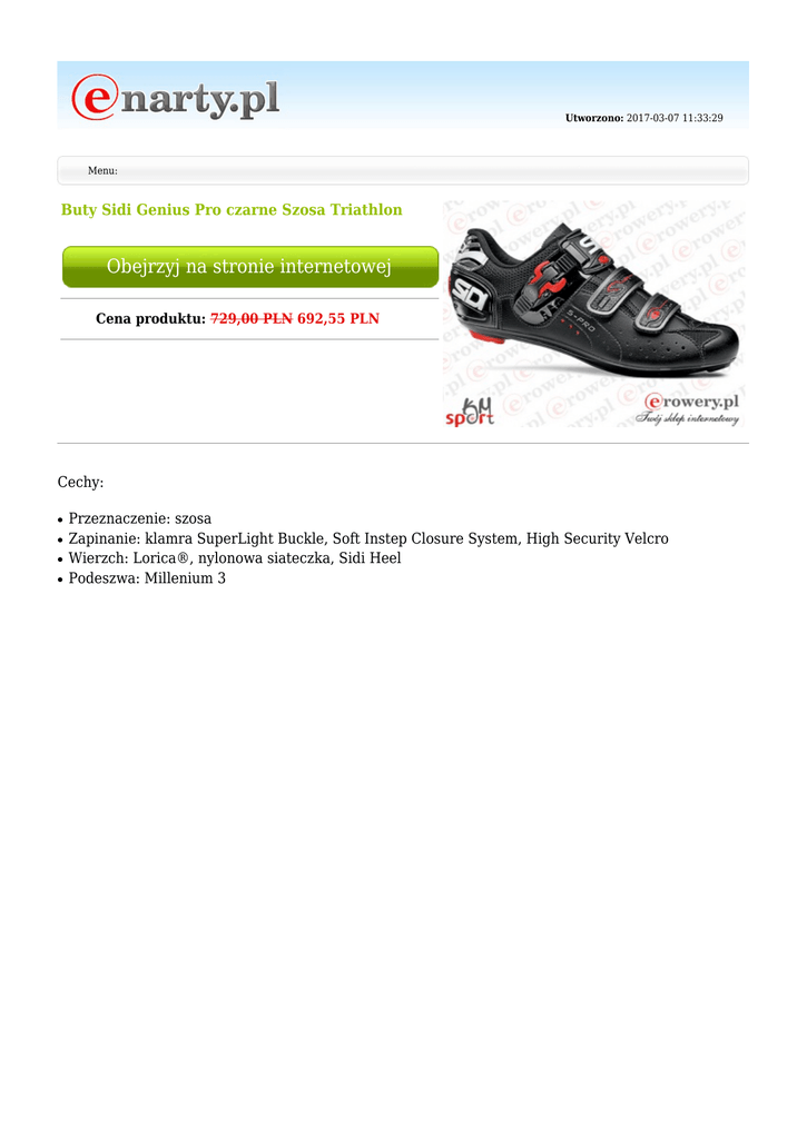 Utworzono: 2017-03-07 11:33:29 Menu: Buty Sidi Genius Pro czarne Szosa Triathlon Obejrzyj na stronie internetowej Cena produktu: 729,00 PLN 692,55 PLN Cechy: ● ● ● ● Przeznaczenie: szosa Zapinanie: klamra SuperLight Buckle, Soft Instep Closure System, High Security Velcro Wierzch: Lorica®, nylonowa siateczka, Sidi Heel Podeszwa: Millenium 3 W 1960 firma Sidi rozpoczęła działalność jako warsztat produkcji obuwia sportowo-górskiego. Od 1970 roku Sidi specjalizuje się w obuwiu kolarskim, motocyklowym i butach do jazdy terenowej. Dino Signori, założyciel Sidi, łączy w sobie pasję do jazdy z ponad 50-cio letnim doświadczeniem w produkcji innowacyjnego obuwia sportowego. Dzięki tej pasji i głębokiej,intuicyjnej wiedzy, Sidi stała się liderem na rynku rowerowych i motocyklowych butów. Tradycyjne wartości i zaangażowanie w połączeniu z wydajną, międzynarodową siecią dystrybucji sprawiają że Sidi to firma, która jest obecna na całym świecie. Ze względu na wysoką jakość, obuwie Sidi zostało wybrane przez miliony sportowców. Przez lata Sidi wypracowała sobie własną, niezawodną technikę, która pozwala na osiągnięcie maksymalnej niezawodności i komfortu. Łącząc innowacje z półwieczem doświadczeń, Sidi to czysta pasja, która sprawia że nie jest tylko zwyczajną firmą. Przeznaczenie Marka Sidi Podeszwa Adres: www.erowery.pl [email protected] Szosa Tworzywo sztuczne Adres: www.enarty.pl Telefon: 605 515 185, 34 361 16 71 Email: [email protected] Email: