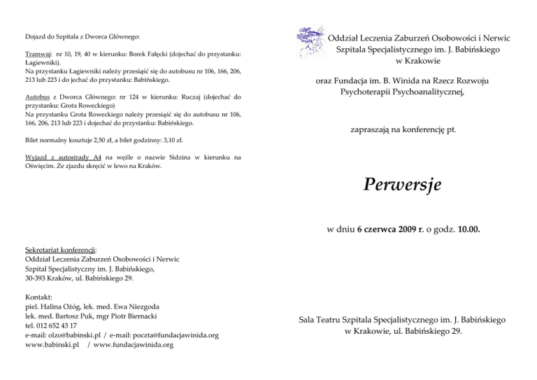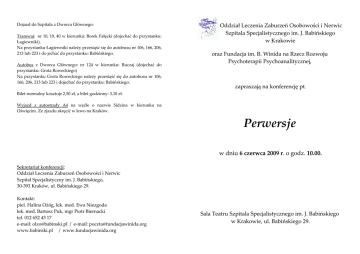 Dojazd do Szpitala z Dworca Głównego: Tramwaj: nr 10, 19, 40 w kierunku: Borek Fałęcki (dojechać do przystanku: Łagiewniki). Na przystanku Łagiewniki należy przesiąść się do autobusu nr 106, 166, 206, 213 lub 223 i do jechać do przystanku: Babińskiego. Autobus z Dworca Głównego: nr 124 w kierunku: Ruczaj (dojechać do przystanku: Grota Roweckiego) Na przystanku Grota Roweckiego należy przesiąść się do autobusu nr 106, 166, 206, 213 lub 223 i dojechać do przystanku: Babińskiego. Oddział Leczenia Zaburzeń Osobowości i Nerwic Szpitala Specjalistycznego im. J. Babińskiego w Krakowie oraz Fundacja im. B. Winida na Rzecz Rozwoju Psychoterapii Psychoanalitycznej, zapraszają na konferencję pt. Bilet normalny kosztuje 2,50 zł, a bilet godzinny: 3,10 zł. Wyjazd z autostrady A4 na węźle o nazwie Sidzina w kierunku na Oświęcim. Ze zjazdu skręcić w lewo na Kraków. Perwersje w dniu 6 czerwca 2009 r. o godz. 10.00. Sekretariat konferencji: Oddział Leczenia Zaburzeń Osobowości i Nerwic Szpital Specjalistyczny im. J. Babińskiego, 30-393 Kraków, ul. Babińskiego 29. Kontakt: piel. Halina Ożóg, lek. med. Ewa Niezgoda lek. med. Bartosz Puk, mgr Piotr Biernacki tel. 012 652 43 17 e-mail: [email protected] / e-mail: [email protected] www.babinski.pl / www.fundacjawinida.org Sala Teatru Szpitala Specjalistycznego im. J. Babińskiego w Krakowie, ul. Babińskiego 29. Dla uczestników konferencji przydzielane będą punkty edukacyjne Komisji Kształcenia Medycznego. Plan konferencji: Osoby prezentujące referaty: 9.00. – 10.00. Rejestracja 10.00. – 10.15. Otwarcie konferencji: dyrektor szpitala Marzena Grochowska i ordynator oddziału Ewa Niezgoda. Wprowadzenie: Bartosz Puk. Agnieszka Myśliwiec – Ferduła, psychoanalityk, członek Polskiego Towarzystwa Psychoanalitycznego, superwizor szkoleniowy Polskiego Towarzystwa Psychoterapii Psychoanalitycznej. 10.15. – 11.00. Agnieszka Myśliwiec – Ferduła, referat pt. Widzieć – nie widzieć. Przykłady psychicznej korupcji. Prezentacja kliniczna. Ewa Niezgoda, specjalista psychiatra, psychoterapeuta, superwizor Sekcji Naukowej Psychoterapii Polskiego Towarzystwa Psychiatrycznego; ordynator Oddziału Leczenia Zaburzeń Osobowości i Nerwic. 11.00. – 11.20. Dyskusja 11.20. – 11.40. Przerwa na kawę. Katarzyna Lenda – Woźniak, psycholog, psychoterapeuta w Oddziale Leczenia Zaburzeń Osobowości i Nerwic. 11.40. – 12.25. Ewa Niezgoda, Katarzyna Lenda – Woźniak, referat pt. Perwersje, jako choroba zakaźna w społeczności szpitala – opis przypadku. 12.25. – 12.45. Dyskusja David Morgan, psychoanalityk, psycholog kliniczny, konsultant w Portman Clinic w Londynie, członek Brytyjskiego Towarzystwa Psychoanalitycznego. 12.45. – 13.30. Lunch 13.30. – 14.15. David Morgan, referat pt. Wewnętrzna para a kompleks Edypa w rozwoju identyfikacji seksualnej oraz seksualnej perwersji. (The internal couple and the Oedipus complex in the development of sexual identity and sexual perversion.) Dyskusja. 14.15. - 14.35. 14.35. - 15.20. 15.20. - 16.00. Tomasz Fortuna, referat pt. Kiedy pojęcia wymykają się swoim znaczeniom - kilka słów o perwersji w relacji terapeutycznej. Dyskusja i zamknięcie konferencji – prowadzenie: Bartosz Puk. Tomasz Fortuna, lekarz medycyny w trakcie specjalizacji z psychiatrii, psychoterapeuta; pracuje w Hallwick Specjalistycznym Ośrodku Leczenia Zaburzeń Osobowości Szpitala św. Anny w Londynie oraz na Oddziale Młodzieżowym w klinice Tavistock. Koszt konferencji: 180 zł, dla studentów*: 150 zł. Dla wpłacających do 30 kwietnia: 150 zł, dla studentów*: 120 zł. *studenci szkół wyższych oraz osoby szkolące się w psychoterapii. Opłatę prosimy przesłać na konto: Fundacja im. B. Winida na Rzecz Rozwoju Psychoterapii Psychoanalitycznej 31-061 Kraków, ul. Mostowa 2/13. Nr konta: 92 1500 1142 1211 4005 6976 0000