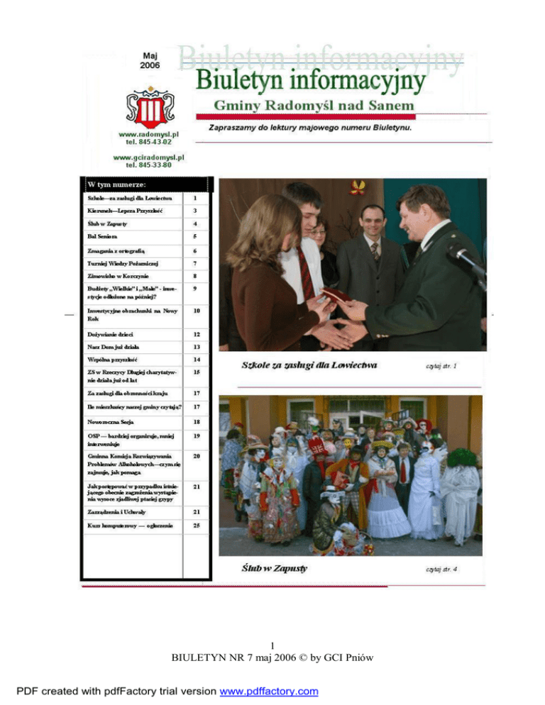1 BIULETYN NR 7 maj 2006 © by GCI Pniów PDF created with pdfFactory trial version www.pdffactory.com SZKOLE - ZA ZASŁUGI DLA ŁOWIECTWA „Wieloletnia, już drugopokoleniowa współpraca Wojskowego Koła Łowieckiego „Sęp” w Mielcu, a także Nadleśnictwa Gościeradów z Zespołem Szkół w Antoniowie została zauważona i doceniona przez naczelne władze PZŁ poprzez przyznanie przez Kapitułę Odznaczeń zaszczytnego wyróżnienia dla osób niestowarzyszonych: „Odznaką za zasługi dla Łowiectwa”. T. Połomski fot. Moment wręczenia odznaki przez Pana Jana Czuba Łowczego Okręgu Tarnobrzeg uczniom reprezentującym Zespół Szkół w Antoniowie. Należy podkreślić, że ilość zdarzeń kłusownictwa, podpaleń i innych wykroczeń przeciwko naturze, na terenie gminy, a jednocześnie na obwodzie tejże szkoły w porównaniu z latami poprzednimi w sposób zdecydowany maleje. Na terenie naszej gminy jest tych zdarzeń trzy lub czterokrotnie mniej niż w gminach sąsiednich. Uważam, że jest to skutek wyedukowania młodzieży i społeczeństwa. Tak wysokie odznaczenie zobowiązuje nas do jeszcze bardziej aktywnej ochrony ojczystej przyrody. Nadmienię, że jest to pierwsze tego typu odznaczenie na terenie byłego województwa tarnobrzeskiego i jedno z nielicznych na Podkarpaciu.” – powiedział Jan Korzybski – v-ce prezes Wojskowego Koła Łowieckiego „Sęp” w Mielcu, odpowiedzialny za współpracę ze szkołami w ramach działania koła, leśniczy Leśnictwa Antoniów i jednocześnie radny Rady Gminy w Radomyślu nad Sanem. Uroczystość z okazji wręczenia odznaczenia odbyła się w Zespole Szkół w Antoniowie 24 marca br. Odznaczenie wręczył przedstawicielom samorządu uczniowskiego Pan Józef Starzyk – prezes Wojskowego Koła Łowieckiego „Sęp”. Po wystąpieniu Prezesa Wojskowego Koła Łowieckiego „Sęp” Pana Józefa Starzyka, który wręczył odznaczenie oraz nagrodę dla szkoły w postaci mikroskopu, wystąpili Panowie: Pan Michał Perz, Pan Jan Pyrkosz, Pan Jan Parytka, Pan Marek Kułaga – odczytał list posła Władysława Stępnia oraz Pan Janusz Korzybski. Zebrani z przyjemnością obejrzeli program artystyczny w wykonaniu zespołu tanecznego „Sanowiślaczki” oraz duetu wokalnego Zespołu Szkół w Antoniowie. „Antoniów i okolice to idealne miejsce do czynnego wypoczynku na łonie natury. Ponieważ znajdujemy się w niezwykle ciekawym środowisku przyrodniczym, wśród licznych zadań realizowanych przez szkołę, jednym z naszych głównych celów jest edukacja przyrodnicza i ekologiczna zapoczątkowana w szerszym zakresie przez szkołę pod kierunkiem dyrektora szkoły Pana Stanisława Chodura, kontynuowana w latach 1992-93 przez Pana Tadeusza Stopyrę i dalej w okresie 2001-2005 przy współpracy z dyrektorem Publicznego Gimnazjum w Antoniowie Panem Dariuszem Żmudą, aż do dnia dzisiejszego. W związku z tym od kilkudziesięciu już lat współpracujemy z licznymi instytucjami wspomagającymi działalność edukacyjną szkoły, a mianowicie: Liga Obrony Przyrody, Nadleśnictwem Gościeradów, Wojskowym Kołem Łowieckim „SĘP” w Mielcu, Urzędem Gminy Radomyśl nad Sanem, Wydziałem Ochrony Środowiska w Starostwie Powiatowym w Stalowej Woli, Kołem Wędkarskim „Kotewka” w Pniowie, Zakładem Gospodarki Komunalnej w Radomyślu nad Sanem, Komendą Powiatową Straży Pożarnej w Stalowej Woli, Komenda Powiatowa Policji w Stalowej Woli, Rada Rodziców naszej szkoły, a w ostatnim czasie ze Stowarzyszeniami działającymi na naszym obszarze. Nasza szkoła podejmuje szereg działań mających na celu ochronę środowiska naturalnego naszego regionu. Celem akcji jest propagowanie wśród dzieci, młodzieży i społeczności lokalnej działań związanych z ochroną środowiska oraz podniesieniem świadomości ekologicznej mieszkańców. Tradycją naszej szkoły stało się coroczne organizowanie akcji ekologicznych, których inicjatorkami były: Pani Wiesława Kochan i Pani Anna Laskowska, wspomagane przez zaangażowane grono pedagogiczne. „Odznaczenie za zasługi dla Łowiectwa” jest dla nas bardzo miłą niespodzianką i ma charakter odznaczenia szczególnego – honorowego, które zobowiązuje nas do dalszej intensywnej pracy. Serdecznie dziękuję Zarządowi Wojskowego Koła Łowieckiego „Sęp” w Mielcu, a szczególnie prezesowi koła Panu Józefowi Starzykowi oraz v-ce prezesowi koła Panu Januszowi Korzybskiemu za współpracę, zauważenie nas i promowanie naszych działań w środowisku łowieckim. Od lat współpracujemy z Kołem Łowieckim „Sęp”, a w ostatnim czasie współpraca ta jest realizowana programowo. Według programu uczniowie naszej szkoły w okresie jesiennym wieszają karmniki i wspólnie z myśliwymi stawiają budki dla kuraków. Podczas wycieczek szkolnych organizowanych do lasu uczniowie zbierają żołędzie dla dzików. Dokonują obserwacji i 2 BIULETYN NR 7 maj 2006 © by GCI Pniów PDF created with pdfFactory trial version www.pdffactory.com sporządzają odpowiednią dokumentację. Podczas kuligów organizowanych do lasu, uczniowie wizytują „leśne stołówki”, w celu pozostawienia pożywienia dla saren, jeleni i dzików. W lesie organizowane są również spotkania z leśniczymi i myśliwymi, którzy uczą uczniów rozpoznawać tropy w lesie. W ubiegłym roku szkolnym uczestniczyliśmy w akcji „Czysty Las” pod hasłem: Tyraliera przez las, oczyszczając około 1 400 ha lasu. W dalszym ciągu chcemy zdobywać wiedzę o przyrodzie i w tym celu będziemy chcieli utworzyć ścieżkę dydaktyczną z przyrodniczymi stanowiskami obserwacyjnymi między innymi orzecha wodnego, żeremi bobra, stanowiska lęgowego łabędzia białego, ścieżki edukacyjne: „Dziesięć leśnych przykazań” itp. Naszą współpracę z instytucjami wspomagającymi edukację przyrodniczą i ekologiczną zamierzamy nie tyle kontynuować, co ją poszerzać i pogłębiać. Wszak jesteśmy częścią tego