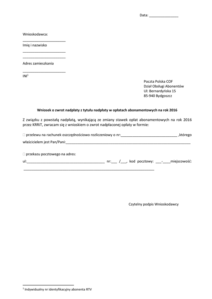 Data: _______________ Wnioskodawca: ______________________ Imię i nazwisko ______________________ ______________________ Adres zamieszkania ______________________ INI1 Poczta Polska COF Dział Obsługi Abonentów Ul: Bernardyńska 15 85-940 Bydgoszcz Wniosek o zwrot nadpłaty z tytułu nadpłaty w opłatach abonamentowych na rok 2016 Z związku z powstałą nadpłatą, wynikającą ze zmiany stawek opłat abonamentowych na rok 2016 przez KRRiT, zwracam się z wnioskiem o zwrot nadpłaconej opłaty w formie: przelewu na rachunek oszczędnościowo rozliczeniowy o nr:_____________________________ ,którego właścicielem jest Pan/Pani:________________________________________________________________ przekazu pocztowego na adres: ul:________________________________________ nr:___ /___, kod pocztowy: ___-____miejscowość: ___________________________________________________________________ Czytelny podpis Wnioskodawcy 1 Indywidualny nr identyfikacyjny abonenta RTV