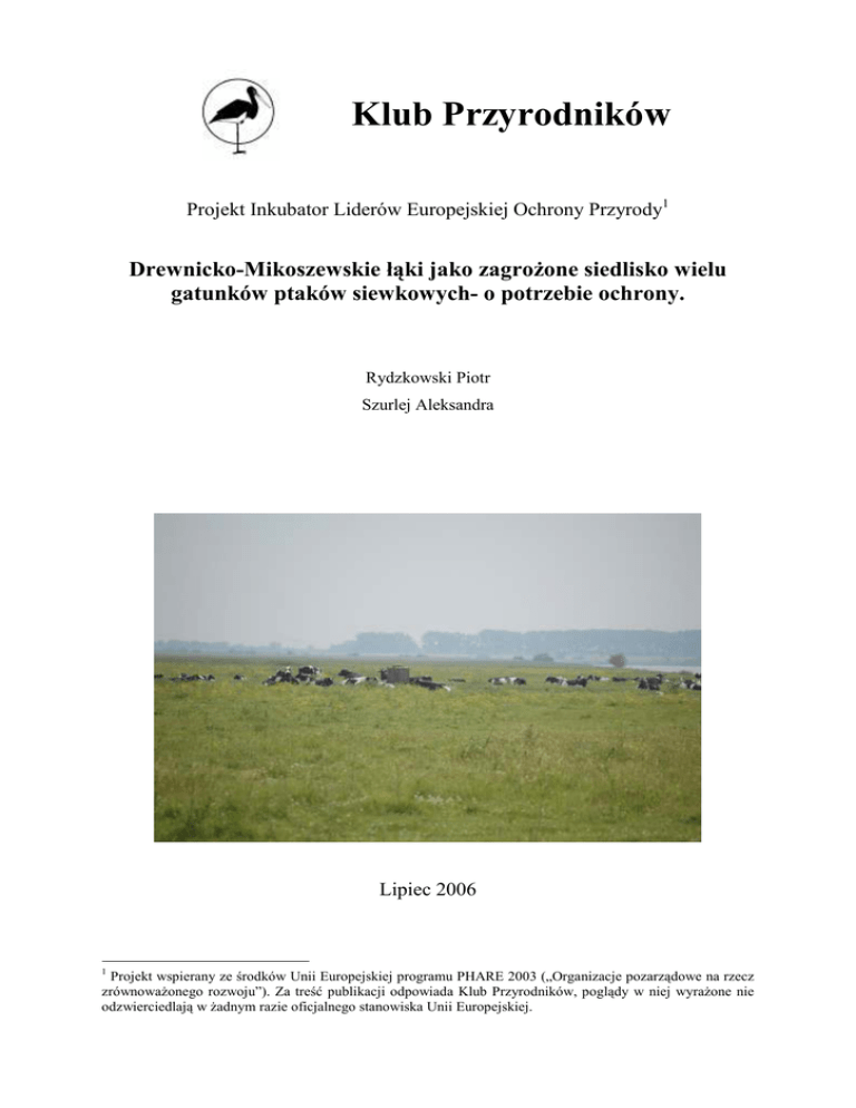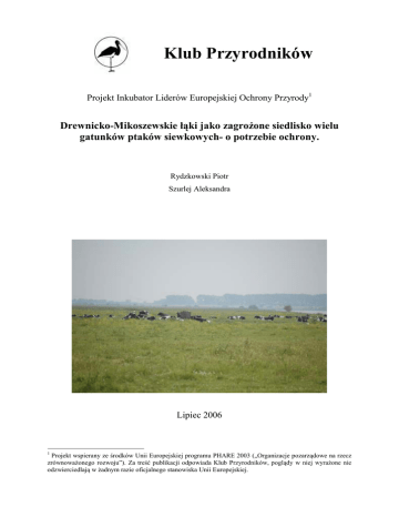 Klub Przyrodników Projekt Inkubator Liderów Europejskiej Ochrony Przyrody1 Drewnicko-Mikoszewskie łąki jako zagrożone siedlisko wielu gatunków ptaków siewkowych- o potrzebie ochrony. Rydzkowski Piotr Szurlej Aleksandra Lipiec 2006 1 Projekt wspierany ze środków Unii Europejskiej programu PHARE 2003 („Organizacje pozarządowe na rzecz zrównoważonego rozwoju”). Za treść publikacji odpowiada Klub Przyrodników, poglądy w niej wyrażone nie odzwierciedlają w żadnym razie oficjalnego stanowiska Unii Europejskiej. SPIS TREŚCI 1. Wstęp…………………………………………………………………………………. 3 2. Charakterystyka obiektu: Drewnicko-Mikoszewskie łąki……………………………. 5 2.1 Położenie obiektu……………………………………………………………………. 5 2.2. Ptaki i ich siedliska w obrębie łąk położonych między Drewnicą a Mikoszewem……………………………………………………………………………….6 2.2.1. Siedliska…………………………………………………………………………… 6 3. Ocena obiektu………………………………………………………………………… 7 3.1. Ocena zmian środowiskowych i awifauny na badanym obszarze................................ 7 4. Szczegółowe wymagania siedliskowe ptaków charakterystycznych dla łąk i pastwisk…………………………………………………………………......................9 5. Podstawowe wytyczne użytkowania łąk i pastwisk…………………………………. 12 6. Jakie podjąć działania na Łąkach Drewnicko-Mikoszewskich……………………….14 7. Wnioski końcowe…………………………………………………………………......18 8. Literatura...................................................................................................................... 20 2 WSTĘP 1. Wstęp Podmokłe łąki są istotnymi siedliskami dla wielu rodzimych gatunków roślin, ptaków, bezkręgowców, szczególnie na terenach nizinnych, gdzie biotopy pół- naturalne są nieliczne. Cechami charakterystycznymi łąk podmokłych jest: przewaga traw niskich, jako wynik regularnego użytkowania polegającego na wykaszaniu i/lub wypasie, okresowe zalewnie lub wysokie zwierciadło lokalnych wód gruntowych. Wszystkie te cechy stwarzają dogodne warunki dla gniazdowania i żerowania wielu gatunków ptaków. Takie obszary są również bardzo ważnymi „przystankami” na trasie wędrówek ptaków. Podmokłe łąki są również istotne ze względu na łagodzenie skutków powodzi, gdyż magazynują wody powodziowe, utrzymują poziom wód gruntowych zatrzymując wodę na terenie zlewni co umożliwia uzupełnianie wód gruntowych. Wysoki poziom wód gruntowych jest niejednokrotnie czynnikiem warunkującym występowanie pewnych gatunków ptaków. Większość europejskich łąk podmokłych powstała w wyniku działalności człowieka na skutek wycinania lasów, osuszania terenów bagiennych, tworzenia nowych koryt rzecznych. Tak przekształcone tereny sprzyjały tworzeniu się nowych ekosystemów. Obszary te upodobały sobie w szczególności ptaki siewkowate i blaszkodziobe. Wyróżniane są następujące typy łąk podmokłych: - nadrzeczne łąki i pastwiska zalewowe, - łąki i pastwiska zalewowe brzegów jezior, - poldery przeciwpowodziowe- ekstensywne pół-naturalne obszary sąsiadujące z rzekami, - ogroblowane od strony morza przybrzeżne wypasane bagna, - nadmorskie naturalne łąki wybrzeży. Duże znaczenie dla większości łąk ma ich użytkowanie. Sposób użytkowania decyduje o wykształcanie się danego typu łąk, co z kolei wpływa na osiedlanie się określonych gatunków ptaków. Najcenniejsze z przyrodniczego punktu widzenia łąki, to te użytkowane mniej intensywnie rolniczo. Takie łąki cechuje najwyższa różnorodność przyrodnicza. Podmokłe łąki są doskonałym siedliskiem dla lęgów, zimowania oraz migracji wielu gatunków ptaków, przede wszystkim siewkowatych i blaszkodziobych. W przypadku wielu gatunków ptaków obecność ich uzależniona jest od występowania takich właśnie obszarów. 3 Nie użytkowanie lub niewłaściwa gospodarka łąkowo-pastwiskowa jest istotnym zagrożeniem dla występujących populacji ptaków. Odtworzenie siedlisk ptaków po wcześniejszej degradacji terenu jest bardzo trudne oraz wymaga dużo czasu i nakładów pieniężnych. Istotne jest więc nie tylko podejmowanie działań renaturyzacyjnych na obszarach już zdegradowanych ale również działań prewencyjnych na terenach zagrożonych degradacją. Liczba podmokłych łąk w Europie drastycznie maleje. Wybiórczość siedliskowa wielu gatunków ptaków- szczególnie siewkowych sprawia, że nie są one w stanie dostosować się do zmian środowiska i bytować nadal w zmienionych ekosystemach. Do zmian i nowego środowiska bardzo szybko przyzwyczajają się np. mewy. Siewkowate jednak to gatunki bardzo wrażliwe, każda więc zmiana w środowisku niesie za sobą znaczne uszczuplenie ich populacji. Ktoś na pewno powie: cóż, że giną, przeżywa najsilniejszy. Pamiętać jednak należy, że odkąd człowiek zaczął ingerować w przyrodę wycinając lasy, osuszając bagna, odwracając bieg rzek, zaburzył sprawne funkcjonowanie ekosystemów kierowane przez matkę naturę. Przyroda nie może już sama regulować procesów jakie w niej zachodzą. Tak samo jak zaingerowaliśmy w naturę regulując pierwsze rzeki tak samo mamy teraz obowiązek podjąć działania na rzecz zatrzymania degradacji resztek naturalnych ekosystemów. Każdy ginący gatunek przyczynia się do zmniejszania bioróżnorodności świata przyrody który nas otacza i dzięki któremu istniejemy. Wyobraźmy sobie życie na planecie, na której istnieje tylko jeden gatunek- Homo sapiens. Nie ma i nie będzie takiej planety ponieważ niemożliwe jest życie w pojedynke. To 