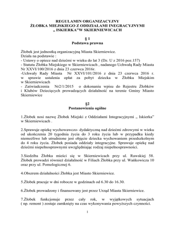 REGULAMIN ORGANIZACYJNY ŻŁOBKA MIEJSKIEGO Z ODDZIAŁAMI INEGRACYJNYMI „ ISKIERKA”W SKIERNIEWICACH §1 Podstawa prawna Żłobek jest jednostką organizacyjną Miasta Skierniewice. Działa na podstawie : - Ustawy o opiece nad dziećmi w wieku do lat 3 (Dz. U z 2016 poz.157) - Statutu Żłobka Miejskiego w Skierniewicach , nadanego Uchwałą Rady Miasta Nr XXVI/100/2016 z dnia 23 czerwca 2016r. -Uchwały Rady Miasta Nr XXVI/101/2016 z dnia 23 czerwca 2016 r. w sprawie ustalenia opłat za pobyt dziecka w Żłobku Miejskim w Skierniewicach - Zaświadczenia Nr2/1/2015 o dokonaniu wpisu do Rejestru Żłobków i Klubów Dziecięcych prowadzących działalność na terenie Gminy Miasto Skierniewice §2 Postanowienia ogólne 1.Żłobek nosi nazwę Żłobek Miejski z Oddziałami Integracyjnymi „ Iskierka” w Skierniewicach . 2.Sprawuje opiekę wychowawczo- dydaktyczną nad dziećmi zdrowymi w wieku od ukończenia 20 tygodnia życia do 3 roku życia lub w przypadku kiedy niemożliwe lub utrudnione jest objęcie dziecka wychowaniem przedszkolnym do 4 roku życia. Żłobek posiada oddziały integracyjne. Sprawuje opiekę nad dziećmi niepełnosprawnymi uwzględniając rodzaj niepełnosprawności. 3.Siedziba Żłobka mieści się w Skierniewicach przy ul. Rawskiej 58. Żłobek prowadzi również działalność w Filiach Żłobka przy ul. Wańkowicza 10 oraz przy ul. Pomologicznej 6. 4.Obszrem działalności Żłobka jest Miasto Skierniewice. 5.Żłobek pracuje w dni robocze w godzinach od 6.30 do 16.30. 6.Żłobek prowadzony i finansowany jest przez Urząd Miasta Skierniewice. 7.Żłobek funkcjonuje przez cały rok, w wyjątkowych sytuacjach ( np. remont ) zostaje zamknięty na czas wykonywania powyższych czynności. 1 §3 Cele i zadania oraz zakres udzielanych świadczeń 1.Żłobek spełnia funkcję opiekuńczą, wychowawczą i dydaktyczną. 2.Żłobek oferuje pomoc rodzicom pracującym lub uczącym się. 3.Wspomaga indywidualny rozwój dziecka. 4.Świadczy usługi opiekuńczo – wychowawcze dla dzieci niepełnosprawnych uwzględniając rodzaj niepełnosprawności. 5.W żłobku realizowany jest roczny program pracy dydaktycznowychowawczej uwzględniający rozwój psycho-motoryczny dziecka, właściwy do wieku dziecka. Program przygotowany jest przez opiekunów grup i psychologa lub pedagoga specjalnego. Zatwierdzany jest przez Dyrektora Żłobka. 6. Dziecko w żłobku ma zapewnione poszanowanie i ochronę godności osobistej i życzliwą atmosferę. 7.W czasie pobytu dziecka w żłobku dziecko ma zapewnione wyżywienie zgodnie z obowiązującymi normami żywieniowymi. Uwzględniamy żywienie dietetyczne. 8.Żłobek współpracuje z rodzicami poprzez podejmowanie wspólnych działań mających na celu wspieranie prawidłowego rozwoju dzieci. 9.Żłobek prowadzi profilaktykę zdrowotną. §4 Odpłatność 1.Pobyt dziecka jest odpłatny i składa się z dwóch elementów : - opłaty stałej dziennej - opłaty za wyżywienie w/g aktualnie obowiązującej stawki żywieniowej. Opłaty te są ustalane przez Radę Miasta Skierniewice w drodze uchwały. Opłaty należy dokonać do 15-go każdego miesiąca w formie przelewu lub wpłaty na wskazany rachunek bankowy- załącznik nr 1 do regulaminu . 2. Powyższe opłaty mogą ulec zmianie w przypadku wzrostu kosztów utrzymania dziecka w żłobku. 2 §5 Warunki naboru dzieci do Żłobka 1.Rekrutacja podstawowa odbywa się w terminie 01.03.-31.03. każdego roku . 2.Rodzic/opiekun pobiera w dostępny sposób Kartę Dziecka, którą w terminie do 31.03. składa w Sekretariacie Żłobka przy ul. Rawskiej 58. 3.Pierszeństwo naboru mają dzieci z terenu Miasta Skierniewice, w przypadku wolnych miejsc przyjmowane są dzieci z poza ternu Miasta Skierniewice. 4.Wyniki rekrutacji ogłaszane są w siedzibie Żłobka do 30.04. 5. Rekrutacja uzupełniająca odbywa się przez cały rok w miarę występowania wolnych miejsc. §6 Organizacja Żłobka 1.Dziecko jest przyprowadzane i odbierane przez rodziców lub opiekunów prawnych. W wyjątkowych sytuacjach dziecko może być odebrane przez inne osoby dorosłe upoważnione pisemnie przez rodziców, legitymujące się dowodem tożsamości. 2.Dziecko powinno być przyprowadzane do Żłobka najpóźniej do godziny 8.30. 3. Praca w Żłobku oparta jest o Ramowy Rozkład Dnia: 6.30-8.30 Przyjmowanie dzieci 8.30-9.00 Śniadanie I – mleczne 9.00-9.20 Nocnikowanie, toaleta 9.30-9.50 Śniadanie II 10.00-11.15 Zajęcia tematyczne ( zabawy dowolne, zajęcia dydaktyczne, ruchowe, muzyczno- rytmiczne, plastyczne, konstrukcyjno- manualne), zajęcia prowadzone są zgodnie z planem zajęć przygotowanym przez opiekunów grup 11.15-11.30 Przygotowanie do obiadu, toaleta 11.30-12.00 Obiad - I danie, II danie 12.00-12.15 Przygotowanie do snu ( nocnikowanie, toaleta, przebieranie dzieci) 12.15- 14.15 Leżakowanie 14.15-14.30 Nocnikowanie, toaleta 14.30-15.00 Podwieczorek 15.00-16.30 Zajęcia dowolne 3 4.Do Żłobka nie mogą uczęszczać dzieci chore. 5.Rodzic/ opiekun ma obowiązek poinformować opiekuna o przewlekłych problemach zdrowotnych dziecka, alergiach i wskazaniach żywieniowych. W razie potrzeby dostarcza artykuły żywnościowe niezbędne do zapewnienia dziecku żywienia dietetycznego. 6.Rodzic/ opiekun wyraża zgodę pisemną na udzielanie pomocy medycznej lub przewiezienie dziecka do placówki medycznej w przypadku zagrożenia życia lub zdrowia dziecka. 7.Dyrektor ma prawo do skreślenia dziecka listy uczęszczających w przypadku: - zalegania z opłatami ponad miesiąc, - nie przestrzegania regulaminu porządkowego żłobka. 8.Rodzice mogą wypisać dziecko ze Żłobka po uprzednim powiadomieniu o rezygnacji, jednak z 30 dniowym okresem poprzedzającym. 9. Po wydaniu dziecka przez opiekuna , za bezpieczeństwo dziecka odpowiada rodzic. 10.Personel Żłobka nie ponosi odpowiedzialności za prywatne zabawki i przedmioty przyniesione przez dzieci do placówki. §7 Postanowienia końcowe 1.Za organizacje pracy Żłobka o