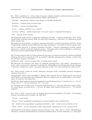 SAR 2016/2017 Laboratorium 5 - Diagnostyka modelu regresji liniowej 5.1 Zbiór airpollution.txt zawiera dane dotycza̧ce zwia̧zku pomiȩdzy zanieczyszczeniem powietrza i śmiertelnościa̧ w 60 miastach amerykańskich. Miȩdzy zmiennymi sa̧: Mortality - skorygowana wiekiem liczba zgonów na 100 000 mieszkańców, Education - mediana liczby lat kształcenia, NonWhite - procent tej podpopulacji, income - mediana zarobków w tys. dolarów, JanTemp, JulTemp - średnie temperatury w styczniu i lipcu (w stopniach Fahrenheita), NOx - stȩżenie tlenku azotanu. (a) Dopasować model liniowy ze zmienna̧ objaśniana̧ Mortality i zmienna̧ objaśniaja̧ca̧ NOx. Podać współczynnik nachylenia prostej MNK oraz jego bła̧d standardowy. Sprawdzić, czy dopasowany model dobrze opisuje dane. (b) Dopasować model liniowy ze zmienna̧ objaśniana̧ Mortality i zmienna̧ objaśniaja̧ca̧ log(NOx). Podać współczynnik nachylenia prostej MNK oraz jego bła̧d standardowy. Czy model ten dobrze opisuje dane? (c) W modelu liniowym ze zmienna̧ objaśniana̧ Mortality i zmienna̧ objaśniaja̧ca̧ log(NOx) znaleźć obserwacje o dużych rezyduach studentyzowanych. Sporza̧dzić nowy model pomijaja̧c te obserwacje. Porównać wartości współczynnika R2 dla tych dwóch modeli. 5.2 W zbiorze danych phila.txt zebrano informacje dotycza̧ce cen domów położonych w okolicach Filadelfii (zmienna HousePrice) i innych ich cech, na przykład wskaźnika przestȩpczości w okolicy, w której dom jest położony (zmienna CrimeRate). (a) Wczytać zbiór i zwrócić uwagȩ na fakt, że brakuje czȩści danych. (b) Interesuje nas zależność ceny domu od wskaźnika przestȩpczości w jego okolicy. Sporza̧dzić stosowny wykres rozproszenia i dopasować model liniowy. Zidentyfikować potencjalna̧ obserwacjȩ odstaja̧ca̧ i wpływowa̧. Usuna̧ć ja̧ ze zbioru i ponownie dopasować model. Czy nowy model dobrze opisuje dane? 5.3 Zbiór danych cellular.txt zawiera informacje dotycza̧ce liczby czytelników pewnego czasopisma (zmienna Subscribers). (a) Sporza̧dzić wykres liczby czytelników w funkcji czasu (zmienna Period). Dopasować do tych danych model liniowy i przeprowadzić jego diagnostykȩ. Zwrócić uwagȩ na fakt, że współczynnik β1 jest istotny, mimo, że model jest źle dopasowany. (b) Wybrać model najlepszy spośród nastȩpuja̧cych modeli alternatywnych: log(Subscribers) ∼ P eriod, (Subscribers)1/2 ∼ P eriod, (Subscribers)1/4 ∼ P eriod. (c) Używaja̧c metody Boxa-Coxa, wyznaczyć przekształcenie gλ (·) zmiennej Subscribers daja̧ce najlepszy model liniowy gλ (Subscribers) ∼ P eriod. W jakim sensie model gλ (Subscribers) ∼ P eriod jest najlepszy? 5.4 Dane w pliku savings.txt dotyczą sytuacji ekonomicznej mieszkańców 50 krajów. Poszczególne kolumny zawierają wartości średnie z lat 1960-1970: Country - nazwa kraju, Savings - łączne oszczędności przypadające na osobę podzielone przez dochód netto, dpi - dochód netto przypadający na jednego mieszkańca, ddpi - tempo wzrostu dochodu (w %), Pop15 , Pop75 - procent obywateli w wieku, odpowiednio, mniejszym niż 15 lat i powyżej 75 lat. (a) Dopasować model liniowy opisujący zależność Savings od dpi , ddpi , Pop15 i Pop75 . Zidentyfikować obserwacje o dużych studentyzowanych rezyduach modyfikowanych i dużych wpływach (hii ). Sporządzić diagram Cooke’a. Usunąć z modelu obserwację o największej odległości Cooke’a. Sprawdzić, że jest ona wpływowa. (b) Dlaczego dpi nie jest istotne w modelu dopasowanym w punkcie (a)? Sporządzić częściowe wykresy regresji dla zmiennych dpi i ddpi i zinterpretować je. (c) Obliczyć współczynnik korelacji dla zmiennych Pop15 i Pop75. Porównać go ze współczynnikiem korelacji dla estymatorów βP op15 i βP op75 . Jak możemy wytłumaczyć zaobserwowane zjawisko? (d) Sporządzić wykres częściowych rezyduów dla zmiennej Pop15. Jaką dodatkową relację w danych możemy zauważyć na tym wykresie?