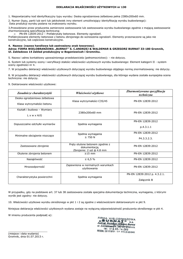 DEKLARACJA WŁAŚCIWOŚCI UŻYTKOWYCH nr 130 1. Niepowtarzalny kod identyfikacyjny typu wyrobu: Deska ogrodzeniowa żelbetowa pełna 2380x200x60 mm. 2. Numer (typu, partii lub serii lub jakikolwiek inny element umożliwiający identyfikację wyrobu budowlanego): Data produkcji wyrobu podana na znakowaniu wyrobu. 3.Przewidziane przez producenta zamierzone zastosowanie lub zastosowania wyrobu budowlanego zgodnie z mającą zastosowanie zharmonizowaną specyfikacją techniczną: • PN-EN 12839:2012 – Prefabrykaty betonowe. Elementy ogrodzeń. Prefabrykowane elementy betonowe z betonu zbrojonego do wznoszenia ogrodzeń. Elementy przeznaczone są jako nie konstrukcyjne, lub częściowo konstrukcyjne. 4. Nazwa: (nazwa handlowa lub zastrzeżony znak towarowy). Adres: FIRMA WIELOBRANŻOWA „BURNAT” S. C.ANDRZEJ & WALDEMAR & GRZEGORZ BURNAT 33-180 Gromnik, Ul. Zakładowa 14 Zakład produkcyjny w Bogoniowicah i Gromniku. 5. Nazwa i adres kontaktowy upoważnionego przedstawiciela (pełnomocnictwo): - nie dotyczy. 6. System lub systemy oceny i weryfikacji stałości właściwości użytkowych wyrobu budowlanego: Element kategorii II - system oceny zgodności nr 4. 7. W przypadku deklaracji właściwości użytkowych dotyczącej wyrobu budowlanego objętego normą znormalizowaną: nie dotyczy. 8. W przypadku deklaracji właściwości użytkowych dotyczącej wyrobu budowlanego, dla którego wydana została europejska ocena techniczna: nie dotyczy. 9. Deklarowane właściwości użytkowe: Zasadnicze charakterystyki Właściwości użytkowe Zharmonizowana specyfikacja techniczna Klasa wytrzymałości C35/45 PN-EN 12839:2012 2380x200x60 mm PN-EN 12839:2012 Deska ogrodzeniowa żelbetowa Klasa wytrzymałości betonu Kształt i budowa – Wymiary L x w x H/G PN-EN 12839:2012 Dopuszczalne odchyłki wymiarów Spełnia wymagania p.4.3.1.1 Minimalne obciążenie niszczące Spełnia wymagania ≥ 750 N PN-EN 12839:2012 P4.3.3.2.3. Otulenie zbrojenia betonem Pręty otulone betonem zgodnie z dokumentacją Zbrojenie: 2 szt ф 4.8 mm ≥15 mm Nasiąkliwość ≤ 6,5 % PN-EN 12839:2012 Mrozoodporność Zapewniona w normalnych warunkach użytkowania PN-EN 12839:2012 Charakterystyka powierzchni Spełnia wymagania Zastosowane zbrojenie PN-EN 12839:2012 PN-EN 12839:2012 PN-EN 12839:2012 p. 4.3.2.1. Załącznik B W przypadku, gdy na podstawie art. 37 lub 38 zastosowana została specjalna dokumentacja techniczna, wymagania, z którymi wyrób jest zgodny: nie dotyczy. 10. Właściwości użytkowe wyrobu określonego w pkt 1 i 2 są zgodne z właściwościami deklarowanymi w pkt 9. Niniejsza deklaracja właściwości użytkowych wydana zostaje na wyłączną odpowiedzialność producenta określonego w pkt 4. W imieniu producenta podpisał(-a): ________________________ (nazwisko i stanowisko) _________________________ (miejsce i data wydania) Gromnik, dnia 01.07.2013 r.