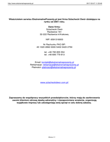 http://www.ekstremalneprezenty.pl 2017-03-07 11:33:46 Właścicielem serwisu EkstremalnePrezenty.pl jest firma Szlachecki Dwór działająca na rynku od 2001 roku. Dane firmy: Szlachecki Dwór Racławice 161 32-222 Racławice k/Krakowa, NIP: 6591318003 Nr Rachunku PKO BP: 45 1020 2892 0000 5402 0420 2750 tel. +48 795 855 554 tel. +48 606 779 813 Email: [email protected] Reklamacje: [email protected] Płatności: [email protected] www.szlacheckidwor.com.pl/ Zapraszamy do współpracy wszystkich przedsiębiorców, którzy mają do zaoferowania swoim klientom zdrową dawkę adrenaliny i niezapomniane wrażenia, organizują wyjątkowe imprezy lub udostępniają swój sprzęt w celu dobrej zabawy. Strona 1/1