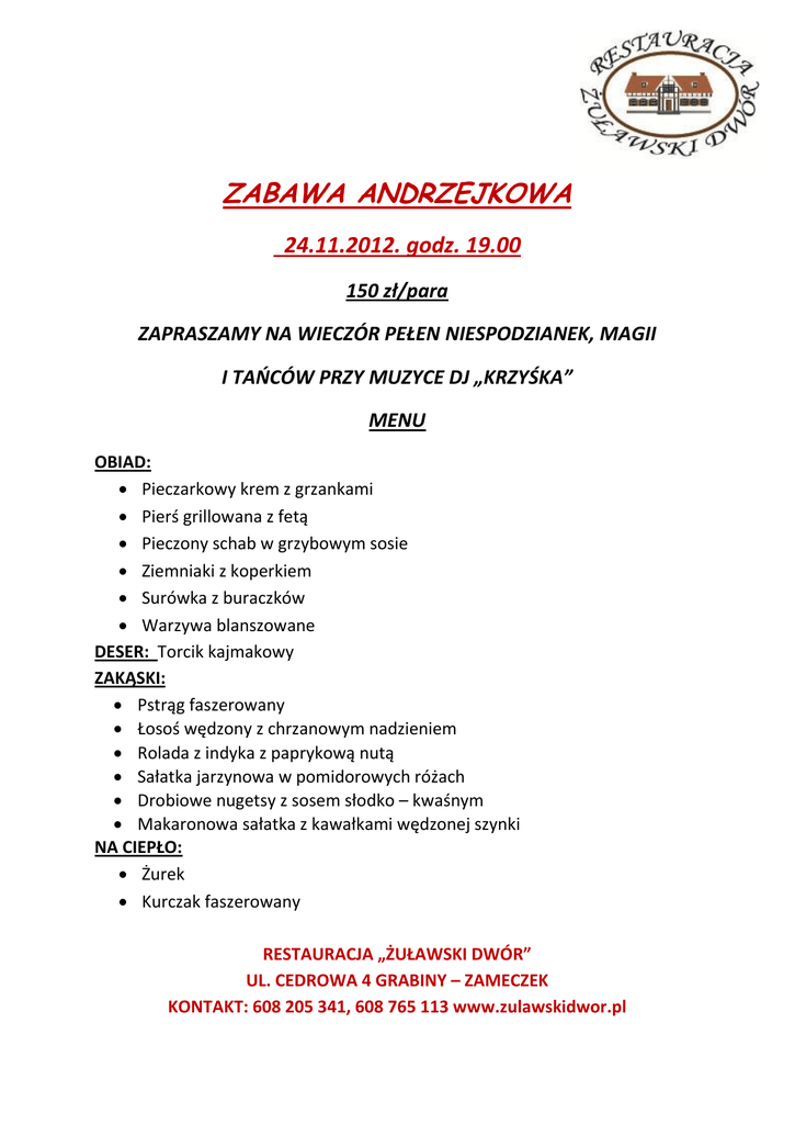 ZABAWA ANDRZEJKOWA 24.11.2012. godz. 19.00 150 zł/para ZAPRASZAMY NA WIECZÓR PEŁEN NIESPODZIANEK, MAGII I TAŃCÓW PRZY MUZYCE DJ „KRZYŚKA” MENU OBIAD: Pieczarkowy krem z grzankami Pierś grillowana z fetą Pieczony schab w grzybowym sosie Ziemniaki z koperkiem Surówka z buraczków Warzywa blanszowane DESER: Torcik kajmakowy ZAKĄSKI: Pstrąg faszerowany Łosoś wędzony z chrzanowym nadzieniem Rolada z indyka z paprykową nutą Sałatka jarzynowa w pomidorowych różach Drobiowe nugetsy z sosem słodko – kwaśnym Makaronowa sałatka z kawałkami wędzonej szynki NA CIEPŁO: Żurek Kurczak faszerowany RESTAURACJA „ŻUŁAWSKI DWÓR” UL. CEDROWA 4 GRABINY – ZAMECZEK KONTAKT: 608 205 341, 608 765 113 www.zulawskidwor.pl