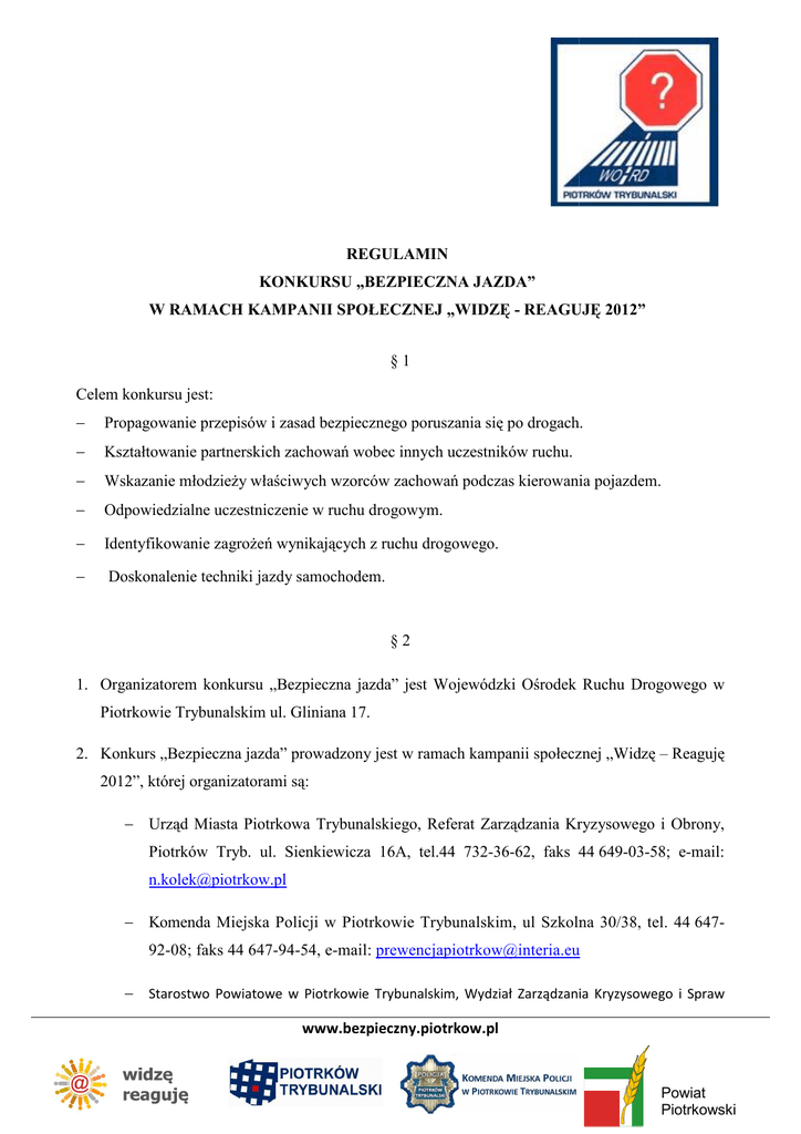 REGULAMIN KONKURSU „BEZPIECZNA JAZDA” W RAMACH KAMPANII SPOŁECZNEJ „WIDZĘ - REAGUJĘ REAGUJ 2012” §1 Celem konkursu jest: − Propagowanie anie przepisów i zasad bezpiecznego poruszania się si po drogach. − Kształtowanie partnerskich zachowań zachowa wobec innych uczestników ruchu. − Wskazanie młodzieŜy właściwych ściwych wzorców zachowań zachowa podczas kierowania pojazdem. − Odpowiedzialne uczestniczenie w ruchu drogowym. − Identyfikowanie zagroŜeńń wynikających wynikaj z ruchu drogowego. − Doskonalenie techniki jazdy samochodem. §2 1. Organizatorem konkursu „Bezpieczna „Be jazda” jest Wojewódzki Ośrodek rodek Ruchu Drogowego w Piotrkowie Trybunalskim ul. Gliniana 17. 2. Konkurs „Bezpieczna jazda” prowadzony jest w ramach kampanii społecznej „Widzę „Widz – Reaguję 2012”, której organizatorami są: są − Urządd Miasta Piotrkowa Trybunalskiego, Referat Zarządzania Zarz dzania Kryzysowego i Obrony, Piotrków Tryb. ul. Sienkiewicza 16A, tel.44 732-36-62, 62, faks 44 649-03-58; e-mail: [email protected] − Komenda Miejska Policji w Piotrkowie Piotrkowie Trybunalskim, ul Szkolna 30/38, tel. 44 64792-08; faks 44 647-94 94-54, e-mail: [email protected] − Starostwo Powiatowe w Piotrkowie Trybunalskim, Wydział Zarządzania Kryzysowego i Spraw www.bezpieczny.piotrkow.pl Powiat Piotrkowski Społecznych, Piotrków ów Tryb. ul. Sienkiewicza 16A, tel. t 44 732-78-20, 20, faks 44 732-78-21 e-mail: [email protected] piotrkowski.pl §3 1. Konkurss „Bezpieczna jazda” organizowany organi jest dla szkół ponadgimnazjalnych z Piotrkowa Trybunalskiego i powiatu piotrkowskiego. 2. KaŜda da ze szkół ma prawo wystawić wystawi jedną reprezentację składającąą się z dwóch uczniów. Reprezentacja przystąpi pi do konkursu wraz z opiekunem. 3. Warunkiem koniecznym uczestnictwa jest posiadanie przez kaŜdego ka dego z reprezentantów reprezent szkoły prawa jazdy kat. B, które naleŜy naleŜ okazać przed przystąpieniem pieniem do konkursu. §4 4. Konkurs rozpocznie się w dniu 2 czerwca 2012 roku o godz. 12.00 w Piotrkowie Tryb. ul. Gliniana 17 i odbywać sięę będzie bę na terenie Wojewódzkiego Ośrodka Ruchu Drogowego w Piotrkowie Trybunalskim. 5. Zgłoszenia do konkursu naleŜy naleŜ przedkładać w terminie do 30 maja 2012 roku pisemnie w Komendzie Miejskiej Policji w Piotrkowie Tryb. lub faksem na nr 44 647-94-54. 647 Zgłoszenie powinno zawierać imiona i nazwiska uczniów reprezentujących reprezen cych szkołę, szkoł imię i nazwisko opiekuna oraz wskazanie nazwy i adresu szkoły, którą któr osoby będą reprezentowały. Zgłoszenie musi być podpisane przez dyrektora szkoły bądź b osobę przez niego upowaŜnioną. upowaŜ 6. Fakt zgłoszenia jest równoznaczny z przyjęciem przyj i zaakceptowaniem niniejszego Regulaminu. 7. Regulamin konkursu będzie dzie dostępny dost pny na stronie internetowej kampanii społecznej „Widzę „Widz – Reaguje 2012” / www.bezpieczny.piotrkow.pl / 8. Uczestnicy konkursu, pozostaj ostający pod opieką nauczyciela – opiekuna, muszą m posiadać waŜną legitymację szkolną. 9. Nad przebiegiem konkursu czuwać czuwa będzie Komisja Konkursowa. 10. Organizator zastrzega sobie prawo zmiany terminów przyjętych przyj tych w Regulaminie. 11. Sprawy nieuregulowane niniejszym regulaminem rozstrzyga Komisja Konkursowa. §5 1. Szkoła przystępująca ca do konkursu zobowiązuje zobowi się do zapoznania członków zespołu z niniejszym regulaminem. 2. Konkurs „Bezpieczna jazda” składać składa się będzie z następujących cych konkurencji: • testu teoretycznego z zakresu obejmującego cego prawo o ruchu drogowym. www.bezpieczny.piotrkow.pl Powiat Piotrkowski • testu Stewarta – praktyczny test polegający cy na doskonaleniu techniki jazdy samochodem. 3. Z zasadami przebiegu konkursu i przydzielania punktów za poszczególne konkurencje uczestnicy zostaną zapoznani bezpośrednio średnio przed rozpoczęciem ro rywalizacji. §6 1. Organizator przyzna nagrody rzeczowe dla uczniów reprezentujących reprezentujących szkoły, za zajęcie zaj miejsca I, II i III. 2. Fundatorem nagród dla zwycięskich zwyci skich zespołów konkursu „Bezpieczna jazda” jest Wojewódzki Ośrodek rodek Ruchu Drogowego w Piotrkowie Piotrk Trybunalskim. 3. Ogłoszenie wyników konkursu i wręczenie wr nagród laureatom nastąpi pi w dniu 2 czerwca 2012 roku. §7 POSTANOWIENIA KOŃCOWE minu obowiązują obowi organizatorów i uczestników konkurs onkursu. 1. Postanowienia regulaminu 2. Wszelkie zmianyy regulaminu moŜe mo wprowadzać jedynie edynie Organizator informując informuj o nich wszystkich uczestników. 3. Komisje konkursową powoła organizator w dniu konkursu. 4. Decyzje Komisji Konkursowej są s ostateczne. 5. Sprawy nieuregulowane niniejszym regulaminem rozstrzyga Komisja Konkursowa. www.bezpieczny.piotrkow.pl Powiat Piotrkowski