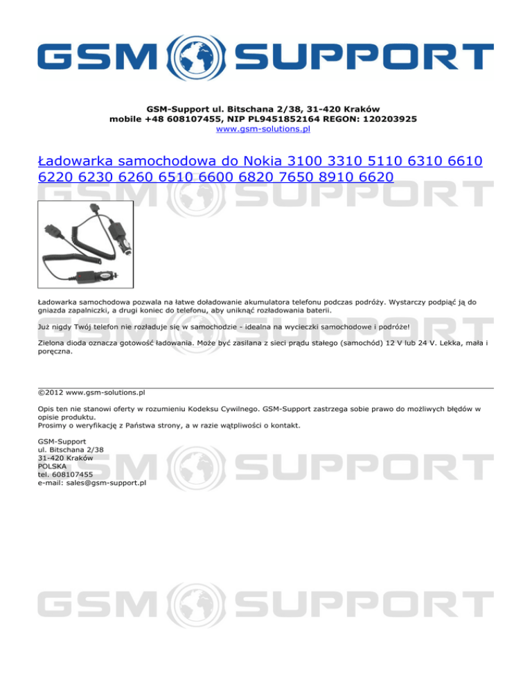 GSM-Support ul. Bitschana 2/38, 31-420 Kraków mobile +48 608107455, NIP PL9451852164 REGON: 120203925 www.gsm-solutions.pl Ładowarka samochodowa do Nokia 3100 3310 5110 6310 6610 6220 6230 6260 6510 6600 6820 7650 8910 6620 Ładowarka samochodowa pozwala na łatwe doładowanie akumulatora telefonu podczas podróży. Wystarczy podpiąć ją do gniazda zapalniczki, a drugi koniec do telefonu, aby uniknąć rozładowania baterii. Już nigdy Twój telefon nie rozładuje się w samochodzie - idealna na wycieczki samochodowe i podróże! Zielona dioda oznacza gotowość ładowania. Może być zasilana z sieci prądu stałego (samochód) 12 V lub 24 V. Lekka, mała i poręczna. ©2012 www.gsm-solutions.pl Opis ten nie stanowi oferty w rozumieniu Kodeksu Cywilnego. GSM-Support zastrzega sobie prawo do możliwych błędów w opisie produktu. Prosimy o weryfikację z Państwa strony, a w razie wątpliwości o kontakt. GSM-Support ul. Bitschana 2/38 31-420 Kraków POLSKA tel. 608107455 e-mail: [email protected] Powered by TCPDF (www.tcpdf.org)