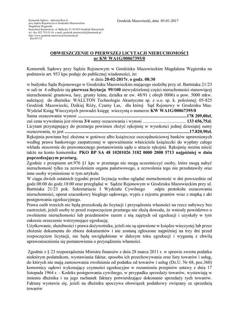Komornik Sądowy (dawniej Rew.I) przy Sądzie Rejonowym w Grodzisku Mazowieckim Magdalena Węgierska Kancelaria Komornicza ul. Bałtycka 33, 05-825 Grodzisk Mazowiecki tel. /fax: 022 755-51-16 e-mail: [email protected] http://www.grodzisk.mazowiecki.komornik.pl/ Km 857/13 Grodzisk Mazowiecki, dnia 05-01-2017 OBWIESZCZENIE O PIERWSZEJ LICYTACJI NIERUCHOMOŚCI nr KW WA1G/00067395/0 Komornik Sądowy przy Sądzie Rejonowym w Grodzisku Mazowieckim Magdalena Węgierska na podstawie art. 953 kpc podaje do publicznej wiadomości, że: w dniu 20-02-2017r. o godz. 08:30 w budynku Sądu Rejonowego w Grodzisku Mazowieckim mającego siedzibę przy ul. Bartniaka 21/23 w sali nr 4 odbędzie się pierwsza licytacja 99/100 niewydzielonej części nieruchomości stanowiącej nieruchomość gruntowa, lasy, grunty leśne, działka nr ew. 48/91 ( obręb 0006) o pow. 5000 mkw. należącej do dłużnika: WALLTON Technologie Akustyczne sp. z o.o. sp. k. położonej: 05-825 Grodzisk Mazowiecki, Dzikiej Róży, Czarny Las, dla której Sąd Rejonowy w Grodzisku Maz. Wydział Ksiąg Wieczystych prowadzi księgę wieczystą o numerze KW WA1G/00067395/0 Suma oszacowania wynosi ................................................................................................178 209,00zł, zaś cena wywołania jest równa 3/4 sumy oszacowania i wynosi ...................................... 133 656,75zł. Licytant przystępujący do przetargu powinien złożyć rękojmię w wysokości jednej dziesiątej sumy oszacowania, to jest ..............................................................................................................17.820,90zł. Rękojmia powinna być złożona w gotówce albo książeczce oszczędnościowej banków uprawnionych według prawa bankowego zaopatrzonej w upoważnienie właściciela książeczki do wypłaty całego wkładu stosownie do prawomocnego postanowienia sądu o utracie rękojmi. Rękojmię można uiścić także na konto komornika: PKO BP SA 48 10201026 3182 0000 2008 5713 najpóźniej w dniu poprzedzającym przetarg. Zgodnie z przepisem art.976 §1 kpc w przetargu nie mogą uczestniczyć osoby, które mogą nabyć nieruchomość tylko za zezwoleniem organu państwowego, a zezwolenia tego nie przedstawiły oraz inne osoby wymienione w tym artykule. W ciągu dwóch ostatnich tygodni przed licytacją wolno oglądać nieruchomość w dni powszednie od godz.08:00 do godz.18:00 oraz przeglądać w Sądzie Rejonowym w Grodzisku Mazowieckim przy ul. Bartniaka 21/23 pok. Sekretariacie I Wydziału Cywilnego odpis protokołu oszacowania nieruchomości, operat szacunkowy biegłego sądowego, wypis z rejestru gruntów wraz z mapką z akt postępowania egzekucyjnego. Prawa osób trzecich nie będą przeszkodą do licytacji i przysądzenia własności na rzecz nabywcy bez zastrzeżeń, jeżeli osoby te przed rozpoczęciem przetargu nie złożą dowodu, że wniosły powództwo o zwolnienie nieruchomości lub przedmiotów razem z nią zajętych od egzekucji i uzyskały w tym zakresie orzeczenie wstrzymujące egzekucję. Użytkowanie, służebności i prawa dożywotnika, jeżeli nie są ujawnione w księdze wieczystej lub przez złożenie dokumentu do zbioru dokumentów i nie zostaną zgłoszone najpóźniej na trzy dni przed rozpoczęciem licytacji, nie będą uwzględnione w dalszym toku egzekucji i wygasną z chwilą uprawomocnienia się postanowienia o przysądzeniu własności. Zgodnie z § 23 rozporządzenia Ministra finansów z dnia 28 marca 2011 r. w sprawie zwrotu podatku niektórym podatnikom, wystawiania faktur, sposobu ich przechowywania oraz listy towarów i usług, do których nie mają zastosowania zwolnienia od podatku od towarów i usług (Dz.U. Nr 68, poz.360) komornicy sądowi wykonujący czynności egzekucyjne w rozumieniu przepisów ustawy z dnia 17 listopada 1964 r. - Kodeks postępowania cywilnego, w przypadku sprzedaży towarów, wystawiają w imieniu dłużnika i na jego rachunek faktury potwierdzające dokonanie sprzedaży tych towarów. Fakturę wystawia się, jeżeli na dłużniku spoczywa obowiązek podatkowy związany ze sprzedażą towarów Asesor komorniczy Komornik Sądowy Tomasz Marciniec Magdalena Węgierska Przyjęcia interesantów pn 12:00-17:00, pt 9:00-15:00 Kasa czynna pn 9:00-17:00, wt-pt 8:15-16:15 Pouczenie: Zgodnie z art. 767 § 1, 2 kpc na czynności komornika przysługuje skarga do w Grodzisku Mazowieckim Wydział I Cywilny Sądu Rejonowego w Grodzisku Mazowieckim. Skargę wnosi się do sądu w terminie tygodniowym od daty czynności, gdy strona była przy niej obecna lub była o jej terminie zawiadomiona, w innych wypadkach - od daty zawiadomienia strony o dokonaniu czynności, w braku zawiadomienia - od daty dowiedzenia się o niej. Zażalenie na postanowienie sądu przysługuje w wypadkach w ustawie wskazanych.