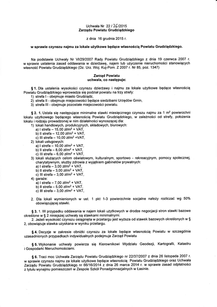 Uchwała Nr 22lł6tzols Zarządu Powiatu Grudziądzkiego z dnia 16 grudnia 2015 r, w sprawie czynszu najmu za Iokale użytkowe będące własnościąPowiatu Grudziądzkiego. Na podstawie Uchwały Nr Vl/29l2007 Rady Powiatu Grudziądzkiego z dnia 19 czerwca 2007 r. w dzieżawę, najem lub użyczenie nieruchomości stanowiących własnośćPowiatu Grudziądzkiego (Dz. Urz. Woj. Kuj-Pom. Z2007 r. Nr 85, poz.1347) w sprawie ustalenia zasad oddawania Zaząd Powiatu uchwala, co następuje: §1, Dla ustalenia wysokości czynszu dzieżawy i najmu za lokale użytkowe będące własnością Powiatu Grudziądzkiego wprowadza się podział powiatu nalrzy strefy: 1) strefa l- obejmuje miasto Grudziądz, 2) strefa ll - obejmuje miejscowości będące siedzibami Uzędów Gmin, 3) strefa lll - obejmuje pozostałe miejscowości powiatu. za 1 m2 powierzchni od strefy, położenia w zależności lokalu uzytkowego będącego własnościąPowiatu Grudziądzkiego, § 2. 1. Ustala się następujące minimalne stawki miesięcznego czynszu najmu lokalu i rodzaju prowadzonej w nim działalnościwynoszącej dla: 1) lokali handlowych, produkcyjnych, składowych, biurowych: a) l strefa - 15,00 złlmz +YAT, b) ll strefa - '12,00 złlm2 +YNT, c) lll strefa - 10,00 złlm2 +YAT, 2) lokali usługowych: a) l strefa - 10,00 złlmz +VAT, b) ll strefa - 8,00 złlmz +VAT, c) lll strefa - 6,00 złlm2 + VAT, 3) lokali służących celom oświatowym, kulturalnym, sportowo - rekreacyjnym, pomocy społecznej, charytatywnym, służbyzdrowia z wyjątkiem gabinetów prywatnych: a) l strefa - 3,00 złlmz + YAT, b) ll strefa - 3,00 złlm2 +YAT, c) lll strefa - 3,00 złlmz +VAr, 4) garaże: a) l strefa - 7,00 złlmz + VAT, b) ll strefa - 5,00 złlm2 + VAT, c) lll strefa - 3,00 złlm2 +VAT, 2. Dla lokali wymienionych obowiązującej stawki. w ust, 1 pkt '1-3 powiezchnie socjalne należy rozliczać wg 50% § 3. 1 W przypadku oddawania w najem lokali uzytkowych w drodze negocjacji stron stawki bazowe określone w § 2 niniejszej uchwah7 są stawkami minimalnymi. 2. Jeżeli wysokośćczynszu osiągnięta w przetargu jest wyższa od stawek bazowych określonych w § 2, obowiązuje stawka uzyskana w wyniku przetargu. § 4. uzasad n Decyzje w zakresie obnizki czynszu szczególnie i § 5. Wykonanie uchwały powierza i za lokale będące własnościąPowiatu w ionych przypadkach ndywid ualnych podejm uje Zaząd Powiatu Gospodarki Nieruchomościami. się Kierownikowi Wydziału Geodezji, Kartografii, Katastru 2007 r. § 6. Traci moc UchwałaZaządu Powiatu Grudziądzkiego nr 2213712007 z dnia 26 listopada w sprawie czynszu najmu za lokale użytkowe będące własnościąPowiatu Grudziądzkiego oraz Uchwała Zarządu Powiatu GrudziądzkiegQ nr 66t16l2}14 z dnia 26 marca 2014 r. w sprawie zasad odpłatnoŚci z tytułu wynajmu pomieszczeń w Zespole Szkół Ponadgimnazjalnych w Łasinie. i § 7. Uchwała wchodzi w życie z dniem podjęcia, z mocą obowiązującą od dnia 1 stycznia 2O16 podlega ogłoszeniu na tablicy ogłoszeń w Starostwie Powiatowym w Grudziądzu. Zarząd Powiatu: Wl M du r.