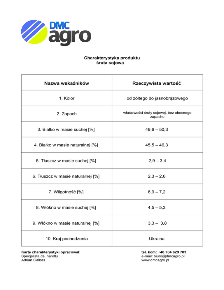 Charakterystyka produktu śruta sojowa Nazwa wskaźników Rzeczywista wartość 1. Kolor od żółtego do jasnobrązowego 2. Zapach właściwości śruty sojowej, bez obecnego zapachu 3. Białko w masie suchej [%] 49,6 – 50,3 4. Białko w masie naturalnej [%] 45,5 – 46,3 5. Tłuszcz w masie suchej [%] 2,9 – 3,4 6. Tłuszcz w masie naturalnej [%] 2,3 – 2,6 7. Wilgotność [%] 6,9 – 7,2 8. Włókno w masie suchej [%] 4,5 – 5,3 9. Włókno w masie naturalnej [%] 3,3 – 3,8 10. Kraj pochodzenia Ukraina Kartę charakterystyki opracował: Specjalista ds. handlu Adrian Galbas tel. kom: +48 784 629 703 e-mail: [email protected] www.dmcagro.pl