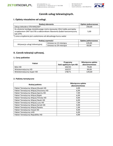 ZETO-RZESZÓW Sp. z o.o. 35-326 Rzeszów, ul. Rejtana 55, tel. 17 282 5000 [email protected], zetomedia.pl NIP: 813-03-35-772 KRS: 0000119555 Kapitał zakładowy: 1 282 400,00 PLN Cennik usług telewizyjnych. I. Opłaty niezależne od usługi. Rodzaj zdarzenia Zakup dekodera STB MAG250* Za ułożenie każdego dodatkowego metra (powyżej 10m) kabla pomiędzy urządzeniem ONT lub STB a odbiornikiem Abonenta (kabel koncentryczny lub UTP) *) cena urządzenia jest uzależniona od aktualnego kursu walut Rodzaj czynności Umowa na 12 miesięcy Aktywacja usługi telewizyjnej Umowa na 24 miesiące Opłata jednorazowa 250,00 5,00 Opłata jednorazowa 129,00 69,00 II. Cennik telewizji cyfrowej. 1. Ceny pakietów Pakiet Mini HD Wielotematyczny HD Wielotematyczny Super HD Programy Ilość ogólna/w tym HD 102/33 163/57 178/71 Miesięczna opłata abonamentowa 79,00 99,00 129,00 2. Pakiety tematyczne Rodzaj pakietu Pakiet Tematyczny Więcej Muzyki HD Pakiet Tematyczny Więcej Discovery HD Pakiet Tematyczny Więcej Sportu HD Pakiet Tematyczny Więcej Bajek Pakiet Tematyczny Więcej Filmów HD Pakiet Tematyczny Więcej Nauki HD Pakiet Tematyczny Więcej Luzu HD Pakiet Tematyczny Więcej Seriali HD Pakiet Tematyczny Więcej Świata Pakiet Tematyczny Viasat HD Pakiet Tematyczny nHD Pakiet Tematyczny Republika HD Miesięczna opłata abonamentowa 4,99 6,99 7,99 6,99 9,99 6,99 7,99 9,99 1,99 9,99 6,99 4,99 NIP: 813-03-35-772 KRS: 0000119555 Kapitał zakładowy: 1 282 400,00 PLN ZETO-RZESZÓW Sp. z o.o. 35-326 Rzeszów, ul. Rejtana 55, tel. 17 282 5000 [email protected], zetomedia.pl 2. Pakiety premium Rodzaj pakietu Pakiet CANAL+ Premium Select Pakiet CANAL+ Premium Prestige Pakiet Premium Cinemax HD Pakiet Premium Cinemax HD dla abonentów Pakietu Premium HBO Pakiet Premium Filmbox HD Pakiet Premium HBO HD Pakiet Premium HBO HD+OD+GO 62,99 68,99 14,99 Promocja – umowa na 12 miesięcy – miesięczna opłata abonamentowa 44,90 49,90 4,99 10,00 --- 14,99 29,99 36,99 --24,90 29,90 Miesięczna opłata abonamentowa 4. Usługi VOD Subskrypcyjne Rodzaj pakietu Pakiet iKaraoke – archiwum – umowa bezterminowa Miesięczna opłata abonamentowa 19,99 5. Dodatkowe usługi Rodzaj usługi Usługa Multiroom Usługa JAMBOX Online Dzierżawa dekodera * *dotyczy umowy terminowej Miesięczna opłata abonamentowa 10,00 3,00 10,00 W prezencie pakiet premium Filmbox HD Dla nowych i przedłużających umowę abonentów. Przez cały okres umowy terminowej. Pakiety tematyczne, Pakiety premium, Usługi VOD Subskrypcyjne, Usługa JAMBOX Online, dostępne są przy wyborze Pakietu Wielotematyczny HD oraz Wielotematyczny Super HD. Wszystkie ceny są cenami brutto.