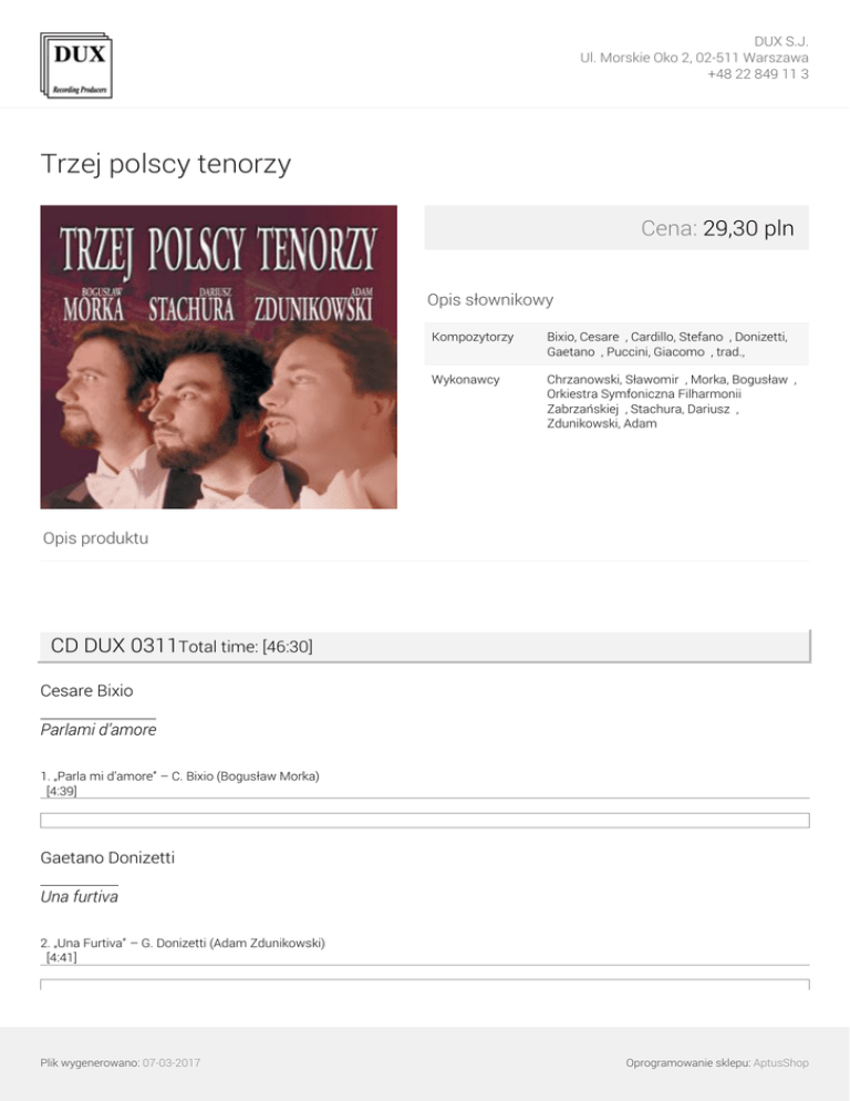 DUX S.J. Ul. Morskie Oko 2, 02-511 Warszawa +48 22 849 11 3 Trzej polscy tenorzy Cena: 29,30 pln Opis słownikowy Kompozytorzy Bixio, Cesare ∎, Cardillo, Stefano ∎, Donizetti, Gaetano ∎, Puccini, Giacomo ∎, trad., ∎ Wykonawcy Chrzanowski, Sławomir ∎, Morka, Bogusław ∎, Orkiestra Symfoniczna Filharmonii Zabrzańskiej ∎, Stachura, Dariusz ∎, Zdunikowski, Adam ∎ Opis produktu CD DUX 0311Total time: [46:30] Cesare Bixio Parlami d’amore 1. „Parla mi d’amore” – C. Bixio (Bogusław Morka) [4:39] Gaetano Donizetti Una furtiva 2. „Una Furtiva” – G. Donizetti (Adam Zdunikowski) [4:41] Plik wygenerowano: 07-03-2017 Oprogramowanie sklepu: AptusShop DUX S.J. Ul. Morskie Oko 2, 02-511 Warszawa +48 22 849 11 3 Gaetano Donizetti Córka półku 3. „Córka pułku” – G. Donizetti (Dariusz Stachura) [3:53] trad. Wiązanka piosenek Jana Kiepury 4. Wiązanka piosenek Jana Kiepury – opr. B. Szulia (Bogusław Morka, Dariusz Stachura, Adam Zdunikowski) [10:45] Giacomo Puccini Aria Kalafa: Nessun dorma 5. „Nessum dorma” – G. Puccini (Dariusz Stachura) [3:23] Stefano Cardillo Core n’grato 6. „Core n’grato” – S. Cardillo ( Adam Zdunikowski) [3:23] Giacomo Puccini Aria Cavaradossiego: E’lucevan le stelle 7. „Aria Cavaradossiego” – G. Puccini (Bogusław Morka) [3:12] Plik wygenerowano: 07-03-2017 Oprogramowanie sklepu: AptusShop DUX S.J. Ul. Morskie Oko 2, 02-511 Warszawa +48 22 849 11 3 trad. Wiązanka pieśni neapolitańskich 8. Wiązanka pieśni neapolitańskich – opr. W. Świderski (Bogusław Morka, Dariusz Stachura, Adam Zdunikowski) [12:35] Wykonawcy: Orkiestra Symfoniczna Filharmonii Zabrzańskiej Adam Zdunikowski /tenor/ Bogusław Morka /tenor/ Dariusz Stachura /tenor/ Sławomir Chrzanowski /dyrygent/ Plik wygenerowano: 07-03-2017 Powered by TCPDF (www.tcpdf.org) Oprogramowanie sklepu: AptusShop