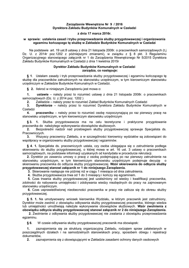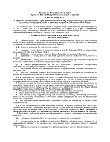 Zarządzenie Wewnętrzne Nr 9 / 2016 Dyrektora Zakładu Budynków Komunalnych w Czeladzi z dnia 17 marca 2016r. w sprawie: ustalenia zasad i trybu przeprowadzania służby przygotowawczej i organizowania egzaminu kończącego tę służbę w Zakładzie Budynków Komunalnych w Czeladzi Na podstawie art. 19 ust.8 ustawy z dnia 21 listopada 2008r. o pracownikach samorządowych (t.j Dz. U. z 2014r poz.1202 z późniejszymi zmianami), w związku z § 8 pkt. 3 Regulaminu Organizacyjnego stanowiącego załącznik nr 1 do Zarządzenia Wewnętrznego Nr 5/2015 Dyrektora Zakładu Budynków Komunalnych w Czeladzi z dnia 1 kwietnia 2015r Dyrektor Zakładu Budynków Komunalnych w Czeladzi zarządza, co następuje: § 1. Ustalam zasady i tryb przeprowadzania służby przygotowawczej i egzaminu kończącego tę służbę dla pracowników zatrudnionych na stanowisku urzędniczym, w tym kierowniczym stanowisku urzędniczym w Zakładzie Budynków Komunalnych w Czeladzi. § 2. Ilekroć w niniejszym Zarządzeniu jest mowa o: 1. ustawie – należy przez to rozumieć ustawę z dnia 21 listopada 2008r. o pracownikach samorządowych (Dz. U. z 2014 poz. 1202 ) 2. Zakładzie – należy przez to rozumieć Zakład Budynków Komunalnych Czeladzi 3. Dyrektorze – należy przez to rozumieć Dyrektora Zakładu Budynków Komunalnych w Czeladzi 4. pracowniku – należy przez to rozumieć osobę rozpoczynającą po raz pierwszy pracę na stanowisku urzędniczym, w tym kierowniczym stanowisku urzędniczym § 3. 1. Służba przygotowawcza ma na celu teoretyczne i praktyczne przygotowanie pracownika do należytego wykonywania obowiązków służbowych. 2. Bezpośredni nadzór nad przebiegiem służby przygotowawczej sprawuje Specjalista ds. Pracowniczych. 3. Wszyscy pracownicy Zakładu, a w szczególności kierownicy wydziałów są zobowiązani do współpracy w organizowaniu służby przygotowawczej i egzaminów. § 4. 1. Specjalista ds. pracowniczych ustala, czy osoba ubiegająca się o zatrudnienie podlega skierowaniu do służby przygotowawczej, o której mowa w art. 16 ust. 3 ustawy o pracownikach samorządowych, na podstawie informacji uzyskanych od kandydata w procedurze rekrutacji. 2. Dyrektor po zawarciu umowy o pracę z osobą podejmującą po raz pierwszy zatrudnienie na stanowisku urzędniczym, w tym kierowniczym stanowisku urzędniczym podejmuje decyzję o skierowaniu pracownika do odbycia służby przygotowawczej. Wzór skierowania do odbycia służby przygotowawczej stanowi załącznik nr 1 do niniejszego Zarządzenia. 3. Skierowanie następuje nie później niż w ciągu 1 miesiąca od dnia zatrudnienia. 4. Służba przygotowawcza trwa od 1 do 3 miesięcy i kończy się egzaminem. 5. Czas trwania służby przygotowawczej jest uzależniony od wiedzy i kwalifikacji pracownika, zdolności do nabywania umiejętności i zdobywania wiedzy niezbędnych do pracy na zajmowanym stanowisku urzędniczym. 6. Czas usprawiedliwionej nieobecności pracownika w pracy nie zalicza się do okresu służby przygotowawczej. § 5. 1. Na umotywowany wniosek kierownika Wydziału, w którym pracownik jest zatrudniony, Dyrektor może zwolnić z obowiązku odbywania służby przygotowawczej pracownika, którego wiedza lub umiejętności umożliwiają należyte wykonywanie obowiązków służbowych. Wzór zwolnienia z obowiązku odbycia służby przygotowawczej stanowi załącznik nr 2 do niniejszego Zarządzenia. 2. Zwolnienie z odbywania służby przygotowawczej nie zwalania z obowiązku przeprowadzenia egzaminu. § 6. W czasie odbywania służby przygotowawczej pracownik ma obowiązek: 1. zaznajomienia się ze strukturą organizacyjną Zakładu, rodzajem spraw załatwianych w poszczególnych działach i na samodzielnych stanowiskach pracy, sposobem obiegu i rejestracji dokumentów, 2. zaznajomienia się z obowiązującymi w Zakładzie zasadami ochrony danych osobowych 3. zaznajomienie się z zasadami gospodarki finansowej, w tym opisywania dokumentów finansowych oraz obiegu dokumentacji finansowo-księgowej, 4. poznania zasad obsługi interesantów, 5. zaznajomienie się z aktami normatywnymi regulującymi pracę w Zakładzie, a w szczególności: 1) ustawą o pracownikach samorządowych, 2) podstawowymi zagadnieniami z ustawy Prawo zamówień publicznych 3) podstawowymi zagadnieniami z ustawy o ochronie danych osobowych, 4) podstawowymi zagadnieniami z ustawy o finansach publicznych, 5) instrukcją kancelaryjną dla organów gminy 6) statutem Zakładu 7) regulaminem organizacyjnym 8) regulaminem pracy 9) regulaminem udzielania zamówień publicznych, których wartość nie przekracza kwoty 30 000 EUR 6. szczegółowego zaznajomienia się z przepisami prawa dotyczącymi spraw załatwianych na stanowisku pracy oraz na stanowiskach pracy, dla których pracownik będzie pełnił zastępstwo, 7. szczegółowego poznania rodzaju spraw załatwianych na zajmowanym stanowisku pracy oraz prowadzenia niezbędnej dokumentacji, 8. nabycia umiejętności przygotowywania dokumentacji na zajmowanym stanowisku pracy. § 7. 1. Podczas służby przygotowawczej pracownik zapoznaje się z podstawowymi obowiązkami na zajmowanym stanowisku pracy, z podstawowymi czynnościami innych wydziałów, w szczególności pod kątem współpracy z wydziałem, w którym pracownik jest zatrudniony. 2. Bezpośredni przełożony ustala dla pracownika plan służby przygotowawczej. Plan służby przygotowawczej wraz z opiniami o przebiegu służby określa załącznik nr 3 do niniejszego Zarządzenia.. § 8 1. Egzamin odbywa się w terminie ustalonym w planie służby przygotowawczej, powinien on przypadać od 7 do 10 dni po zakończeniu służby przygotowawczej. 2. Egzamin przeprowadza Komisja Egzaminacyjna powołana Zarządzeniem Wewnętrznym Dyrektora. § 9 1. Egzamin składa się z części pisemnej oraz części praktycznej. 2. Komisja opracowuje pytania i zadania, ustala maksymalną liczbę punktów za każde pytanie i zadanie, ustala czas trwania egzaminu, l