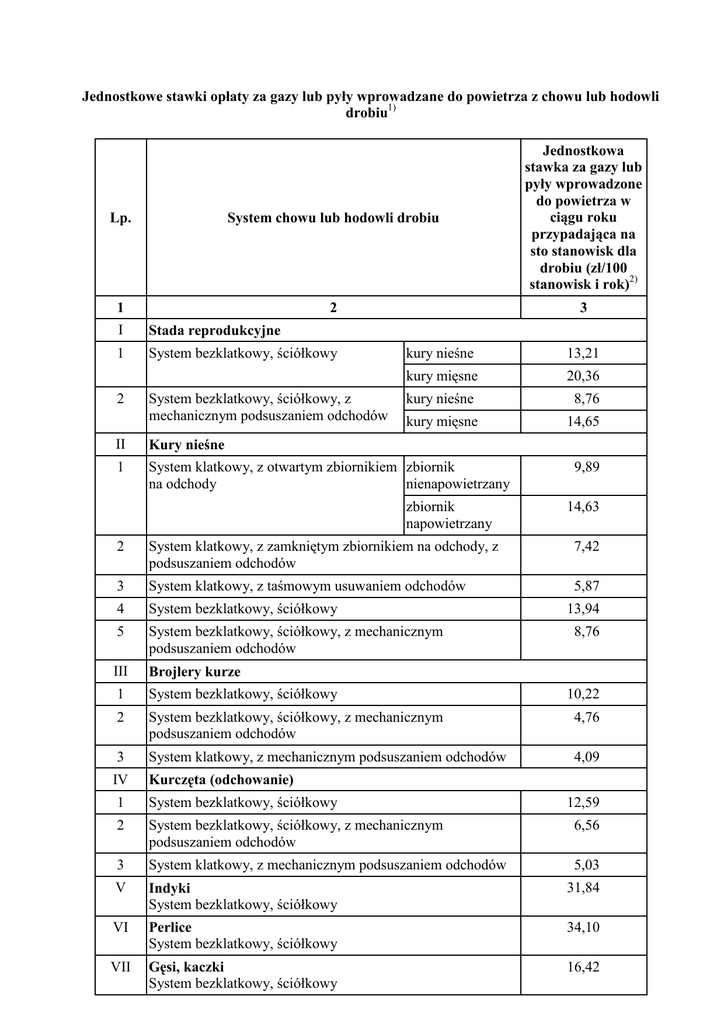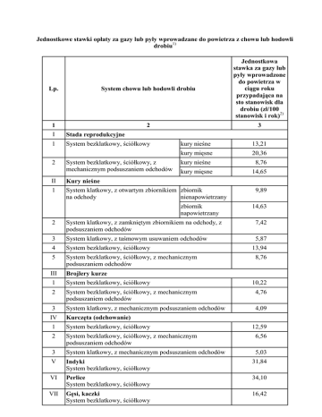 Jednostkowe stawki opłaty za gazy lub pyły wprowadzane do powietrza z chowu lub hodowli drobiu1) Lp. System chowu lub hodowli drobiu Jednostkowa stawka za gazy lub pyły wprowadzone do powietrza w ciągu roku przypadająca na sto stanowisk dla drobiu (zł/100 stanowisk i rok)2) 1 2 3 I Stada reprodukcyjne 1 System bezklatkowy, ściółkowy 2 System bezklatkowy, ściółkowy, z mechanicznym podsuszaniem odchodów kury nieśne 13,21 kury mięsne 20,36 kury nieśne 8,76 kury mięsne 14,65 II Kury nieśne 1 System klatkowy, z otwartym zbiornikiem zbiornik na odchody nienapowietrzany zbiornik napowietrzany 9,89 14,63 2 System klatkowy, z zamkniętym zbiornikiem na odchody, z podsuszaniem odchodów 7,42 3 System klatkowy, z taśmowym usuwaniem odchodów 5,87 4 System bezklatkowy, ściółkowy 5 System bezklatkowy, ściółkowy, z mechanicznym podsuszaniem odchodów III Brojlery kurze 1 System bezklatkowy, ściółkowy 2 System bezklatkowy, ściółkowy, z mechanicznym podsuszaniem odchodów 4,76 3 System klatkowy, z mechanicznym podsuszaniem odchodów 4,09 IV Kurczęta (odchowanie) 1 System bezklatkowy, ściółkowy 2 System bezklatkowy, ściółkowy, z mechanicznym podsuszaniem odchodów 6,56 3 System klatkowy, z mechanicznym podsuszaniem odchodów 5,03 V Indyki System bezklatkowy, ściółkowy 31,84 VI Perlice System bezklatkowy, ściółkowy 34,10 VII Gęsi, kaczki System bezklatkowy, ściółkowy 16,42 13,94 8,76 10,22 12,59 Objaśnienia: 1) Łączna stawka opłaty za gazy lub pyły wprowadzane do powietrza obejmujące: amoniak, pył, siarkowodór (występujący pod pozycją „Kwasy nieorganiczne, ich sole i bezwodniki”), wymienione w tabeli A, obliczona według jednostkowych stawek w niej określonych. 2) Stanowisko odpowiada miejscu przeznaczonemu dla jednej sztuki drobiu w pomieszczeniu inwentarskim; jednostkowa stawka dotyczy faktycznej obsady ptaków i faktycznego czasu utrzymywania drobiu. Uwaga: Opłatę za wprowadzanie gazów lub pyłów do powietrza oblicza się według wzoru: O = q x k x t x 10-4, w którym: O – oznacza opłatę za gazy lub pyły wprowadzone do powietrza z chowu lub hodowli drobiu, q – oznacza jednostkową stawkę opłaty określoną w tabeli E, k – oznacza liczbę stanowisk w budynku inwentarskim faktycznie wykorzystaną w procesie produkcyjnym, t – oznacza faktyczny czas utrzymywania drobiu wyraŜony jako procentowa część roku, 10-4 – oznacza mnoŜnik uwzględniający to, Ŝe jednostkowa stawka opłaty określona w tabeli E odniesiona jest do 100 stanowisk dla drobiu, a czas utrzymywania drobiu wyraŜony jest jako procentowa część roku.