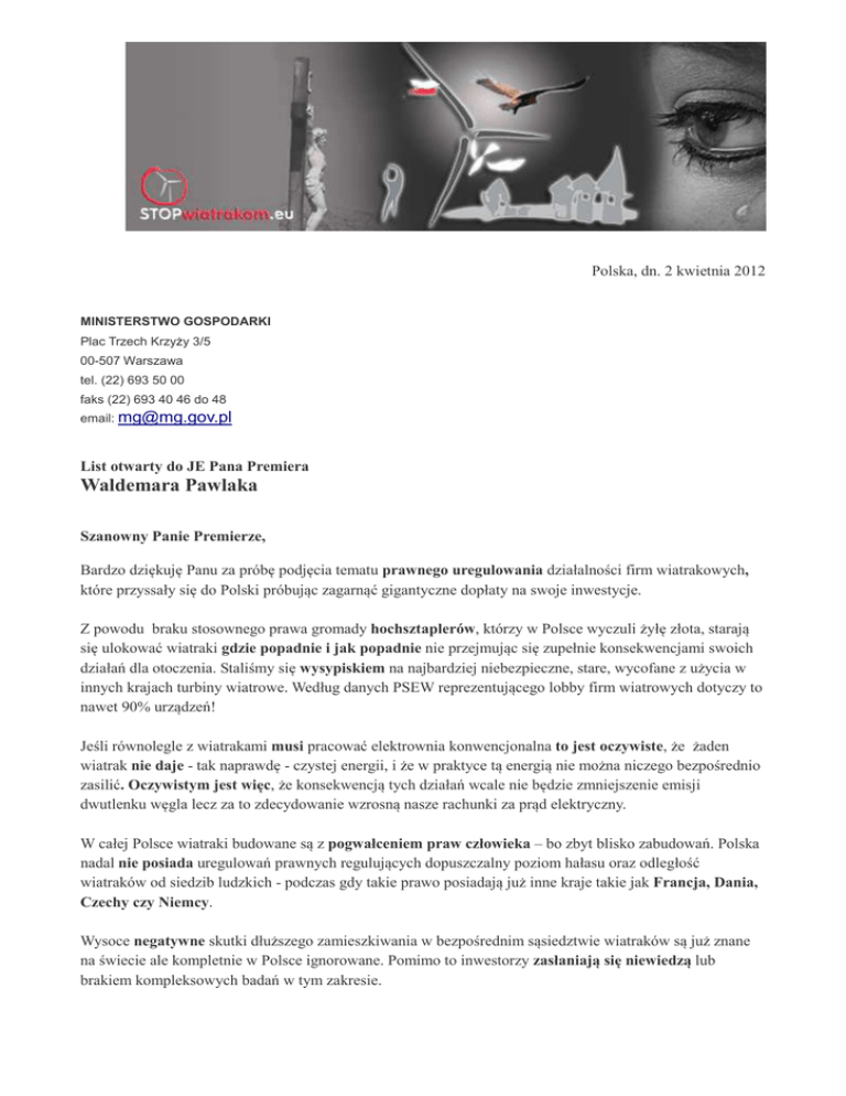 Polska, dn. 2 kwietnia 2012 MINISTERSTWO GOSPODARKI Plac Trzech Krzyży 3/5 00-507 Warszawa tel. (22) 693 50 00 faks (22) 693 40 46 do 48 email: [email protected] List otwarty do JE Pana Premiera Waldemara Pawlaka Szanowny Panie Premierze, Bardzo dziękuję Panu za próbę podjęcia tematu prawnego uregulowania działalności firm wiatrakowych, które przyssały się do Polski próbując zagarnąć gigantyczne dopłaty na swoje inwestycje. Z powodu braku stosownego prawa gromady hochsztaplerów, którzy w Polsce wyczuli żyłę złota, starają się ulokować wiatraki gdzie popadnie i jak popadnie nie przejmując się zupełnie konsekwencjami swoich działań dla otoczenia. Staliśmy się wysypiskiem na najbardziej niebezpieczne, stare, wycofane z użycia w innych krajach turbiny wiatrowe. Według danych PSEW reprezentującego lobby firm wiatrowych dotyczy to nawet 90% urządzeń! Jeśli równolegle z wiatrakami musi pracować elektrownia konwencjonalna to jest oczywiste, że żaden wiatrak nie daje - tak naprawdę - czystej energii, i że w praktyce tą energią nie można niczego bezpośrednio zasilić. Oczywistym jest więc, że konsekwencją tych działań wcale nie będzie zmniejszenie emisji dwutlenku węgla lecz za to zdecydowanie wzrosną nasze rachunki za prąd elektryczny. W całej Polsce wiatraki budowane są z pogwałceniem praw człowieka – bo zbyt blisko zabudowań. Polska nadal nie posiada uregulowań prawnych regulujących dopuszczalny poziom hałasu oraz odległość wiatraków od siedzib ludzkich - podczas gdy takie prawo posiadają już inne kraje takie jak Francja, Dania, Czechy czy Niemcy. Wysoce negatywne skutki dłuższego zamieszkiwania w bezpośrednim sąsiedztwie wiatraków są już znane na świecie ale kompletnie w Polsce ignorowane. Pomimo to inwestorzy zasłaniają się niewiedzą lub brakiem kompleksowych badań w tym zakresie. Nie możemy być królikami doświadczalnymi! Niedopuszczalnym jest aby Państwo zezwalało na aktywność, której skutki dla zdrowia obywateli nie zostały właściwie zbadane! To obowiązkiem Państwa jest przeprowadzenie multidyscyplinarnych badań celem ustalenia wymogów dla instalacji wiatrowych. Przykładowo wprowadzenie nowych leków na rynek wymaga dokładnych badań klinicznych. Także producenci innych urządzeń takich jak samochody, elektronika użytkowa czy żywność obciążeni są obowiązkiem zbadania skutków swoich produktów na zdrowie obywateli. Dlaczego ta zasada nie obowiązuje inwestorów wiatrowych? Cel nie może uświęcać środków! Polscy rolnicy są masowo oszukiwani na umowach dzierżawy gruntów pod wiatraki, które czynią z nich dozorców interesu inwestorów obciążając ich jednocześnie nowymi podatkami, obowiązkami i znacznym ryzykiem, np. ryzykiem demontażu i utylizacji porzuconego przez inwestora wiatraka. Jak Polska długa i szeroka mamy do czynienia z przekupywaniem samorządowców, potajemnymi pracami planistycznymi, lokowaniem wiatraków nawet 200 metrów od domów (sic!) oraz dewastacją przyrodniczą - nawet na obszarach Natura 2000 – z pogwałceniem Prawa Unijnego – w tym – Dyrektywy Ptasiej. Wielotysięczne protesty w całej Polsce muszą być w końcu usłyszane przez polskie Władze! Nie można mieć oczu szeroko zamkniętych na przemysłowe wykorzystywanie nawet tak docenionych przez cały świat obszarów jak Mazury. Problem dotyczy też dziesiątków tysięcy hektarów gruntów rolniczych najwyższej jakości oraz dziesiątków innych terenów cennych przyrodniczo! Nie da się też zaprzeczyć, że nasze oszczędności na emisji CO2 są niczym przy lawinowo zwiększającej się z roku na rok emisji gazów cieplarnianych w krajach takich jak USA, Indie czy Chiny. Cząstkowe wprowadzenie ograniczeń emisji tylko w wybranych krajach spowoduje jedynie exodus energochłonnych branż do wymienionych krajów lecz nie zmniejszy globalnego poziomu emisji – przeciwnie – może ją jedynie zwiększyć, szczególnie w Indiach i Chinach – ze względu na zacofanie techniczne. Dotyczy to także polskiego rolnictwa. Jeśli przeznaczymy najlepsze grunty na przemysłową produkcję energii wiatrowej to z upływem czasu będziemy zmuszeni ograniczyć produkcję rolną i importować żywność z krajów emitujących najwięcej gazów cieplarnianych. Panie Premierze mamy dosyć inwestorów, dla których liczą się tylko subsydia, kosztem ludzi, ptaków, przyrody i krajobrazu. Nie chcemy mieszkać koło wiatraków, nie chcemy ich słyszeć, ani na nie patrzeć. Czas wreszcie ustanowić jasne i jednoznaczne przepisy, oddalić elektrownie wiatrowe co najmniej 3 km od terenów zabudowanych i zabezpieczyć tereny chronione przed inwazją hipokrytów, dla których cel uświęca środki. Szczerze liczymy na Pana inicjatywę i aktywność w przedstawionej kwestii, gdyż dotyczy ona w znacznej mierze – bliskich Pana sercu – obszarów wiejskich z uszanowaniem, STOPwiatrakom.eu