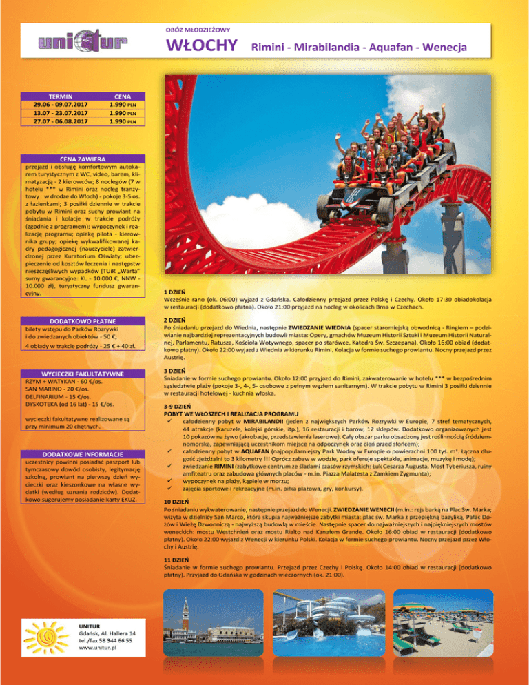 OBÓZ MŁODZIEŻOWY WŁOCHY TERMIN 29.06 - 09.07.2017 13.07 - 23.07.2017 27.07 - 06.08.2017 Rimini - Mirabilandia - Aquafan - Wenecja CENA 1.990 PLN 1.990 PLN 1.990 PLN CENA ZAWIERA przejazd i obsługę komfortowym autokarem turystycznym z WC, video, barem, klimatyzacją - 2 kierowców; 8 noclegów (7 w hotelu *** w Rimini oraz nocleg tranzytowy w drodze do Włoch) - pokoje 3-5 os. z łazienkami; 3 posiłki dziennie w trakcie pobytu w Rimini oraz suchy prowiant na śniadania i kolacje w trakcie podróży (zgodnie z programem); wypoczynek i realizację programu; opiekę pilota - kierownika grupy; opiekę wykwalifikowanej kadry pedagogicznej (nauczyciele) zatwierdzonej przez Kuratorium Oświaty; ubezpieczenie od kosztów leczenia i następstw nieszczęśliwych wypadków (TUiR „Warta” sumy gwarancyjne: KL - 10.000 €, NNW 10.000 zł), turystyczny fundusz gwarancyjny. DODATKOWO PŁATNE bilety wstępu do Parków Rozrywki i do zwiedzanych obiektów - 50 €; 4 obiady w trakcie podróży - 25 € + 40 zł. WYCIECZKI FAKULTATYWNE RZYM + WATYKAN - 60 €/os. SAN MARINO - 20 €/os. DELFINARIUM - 15 €/os. DYSKOTEKA (od 16 lat) - 15 €/os. wycieczki fakultatywne realizowane są przy minimum 20 chętnych. DODATKOWE INFORMACJE uczestnicy powinni posiadać paszport lub tymczasowy dowód osobisty, legitymację szkolną, prowiant na pierwszy dzień wycieczki oraz kieszonkowe na własne wydatki (według uznania rodziców). Dodatkowo sugerujemy posiadanie karty EKUZ. 1 DZIEŃ Wcześnie rano (ok. 06:00) wyjazd z Gdańska. Całodzienny przejazd przez Polskę i Czechy. Około 17:30 obiadokolacja w restauracji (dodatkowo płatna). Około 21:00 przyjazd na nocleg w okolicach Brna w Czechach. 2 DZIEŃ Po śniadaniu przejazd do Wiednia, następnie ZWIEDZANIE WIEDNIA (spacer staromiejską obwodnicą - Ringiem – podziwianie najbardziej reprezentacyjnych budowli miasta: Opery, gmachów Muzeum Historii Sztuki i Muzeum Historii Naturalnej, Parlamentu, Ratusza, Kościoła Wotywnego, spacer po starówce, Katedra Św. Szczepana). Około 16:00 obiad (dodatkowo płatny). Około 22:00 wyjazd z Wiednia w kierunku Rimini. Kolacja w formie suchego prowiantu. Nocny przejazd przez Austrię. 3 DZIEŃ Śniadanie w formie suchego prowiantu. Około 12:00 przyjazd do Rimini, zakwaterowanie w hotelu *** w bezpośrednim sąsiedztwie plaży (pokoje 3-, 4-, 5- osobowe z pełnym węzłem sanitarnym). W trakcie pobytu w Rimini 3 posiłki dziennie w restauracji hotelowej - kuchnia włoska. 3-9 DZIEŃ POBYT WE WŁOSZECH I REALIZACJA PROGRAMU całodzienny pobyt w MIRABILANDII (jeden z największych Parków Rozrywki w Europie, 7 stref tematycznych, 44 atrakcje (karuzele, kolejki górskie, itp.), 16 restauracji i barów, 12 sklepów. Dodatkowo organizowanych jest 10 pokazów na żywo (akrobacje, przedstawienia laserowe). Cały obszar parku obsadzony jest roślinnością śródziemnomorską, zapewniającą uczestnikom miejsce na odpoczynek oraz cień przed słońcem); całodzienny pobyt w AQUAFAN (najpopularniejszy Park Wodny w Europie o powierzchni 100 tyś. m². Łączna długość zjeżdżalni to 3 kilometry !!! Oprócz zabaw w wodzie, park oferuje spektakle, animacje, muzykę i modę); zwiedzanie RIMINI (zabytkowe centrum ze śladami czasów rzymskich: Łuk Cesarza Augusta, Most Tyberiusza, ruiny amfiteatru oraz zabudowa głównych placów - m.in. Piazza Malatesta z Zamkiem Zygmunta); wypoczynek na plaży, kąpiele w morzu; zajęcia sportowe i rekreacyjne (m.in. piłka plażowa, gry, konkursy). 10 DZIEŃ Po śniadaniu wykwaterowanie, następnie przejazd do Wenecji. ZWIEDZANIE WENECJI (m.in.: rejs barką na Plac Św. Marka; wizyta w dzielnicy San Marco, która skupia najważniejsze zabytki miasta: plac św. Marka z przepiękną bazyliką, Pałac Dożów i Wieżę Dzwonniczą - najwyższą budowlą w mieście. Następnie spacer do najważniejszych i najpiękniejszych mostów weneckich: mostu Westchnień oraz mostu Rialto nad Kanałem Grande. Około 16:00 obiad w restauracji (dodatkowo płatny). Około 22:00 wyjazd z Wenecji w kierunku Polski. Kolacja w formie suchego prowiantu. Nocny przejazd przez Włochy i Austrię. 11 DZIEŃ Śniadanie w formie suchego prowiantu. Przejazd przez Czechy i Polskę. Około 14:00 obiad w restauracji (dodatkowo płatny). Przyjazd do Gdańska w godzinach wieczornych (ok. 21:00).