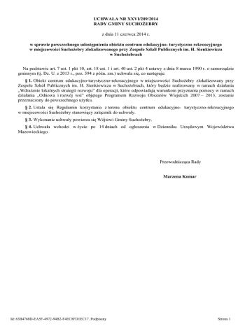 UCHWAŁA NR XXVI/209/2014 RADY GMINY SUCHOŻEBRY z dnia 11 czerwca 2014 r. w sprawie powszechnego udostępnienia obiektu centrum edukacyjno- turystyczno rekreacyjnego w miejscowości Suchożebry zlokalizowanego przy Zespole Szkół Publicznych im. H. Sienkiewicza w Suchożebrach Na podstawie art. 7 ust. 1 pkt 10, art. 18 ust. 1 i art. 40 ust. 2 pkt 4 ustawy z dnia 8 marca 1990 r. o samorządzie gminnym (tj. Dz. U. z 2013 r., poz. 594 z późn. zm.) uchwala się, co następuje: § 1. Obiekt centrum edukacyjno-turystyczno-rekreacyjnego w miejscowości Suchożebry zlokalizowany przy Zespole Szkół Publicznych im. H. Sienkiewicza w Suchożebrach, który będzie realizowany w ramach działania „Wdrażanie lokalnych strategii rozwoju” dla operacji, które odpowiadają warunkom przyznania pomocy w ramach działania „Odnowa i rozwój wsi” objętego Programem Rozwoju Obszarów Wiejskich 2007 – 2013, zostanie przeznaczony do powszechnego użytku. § 2. Ustala się Regulamin korzystania z terenu obiektu centrum edukacyjno- turystyczno-rekreacyjnego w miejscowości Suchożebry stanowiący załącznik do uchwały. § 3. Wykonanie uchwały powierza się Wójtowi Gminy Suchożebry. § 4. Uchwała wchodzi w życie po 14 dniach od ogłoszenia w Dzienniku Urzędowym Województwa Mazowieckiego. Przewodnicząca Rady Marzena Komar Id: 63B4768D-EA5F-4972-94B2-F4EC8FD1EC17. Podpisany Strona 1 Załącznik do Uchwały Nr XXVI/209/2014 Rady Gminy Suchożebry z dnia 11 czerwca 2014 r. REGULAMIN KORZYSTANIA Z TERENU OBIEKTU CENTRUM EDUKACYJNO- TURYSTYCZNO-REKREACYJNEGO w miejscowości Suchożebry § 1. 1. Centrum Edukacyjno-Turystyczno-Rekreacyjne (zwane dalej obiektem) stanowi własność Gminy Suchożebry. 2. Nadzór nad mieniem i działalnością obiektu sprawuje Wójt Gminy Suchożebry na podstawie przepisów ustawy o samorządzie gminnym i innych przepisów szczególnych. 3. Administratorem obiektu jest Gmina Suchożebry. 4. Korzystanie z obiektu możliwe jest po zapoznaniu się z zapisami niniejszegoregulaminu. § 2. 1. Centrum Edukacyjno-Turystyczno-Rekreacyjne jest obiektem ogólnodostępnym w skład którego wchodzą: plac rekreacyjno – sportowy (w tym. plac zabaw i siłownia zewnętrzna) oraz pawilon Expo Natura 2000. 2. Na terenie obiektu, zabrania się: 1) wstępu osobom, których stan wskazuje na spożycie alkoholu oraz sprzedaży, podawania, wnoszenia i spożywania napojów alkoholowych, 2) niszczenia, malowania i oklejania urządzeń i sprzętu Obiektu, 3) wprowadzania psów i innych zwierząt, 4) śmiecenia i brudzenia terenu, 5) zakłócania wypoczynku innych osób, 6) wjeżdżania i poruszania się pojazdami (samochodami, motocyklami, rowerami i kładami) poza miejscami do tego wyznaczonymi, 7) prowadzenia sprzedaży towarów; 8) rozniecania i palenia ognisk oraz korzystania z grilla, 9) rozstawiania namiotów oraz nocowania. 3. Zarządzający Obiektem nie ponosi odpowiedzialności za przedmioty wartościowe pozostawione na terenie Obiektu. 4. Osoby dewastujące sprzęt na terenie Obiektu ponoszą materialną odpowiedzialnośćza wyrządzone szkody. 5. Osoby naruszające porządek publiczny lub przepisy niniejszego Regulaminu będą usuwane z terenu obiektu, niezależnie od ewentualnego skierowania sprawy na drogę postępowania w sprawach o wykroczenia. 6. Osoby naruszające nakazy bezpieczeństwa i porządku na terenie Obiektu będą pociągnięte do odpowiedzialności karno – administracyjnej. § 3. Korzystanie z placu zabaw w ramach obiektu 1. Z placu zabaw można korzystać w godz. 8.00 do 20.00. 2. Plac zabaw przeznaczony jest dla dzieci od 3 do 12 lat. 3. Dzieci poniżej 12 lat muszą znajdować się pod opieką osób dorosłych. 4. Za szkody wyrządzone przez dzieci odpowiadają rodzice lub opiekunowie. 5. Na plac zabaw nie wolno wprowadzać psów. 6. Zakaz jazdy na rowerze i gry w piłkę. 7. Na placu zabaw nie wolno śmiecić. Prosimy o wyrzucanie odpadków do koszy na śmieci. 8. Na terenie placu zabaw i jego pobliżu obowiązuje bezwzględnyzakaz palenia tytoniu oraz spożywania napojów alkoholowych. § 4. Korzystanie z urządzeń siłowni zewnętrznej w ramach obiektu Id: 63B4768D-EA5F-4972-94B2-F4EC8FD1EC17. Podpisany Strona 1 1. 2. 3. 4. 5. 6. Siłownia zewnętrzna to ogólnodostępnyteren służący zabawie i rekreacji. Osoby przebywające na terenie obiektu zobowiązane są do zachowania porządku. Dzieci poniżej 7 roku życia powinny bawić się pod opieką dorosłych. Z urządzeń zabawowych należy korzystać zgodnie z ich przeznaczeniem. Na terenie siłowni obowiązuje bezwzględnyzakaz spożywania alkoholu. Na terenie siłowni zabrania się w szczególności: - niszczenia urządzeń zabawowych, - zaśmiecania terenu, - wprowadzania psów i kotów, - wnoszenia niebezpiecznychprzedmiotów i pozostawiania ich na terenie. § 5. Korzystanie z pawilonu Expo Natura 2000 w ramach obiektu 1. Pawilon Natura Expo 2000 pełnieni funkcji centrum edukacyjnego, rekreacyjnego, kulturalnego. 2. Pawilon „Natura Expo 2000” wykorzystywany będzie do prezentowania wystaw o charakterze kulturalnym, przyrodniczym (głównie związanym z Obszarami Natura 2000 na terenie Gminy – funkcja promocyjna, turystyczna i edukacyjna). 3. Sala konferencyjna może być wykorzystywana do prezentacji, pogadanek i warsztatów szkoleniowych (np. rękodzieła, kulinarnych) dla mieszkańców różnych grup wiekowych. 4. Pawilon będzie wykorzystywany do prowadzenia działalności społeczno-kulturowej w tym prowadzonej przez gminne instytucje kultury działające na terenie Gminy. 5. Wszelkie przedsięwzięcia organizowane w pawilonie muszą być uzgodnione z administratorem. 6. Osoby korzystające z pawilonu zobowiązane są do przestrzegania przepisów dotyczących bezpieczeństwa, porządku i czystości w miejscach publicznych. § 6. Właściciel obiektu nie ponosi odpowiedzialności za wypadki i szkody na osobach i mieniu będące skutkiem korzystania z obiektu lub jej wyposażenia w sposób