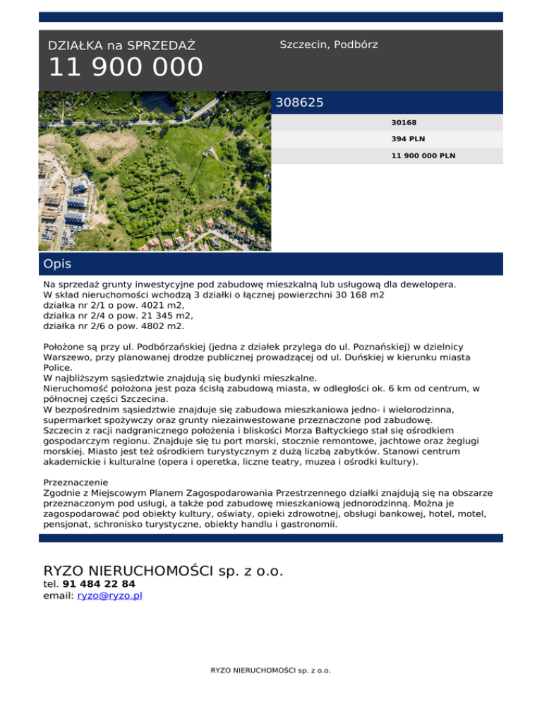 DZIAŁKA na SPRZEDAŻ Szczecin, Podbórz 11 900 000 308625 30168 394 PLN 11 900 000 PLN Opis Na sprzedaż grunty inwestycyjne pod zabudowę mieszkalną lub usługową dla dewelopera. W skład nieruchomości wchodzą 3 działki o łącznej powierzchni 30 168 m2 działka nr 2/1 o pow. 4021 m2, działka nr 2/4 o pow. 21 345 m2, działka nr 2/6 o pow. 4802 m2. Położone są przy ul. Podbórzańskiej (jedna z działek przylega do ul. Poznańskiej) w dzielnicy Warszewo, przy planowanej drodze publicznej prowadzącej od ul. Duńskiej w kierunku miasta Police. W najbliższym sąsiedztwie znajdują się budynki mieszkalne. Nieruchomość położona jest poza ścisłą zabudową miasta, w odległości ok. 6 km od centrum, w północnej części Szczecina. W bezpośrednim sąsiedztwie znajduje się zabudowa mieszkaniowa jedno- i wielorodzinna, supermarket spożywczy oraz grunty niezainwestowane przeznaczone pod zabudowę. Szczecin z racji nadgranicznego położenia i bliskości Morza Bałtyckiego stał się ośrodkiem gospodarczym regionu. Znajduje się tu port morski, stocznie remontowe, jachtowe oraz żeglugi morskiej. Miasto jest też ośrodkiem turystycznym z dużą liczbą zabytków. Stanowi centrum akademickie i kulturalne (opera i operetka, liczne teatry, muzea i ośrodki kultury). Przeznaczenie Zgodnie z Miejscowym Planem Zagospodarowania Przestrzennego działki znajdują się na obszarze przeznaczonym pod usługi, a także pod zabudowę mieszkaniową jednorodzinną. Można je zagospodarować pod obiekty kultury, oświaty, opieki zdrowotnej, obsługi bankowej, hotel, motel, pensjonat, schronisko turystyczne, obiekty handlu i gastronomii. RYZO NIERUCHOMOŚCI sp. z o.o. tel. 91 484 22 84 email: [email protected] RYZO NIERUCHOMOŚCI sp. z o.o. Powered by TCPDF (www.tcpdf.org)