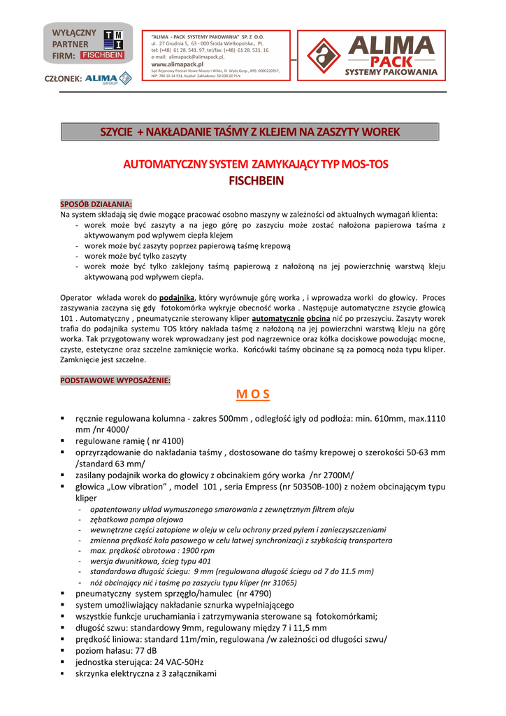 SZYCIE + NAKŁADANIE TAŚMY Z KLEJEM NA ZASZYTY WOREK AUTOMATYCZNY SYSTEM ZAMYKAJĄCY TYP MOS-TOS FISCHBEIN SPOSÓB DZIAŁANIA: Na system składają się dwie mogące pracować osobno maszyny w zależności od aktualnych wymagań klienta: - worek może być zaszyty a na jego górę po zaszyciu może zostać nałożona papierowa taśma z aktywowanym pod wpływem ciepła klejem - worek może być zaszyty poprzez papierową taśmę krepową - worek może być tylko zaszyty - worek może być tylko zaklejony taśmą papierową z nałożoną na jej powierzchnię warstwą kleju aktywowaną pod wpływem ciepła. Operator wkłada worek do podajnika, który wyrównuje górę worka , i wprowadza worki do głowicy. Proces zaszywania zaczyna się gdy fotokomórka wykryje obecność worka . Następuje automatyczne zszycie głowicą 101 . Automatyczny , pneumatycznie sterowany kliper automatycznie obcina nić po przeszyciu. Zaszyty worek trafia do podajnika systemu TOS który nakłada taśmę z nałożoną na jej powierzchni warstwą kleju na górę worka. Tak przygotowany worek wprowadzany jest pod nagrzewnice oraz kółka dociskowe powodując mocne, czyste, estetyczne oraz szczelne zamknięcie worka. Końcówki taśmy obcinane są za pomocą noża typu kliper. Zamknięcie jest szczelne. PODSTAWOWE WYPOSAŻENIE: MOS ręcznie regulowana kolumna - zakres 500mm , odległość igły od podłoża: min. 610mm, max.1110 mm /nr 4000/ regulowane ramię ( nr 4100) oprzyrządowanie do nakładania taśmy , dostosowane do taśmy krepowej o szerokości 50-63 mm /standard 63 mm/ zasilany podajnik worka do głowicy z obcinakiem góry worka /nr 2700M/ głowica „Low vibration” , model 101 , seria Empress (nr 50350B-100) z nożem obcinającym typu kliper - opatentowany układ wymuszonego smarowania z zewnętrznym filtrem oleju zębatkowa pompa olejowa wewnętrzne części zatopione w oleju w celu ochrony przed pyłem i zanieczyszczeniami zmienna prędkość koła pasowego w celu łatwej synchronizacji z szybkością transportera max. prędkość obrotowa : 1900 rpm wersja dwunitkowa, ścieg typu 401 standardowa długość ściegu: 9 mm (regulowana długość ściegu od 7 do 11.5 mm) nóż obcinający nić i taśmę po zaszyciu typu kliper (nr 31065) pneumatyczny system sprzęgło/hamulec (nr 4790) system umożliwiający nakładanie sznurka wypełniającego wszystkie funkcje uruchamiania i zatrzymywania sterowane są fotokomórkami; długość szwu: standardowy 9mm, regulowany między 7 i 11,5 mm prędkość liniowa: standard 11m/min, regulowana /w zależności od długości szwu/ poziom hałasu: 77 dB jednostka sterująca: 24 VAC-50Hz skrzynka elektryczna z 3 załącznikami TOS wyposażony w oprzyrządowanie do nakładania taśmy z umieszczoną na niej warstwą kleju ręcznie regulowana kolumna, regulowana wysokość linii zgrzewania od 787 do 1422 mm zasilany podajnik worka wprowadzający worek w obszar nagrzewnicy regulator (PID) temperatury powietrza nagrzewającego taśmę max prędkość z jaką system nakłada taśmę do 16 m/min minimalna szerokość zamykanego worka 120 mm PODŁĄCZENIA ELEKTRYCZNE: Moc: 400 VAC – 3 fazy z przewodem neutralnym + ochronnym Częstotliwość: 50 Hz Układ sterujący: 24 VAC – 50 Hz Moc: 2,4 Kw – 6 A Stopień ochrony: IP 54 Silnik głowicy: 230/400VAC – 3 Ph – 50 Hz – 1450 rpm, 0,75 Kw/IP55 , klasa izolacji F Silnik podajnika: 230/400VAC – 3 Ph – 50 Hz – 1450 rpm, 0,18 Kw/IP55 , klasa izolacji F PODŁĄCZENIA PNEUMATYCZNE: Sprężone powietrze musi być suche , czyste i pozbawione zanieczyszczeń Ciśnienie: min. 6 bar , max. 8 bar Zużycie powietrza , przy 6 bar na 1 worek : 0,2 l Zużycie powietrza , przy 6 bar ok. 28 litrów/min. OPCJE: System po niewielkich modyfikacjach można bardzo łatwo przestawić na: system MUA czyli zamknięcie worka poprzez przeszycie worka przez taśmę krepową system TOS zamykający worek poprzez przyklejenie nałożonej na górę worka taśmy w opcjach także elektryczna kolumna, wózek na kółkach, wersja ze sznurkiem wypełniającym dla systemu MUA, schładzacz igły, detektor braku nici i taśmy. WYGLĄD WORKA PO ZAMKNIĘCIU