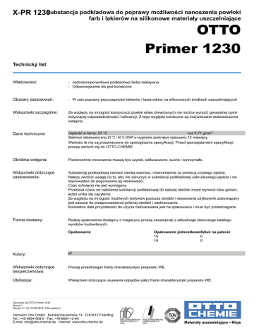 Substancja podkładowa do poprawy możliwości nanoszenia powłoki X-PR 1230 farb i lakierów na silikonowe materiały uszczelniające OTTO Primer 1230 Technický list Właściwości: - Jednokomponentowa podkładowa farba reaktywna - Odparowywanie nie jest konieczne Obszary zastosowań: - W celu poprawy przyczepności lakierów i laserunków na silikonowych środkach uszczelniających Wskazówki szczególne: Ze względu na mnogość kompozycji powłok okien drewnianych nie można wyrazić generalnej opinii dotyczącej odpowiedzialności i tolerancji. Z tego względu konieczne są indywidualne doświadczenia wstępne. Dane techniczne: Gęstość w temp. 23 °C cca 0,71 g/cm³ Stabilność składowania przy 23 °C / 50 % WWP w oryginalnie zamkniętym opakowaniu 12 miesięcy Wartości te nie są przeznaczone do sporządzania specyfikacji. Przed sporządzeniem specyfikacji proszę zwrócić się do OTTO-CHEMIE. Obróbka wstępna: Powierzchnie mocowania muszą być czyste, odtłuszczone, suche i wytrzymałe. Wskazówki dotyczące zastosowania: Substancję podkładową nanosić cienką warstwą i równomiernie za pomocą czystego pędzla. Należy zwrócić uwagę na to, aby nie zanurzyć w substancji podkładowej zabrudzonego pędzla i nie doprowadzić do pogorszenia jej właściwości. Czas schnięcia nie jest wymagany Przedział czasu od nałożenia substancji podkładowej do dalszej obróbki może wynosić kilka godzin, jeżeli unika się zapylenia. Ze względu na mnogość możliwych wpływów podczas obróbki i stosowania użytkownik zobowiązany jest zawsze do przeprowadzenia próbnej obróbki i zastosowania. Konkretna data przydatności do użycia nadrukowana jest na opakowaniu i musi być przestrzegana. Forma dostawy: Rodzaj opakowania dostępny z magazynu proszę zaczerpnąć z aktualnego zbiorczego katalogu wyrobów budowlanych. Opakowanie Opakowanie jednostkoweSztuk na palecie 15 0 15 0 Kolory: kF Wskazówki dotyczące bezpieczeństwa: Proszę przestrzegać Karty charakterystyki preparatu WE. Utylizacja: Wskazówki dotyczące usuwania odpadów patrz Karta charakterystyki preparatu WE. Technický list OTTO Primer 1230 Strona 1 Wersja: 9 / 1pl (19.06.2012, 9:56 godzina) Hermann Otto GmbH · Krankenhausstraße 14 · D-83413 Fridolfing Tel..:+49 8684-908-0 · Fax: +49 8684-12-60 E-mail: [email protected] · Internet: www.otto-chemie.de Odpowiedzialność za wady: Wszystkie informacje zawarte w niniejszym druku bazują na aktualnej wiedzy technicznej i doświadczeniach. Ze względu na mnogość możliwych wpływów podczas obróbki i stosowania nie zwalniają one użytkownika od przeprowadzenia własnych badań i prób. Informacje zawarte w niniejszym druku i oświadczenia firmy Otto-Chemie związane z tym drukiem nie stanowią przejęcia gwarancji. Oświadczenia dotyczące gwarancji wymagają dla swej skuteczności oddzielnego wyraźnego oświadczenia firmy Otto-Chemie na piśmie. Właściwości podane w tej karcie danych obszernie i ostatecznie ustalają właściwości przedmiotu dostawy. Propozycje zastosowania nie uzasadniają przyrzeczenia przydatności dla zalecanego celu zastosowania. Zastrzegamy sobie prawo do dopasowania produktu do postępu technicznego i nowych opracowań. Jesteśmy do dyspozycji w przypadku zapytań, również dotyczących ewentualnych specjalnych problemów związanych z zastosowaniami. Jeżeli zastosowanie, w którym wykorzystywane są nasze produkty, podlega obowiązkowi uzyskania urzędowego zezwolenia, odpowiedzialnym za uzyskanie tych zezwoleń jest użytkownik. Nasze zalecenia nie zwalniają użytkownika z obowiązku uwzględnienia i, jeśli to konieczne, wyjaśnienia możliwości naruszenia praw osób trzecich. W pozostałym zakresie odsyłamy do naszych Ogólnych Warunków Handlowych, w szczególności również w odniesieniu do ewentualnej odpowiedzialności za wady. Nasze Ogólne Warunki Handlowe znajdują się na stronie internetowej http://www.otto-chemie.de Technický list OTTO Primer 1230 Strona 2 Wersja: 9 / 1pl (19.06.2012, 9:56 godzina) Hermann Otto GmbH · Krankenhausstraße 14 · D-83413 Fridolfing Tel..:+49 8684-908-0 · Fax: +49 8684-12-60 E-mail: [email protected] · Internet: www.otto-chemie.de