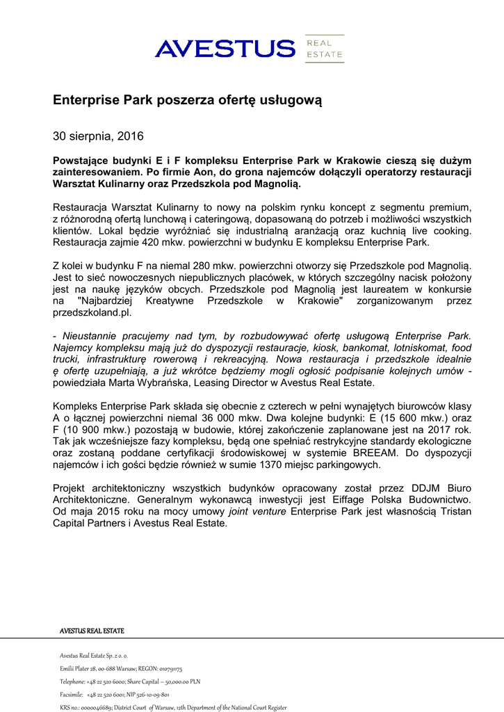 Enterprise Park poszerza ofertę usługową 30 sierpnia, 2016 Powstające budynki E i F kompleksu Enterprise Park w Krakowie cieszą się dużym zainteresowaniem. Po firmie Aon, do grona najemców dołączyli operatorzy restauracji Warsztat Kulinarny oraz Przedszkola pod Magnolią. Restauracja Warsztat Kulinarny to nowy na polskim rynku koncept z segmentu premium, z różnorodną ofertą lunchową i cateringową, dopasowaną do potrzeb i możliwości wszystkich klientów. Lokal będzie wyróżniać się industrialną aranżacją oraz kuchnią live cooking. Restauracja zajmie 420 mkw. powierzchni w budynku E kompleksu Enterprise Park. Z kolei w budynku F na niemal 280 mkw. powierzchni otworzy się Przedszkole pod Magnolią. Jest to sieć nowoczesnych niepublicznych placówek, w których szczególny nacisk położony jest na naukę języków obcych. Przedszkole pod Magnolią jest laureatem w konkursie na "Najbardziej Kreatywne Przedszkole w Krakowie" zorganizowanym przez przedszkoland.pl. - Nieustannie pracujemy nad tym, by rozbudowywać ofertę usługową Enterprise Park. Najemcy kompleksu mają już do dyspozycji restauracje, kiosk, bankomat, lotniskomat, food trucki, infrastrukturę rowerową i rekreacyjną. Nowa restauracja i przedszkole idealnie ę ofertę uzupełniają, a już wkrótce będziemy mogli ogłosić podpisanie kolejnych umów powiedziała Marta Wybrańska, Leasing Director w Avestus Real Estate. Kompleks Enterprise Park składa się obecnie z czterech w pełni wynajętych biurowców klasy A o łącznej powierzchni niemal 36 000 mkw. Dwa kolejne budynki: E (15 600 mkw.) oraz F (10 900 mkw.) pozostają w budowie, której zakończenie zaplanowane jest na 2017 rok. Tak jak wcześniejsze fazy kompleksu, będą one spełniać restrykcyjne standardy ekologiczne oraz zostaną poddane certyfikacji środowiskowej w systemie BREEAM. Do dyspozycji najemców i ich gości będzie również w sumie 1370 miejsc parkingowych. Projekt architektoniczny wszystkich budynków opracowany został przez DDJM Biuro Architektoniczne. Generalnym wykonawcą inwestycji jest Eiffage Polska Budownictwo. Od maja 2015 roku na mocy umowy joint venture Enterprise Park jest własnością Tristan Capital Partners i Avestus Real Estate. AVESTUS REAL ESTATE Avestus Real Estate Sp. z o. o. Emilii Plater 28, 00-688 Warsaw; REGON: 010791175 Telephone: +48 22 520 6000; Share Capital – 50,000.00 PLN Facsimile: +48 22 520 6001; NIP 526-10-09-801 KRS no.: 0000046689; District Court of Warsaw, 12th Department of the National Court Register Dodatkowe informacje: Kamil Gołdy Advanced PR e-mail: [email protected] tel.: +48 22 642 10 26 kom.: +48 604 432 265 Karolina Bardecka Advanced PR e-mail: [email protected] tel.: +48 22 642 10 26 kom.: +48 604 409 720 O Avestus Real Estate Deweloperem Enterprise Park jest Avestus Real Estate, firma znana w Polsce z realizacji m.in. tak prestiżowych projektów biurowych, jak warszawski International Business Centre, Warsaw Financial Centre, budynek F w kompleksie Wiśniowy Business Park i park biurowy Enterprise Park w Krakowie. Avestus Real Estate jest aktywnie zaangażowany we wszystkie aspekty procesu budowlanego, w tym kształtowanie struktury, opracowywanie strategii, finansowanie, rozwój oraz zarządzanie portfelem różnego rodzaju aktywów nieruchomościowych. Avestus Real Estate posiada biura i prowadzi projekty w Czechach, Polsce oraz na Węgrzech i Słowacji. Oprócz rozbudowy Enterprise Park, realizuje obecnie projekt Cube w Warszawie. O Tristan Capital Partners Tristan Capital Partners jest firmą specjalizującą się w realizacji strategii inwestycyjnych w nieruchomości komercyjne na rzecz podmiotów publicznych i prywatnych na terenie całej Europy. Ten stanowiący własność kadry zarządzającej firmy butik inwestycyjny zarządza portfolio funduszy o rożnym stopniu ryzyka (core-plus, value-added/opportunistic). W jego skład wchodzą fundusze Curzon Capital Partners III,L.P., European Property Investors, L.P., European Property Investors Special Opportunities, L.P. oraz EPISO 3, L.P.. Tristan Capital Partners, poprzez sieć biur w Londynie, Luksemburgu, Mediolanie, Paryżu, Sztokholmie, Düsseldorfie, Barcelonie oraz Warszawie, zarządza aktywami o łącznej wartości przekraczającej 7 miliardów euro. Portfolio nieruchomości zarządzanych przez Tristan Capital Partners w Polsce obejmuje należące do funduszu Curzon Capital Partners III warszawskie biurowce Warsaw Financial Center (w konsorcjum z Allianz Real Estate) i Mokotów Nova oraz pięć centrów handlowych (Arena w Gliwicach, Dąbrówka w Katowicach, Borek we Wrocławiu, Turzyn w Szczecinie i Zakopianka w Krakowie), których właścicielem jest fundusz EPISO 3. www.tristancap.com AVESTUS REAL ESTATE Avestus Real Estate Sp. z o. o. Emilii Plater 28, 00-688 Warsaw; REGON: 010791175 Telephone: +48 22 520 6000; Share Capital – 50,000.00 PLN Facsimile: +48 22 520 6001; NIP 526-10-09-801 KRS no.: 0000046689; District Court of Warsaw, 12th Department of the National Court Register