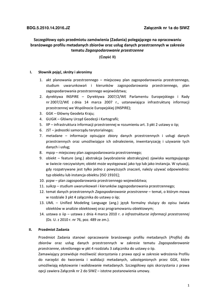 BDG.5.2510.14.2016.JZ Załącznik nr 1a do SIWZ Szczegółowy opis przedmiotu zamówienia (Zadania) polegającego na opracowaniu branżowego profilu metadanych zbiorów oraz usług danych przestrzennych w zakresie tematu Zagospodarowanie przestrzenne (Część II) I. Słownik pojęć, skróty i akronimy 1. akt planowania przestrzennego – miejscowy plan zagospodarowania przestrzennego, studium uwarunkowań i kierunków zagospodarowania przestrzennego, plan zagospodarowania przestrzennego województwa; 2. dyrektywa INSPIRE – Dyrektywa 2007/2/WE Parlamentu Europejskiego i Rady nr 2007/2/WE z dnia 14 marca 2007 r., ustanawiająca infrastrukturę informacji przestrzennej we Wspólnocie Europejskiej (INSPIRE); 3. GGK – Główny Geodeta Kraju; 4. GUGiK – Główny Urząd Geodezji i Kartografii; 5. IIP – infrastruktura informacji przestrzennej w rozumieniu art. 3 pkt 2 ustawy o iip; 6. JST – jednostki samorządu terytorialnego; 7. metadane – informacje opisujące zbiory danych przestrzennych i usługi danych przestrzennych oraz umożliwiające ich odnalezienie, inwentaryzację i używanie tych danych i usług; 8. mpzp – miejscowy plan zagospodarowania przestrzennego; 9. obiekt – feature (ang.) abstrakcja (wyobrażenie abstrakcyjne) zjawiska występującego w świecie rzeczywistym; obiekt może występować jako typ lub jako instancja. W sytuacji, gdy rozpatrywane jest tylko jedno z powyższych znaczeń, należy używać odpowiednio: typ obiektu lub instancja obiektu [ISO 19101]; 10. pzpw – plan zagospodarowania przestrzennego województwa; 11. suikzp – studium uwarunkowań i kierunków zagospodarowania przestrzennego; 12. temat danych przestrzennych Zagospodarowanie przestrzenne – temat, o którym mowa w rozdziale 3 pkt 4 załącznika do ustawy o iip; 13. UML – Unified Modeling Language (ang.) język formalny służący do opisu świata obiektów w analizie obiektowej oraz programowaniu obiektowym; 14. ustawa o iip – ustawa z dnia 4 marca 2010 r. o infrastrukturze informacji przestrzennej (Dz. U. z 2010 r. nr 76, poz. 489 ze zm.). II. Przedmiot Zadania Przedmiot Zadania stanowi opracowanie branżowego profilu metadanych (Profilu) dla zbiorów oraz usług danych przestrzennych w zakresie tematu Zagospodarowanie przestrzenne, określonego w pkt 4 rozdziału 3 załącznika do ustawy o iip. Zamawiający przewiduje możliwość skorzystania z prawa opcji w zakresie wdrożenia Profilu do narzędzi do tworzenia i walidacji metadanych, udostępnionych przez GGK, które umożliwiają edytowanie i walidowanie metadanych. Szczegółowy opis skorzystania z prawa opcji zawiera Załącznik nr 2 do SIWZ – istotne postanowienia umowy. 1 Zakłada się, że Profil będzie zawierał wszystkie elementy i reguły profilu metadanych INSPIRE, będąc tym samym w pełni zgodnym z przepisami implementacyjnymi INSPIRE. Ponadto zostanie rozszerzony o dodatkowe elementy zdefiniowane odpowiednio w normach ISO 19115, ISO 19119 umożliwiające zautomatyzowane monitorowanie budowy IIP, wzmocnienie partycypacji społecznej w procesie planowania przestrzennego (uwzględnienie etapów procedury planistycznej, zasięgów przestrzennych zbiorów danych) oraz usprawnienie realizacji działań wynikających z potrzeb planowania przestrzennego. W pracach nad Profilem zostaną uwzględnione wyniki projektów oraz seminarium, o których mowa w założeniach opracowania. W pracach nad Profilem zostanie uwzględniony obowiązujący oraz obecnie planowany stan prawny bezpośrednio determinujący planowane zagospodarowanie przestrzenne, m.in. w zakresie istniejących i planowanych instrumentów planistycznych (akty planowania przestrzennego, wprowadzenie planowania funkcjonalnego, decyzje administracyjne) stanowiących lub mogących stanowić zbiory danych przestrzennych. Ponadto przeanalizowane zostaną rozwiązania w zakresie metadanych funkcjonujące na szczeblu krajowym, regionalnym oraz subregionalnym. III. Podstawa prawna Przedmiot Zadania stanowi realizację obowiązków Ministra Infrastruktury i Budownictwa jako ministra właściwego do spraw budownictwa, planowania i zagospodarowania przestrzennego oraz mieszkalnictwa, będącego organem wiodącym w zakresie tematu danych przestrzennych Zagospodarowanie przestrzenne (art. 3 pkt 7 lit. a ustawy o iip). Obowiązki organu wiodącego dotyczą m.in. tworzenia i wdrożenia systemów szkoleń obejmujących w szczególności zagadnienia z zakresu tworzenia, aktualizacji i udostępniania metadanych (art. 6 ustawy o iip), a także monitorowania działań związanych z tworzeniem, utrzymywaniem i rozwijaniem IIP, w ramach ww. tematu danych przestrzennych, mając w szczególności na względzie zapewnienie zgodności tych działań, w tym wprowadzanych rozwiązań technicznych, z przepisami dotyczącymi infrastruktury informacji przestrzennej (art. 20 ust. 1 ustawy o iip). Ponadto podstawę do realizacji Zadania stanowi porozumienie zawarte w dniu 9 listopada 2015 r. pomiędzy Ministrem Infrastruktury i Rozwoju a Głównym Geodetą Kraju, którego nadrzędnym celem jest tworzenie, utrzymywanie i rozwijanie IIP w zakresie tematu Zagospodarowanie przestrzenne. Na mocy porozumienia Strony zobowiązują się do współdziałania w zakresie dostosowania wspólnych elementów krajowej IIP, w szczególności udostępnianych przez GGK narzędzi do tworzenia i walidacji metadanych (narzędzi GGK), do specyfiki i potrzeb systemu planowania przestrzennego w Polsce. IV. Cel główny Zadania Jednym z celów IIP jest uporządkowanie jej zasobów poprzez dążenie do osiągnięcia interoperacyjności zbiorów i usług danych przestrzennych oraz odpowiadających im metadanych. Metadane stanowią istotny element IIP, dzięki któremu możliwe jest wyszukanie zasobu przestrzennego stanowiącego przedmiot zainteresowania użytkownika oraz ocena jego przydatności. Dostęp do wiarygodnej i aktualnej informacji przestrzennej oraz jej wykorzystanie w procesie decyzyjnym jest obecnie ist