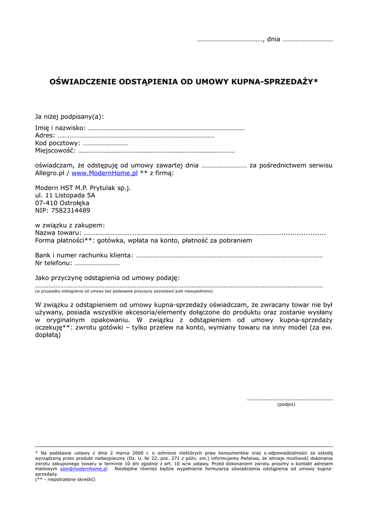 …………………………………, dnia ………………………… OŚWIADCZENIE ODSTĄPIENIA OD UMOWY KUPNA-SPRZEDAŻY* Ja niżej podpisany(a): Imię i nazwisko: ………………………………………………………………………………… Adres: ………………………………………………………………………………… Kod pocztowy: ……………………… Miejscowość: ………………………………………………………………………………… oświadczam, że odstępuję od umowy zawartej dnia ……………………… za pośrednictwem serwisu Allegro.pl / www.ModernHome.pl ** z firmą: Modern HST M.P. Prytulak sp.j. ul. 11 Listopada 5A 07-410 Ostrołęka NIP: 7582314489 w związku z zakupem: Nazwa towaru: ……………………………………………………………………………………………………….................... Forma płatności**: gotówka, wpłata na konto, płatność za pobraniem Bank i numer rachunku klienta: ………………………………………………………………………………………………… Nr telefonu: ……………………… Jako przyczynę odstąpienia od umowy podaję: ……………………………………………………………………………………………………………………………………………………… (w przypadku odstąpienia od umowy bez podawania przyczyny pozostawić pole niewypełnione) W związku z odstąpieniem od umowy kupna-sprzedaży oświadczam, że zwracany towar nie był używany, posiada wszystkie akcesoria/elementy dołączone do produktu oraz zostanie wysłany w oryginalnym opakowaniu. W związku z odstąpieniem od umowy kupna-sprzedaży oczekuję**: zwrotu gotówki – tylko przelew na konto, wymiany towaru na inny model (za ew. dopłatą) …………………………………………… (podpis) * Na podstawie ustawy z dnia 2 marca 2000 r. o ochronie niektórych praw konsumentów oraz o odpowiedzialności za szkodę wyrządzoną przez produkt niebezpieczny (Dz. U. Nr 22, poz. 271 z późn. zm.) informujemy Państwa, że istnieje możliwość dokonania zwrotu zakupionego towaru w terminie 10 dni zgodnie z art. 10 w/w ustawy. Przed dokonaniem zwrotu prosimy o kontakt adresem mailowym [email protected] Niezbędne również będzie wypełnienie formularza oświadczenia odstąpienia od umowy kupnasprzedaży. (** - niepotrzebne skreślić)