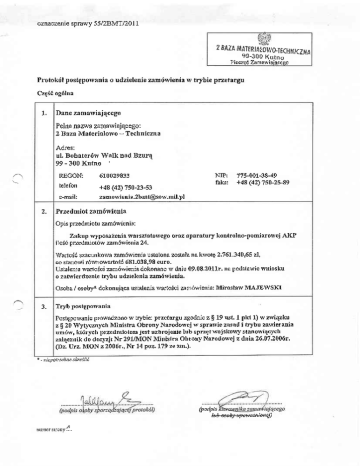 oztuczdiespmq.y55ABMT/20| 1 t'ot' "ffi 5og"ltt,tun,no o udziel€ ezandwi€Diaw hf,bie pzerargu Protokdlpost€porvania 1 Pelnat'@a @awiaj4ceso: 2 BazaMatc.illowo -Technimt ul, BoblteiJ\vWilkDsd Bzurl ITE6ON: 610029433 e-mil +43(421750-t3-5_l [email protected] NI?r f!k: t75-00133-4, r43 (42)7s0:s 39 2. Opisp*dmiotu am6MmD: zikup}"poslzonirs.Rr,ro$ego oBz,pr.aturtkonl.olno-Pniirdscj AI(P il036p.admd6wan6wienii 24. zt, aslala m krvot?2,761.340'65 Wanoidsacunkow.zm6\rrenjr uslaLona eu.o. cossnovi r6rhow!b{6 631.033,93 napodslawicrYniosku w dniu09.03.2011r. UstalenFwanolcizm6wieniadokonano trylu udzeloni! zmdwieda, o zanyterdzeDic usilenia Nandci am6wien,a:Mirdrl.w MArEwsKt osob! / s€h+ dokonujnca J- pmwadzono w trybie p.zctrgu zsddnicz 5 19usl-r Posrgpowanie Mirtstra ob.ony N,rodovcj * rprrnie zasld z $ 20wytysnych un6v, kl6rych Drzcdniolcmjesr nzrrojerie lub spztt vdFkovy z ,altc?nil LlodrJ7j, \r )sl/VON M'nkrr. Ob,otryNxroJoqej (Dz,Urz,MoNz2006r,,Nr14poz 1?9zed) oznacaniesprawf5t/2BMT/20LI 4. lvykrz0\6bhyitaolcb 7 p14sotrrniem rcropor.o'r o@ nrzcDrcsad^rko postQpowrrisr,o saronieanawiaj4crgd: 1. hir i .saisko ki*oMika mawiajaceso: Irk dr inr. cugorz LIsowsKI KieroMik hawid4cego zsodniez 0 3 usl I w. r,]rycznychzloil oiwildcanie na2hczny6 ddla z?v-11. 2. lni€ i nwisko pmcownikaanawiq4cego, k6Enu kicrcMik hapiaj{cego powiezyl ash-ze2onedla siebieczymosci w lostepo*din o udzielenie !plkSylrdler TROJSZCZAK CrrymoiC o udzielec zrh6nien'a Iuygd[orrniei p,zproNrdTrniepostglroyadr 7 ryrrraonm syboruosjlouysrrhjszej0rerrrohz arE icia uDo"r. Prrcownikmrviq{cggq krdremukiercwnikzu'wi'jqceso powictztl ^tnczanc dls siebiecarnotui w posl€poMniuo udziolenie zom6rvionia zgodniez S 3 ust.I w wa. n)i l zlo4l o{wildceniem zal4%D}dd.utuZPW.,,. 3, Kodsja pu talgow,rcstah povolanrw dniu09.03.2011.. napodnawiedeoyzj'/lraEqd:€ffjgJ{€sxlJd: Rozkrn DzieniegdDoyddcyIMy N'rZl53111 t otetd@r odaNhddde@d) Pzew.dtriczqcy - pprk MimsrawMAirEwsKr - Im Jlktrb CAWRYSIAK Selderaz hlr MrFln FURMANCZYK Cztonek kpt. &cck GAJEWSKI Czlonek komisjii zgddriez S3 u$. I rsv. wyb,caychzlozyli o{wiadcbnie CzloDkowie nabl4czonymdnlo ZP\v-l L i"! t;i oa.czlie spERy 55/2BMI/201 I ?.0rokdl pGtgposmir d udzi€lenieandwieni! s trybi(pzetlrgu nmwrdaDe8o Ogloeenieo Do*ipoMniu -. oEloeenieo pc epowdi-b blo prekrbe dooatdar i, " rBI?MOu): Biul.qheb olrMjrpubkz i vhkxd a Obrony Nmdowel w dniu09.08.2011.. i zostalodpublikoNrne r !t! MONv d,iu 09,03,2011.. r. Oslosh :eopo rfpo$diu)o blo pze\une ooog,6?1ids: a u r c p e rDne r ek, A A a c y . F D Aq, ' J n r u . . . . .I. a . .j t s l o o d u b h t o u s - e n a .ebEoD .A poonmeremrerrenornld post 3- osloszhie o plsepowatuuzonaloopub|kowane nesblnrs inteneiowejzamawhjRceeo: $yy?bDr.sow.nir,pl oddnia09,03,201h dodni€29,03.2011i 4, oslosbnie o posrgporvanin zosretomi*2cbne w sicdzibieZjnowiajqcego v niejs{: t.blici oglNzeri oddnia0t.08,201li, dodnia?9.08.2011r. Do,larto\ooe'os/Tno p.d.oo\-nu zo$to oprbrr."3 r:............ I'irornlcje i wyjiinicni, udzieldneWykoDr*con s rmkcielosrfpo\hni.. posr?poMnia W trakcrs Zan,wEj{cypismmNr y}!h- 213t/t j z dnio24.08201l! naza-ldoc o(re.loD\"h s rczol a e \11 ppa r wahnL6r pn4otg' .u.el t - ri3inie.. do9.z4, th l|o nn k ; wp detorEa. Info.Drcjc i Nl,.jlSnieni!ndziclonczanrwiaj{comu w trarcie postepoNrni,, W tftkcie badaniai oery ofen Zzna*iajqcyni mocyg 1l u*. 3 i zgodmcz g 32!f 2 Wytycmylhpisnod Nr wych.22SlllI I 2234llI z dnia0t 09201]i odz pisnani Nr \ach 2373/ll,479n l,2330/| |,2181/11,23a2]11 i 2J83/ttz dnia20.09.201]i wezwal wykonrwc6wdo uznpel eniadoktrmenr6w sklsdaj{cych sienaft3d zlozonychorefr MioFcsi t!.Din srdnd0.horcn: y sGdzibie Oaeny trslealosklada6 Zan,wiaj4ceso w sodz.?d l5m ubpzeslicpoczr{ 2 Baza Mlk.irro'o Tschni%3 ul,Bohircr6wWalknad Bzue. 99-300Krlno btrdynoknr 3, pok6j n. 220(lansht, ttrlrr). T*nh skladinoolerl uptnql rv dniu2t.03.20II r. o godT-1t'0. 3, 1 OMcicofedodbylosilwdDiu29,03,2011n u sodz.11rbezudzialuwykonsw6we: 2 Bm Mrrerialoro - Tecnnim. . Bohater6wwark D,d lzurtu 99-300Kuttu, 2. Do npryM tmiDu skrdmid ofcnzloro'o 3 ofcn,kiSrychzbrcca zd4chny drukZPW-12. 3, Krob brutto,jak4ZmawiaJ4cyamisoa pu eznacztdnasfinansomie calosci an6vieni.*ynosi3.396-.149,0021. tnlornncja o spclnirnitrvrrunkdw udzi,ln rv Dodepowniu Wynagmevrunki udzialuw poslpowantuspelniaI Wykonrvc6w, Informacjao spelnianiuvamnkdwudzialu* p6r9pow.niua*artajest naal4ctunym l,{Ui om(zDic spmsy55/2Bi4T/201 I W ponqpowmr .ie p-yj?to 0 ofert. rskn{.dnierq{i€b€ l{*j€sr**sltp *IwrB W poneporhniunie *ybrmo 3 olcn U.: ofenyNr2 v pradmiolac[u m6vlnit tX,14,16,0i 23 Ofetu Nr 3 rv pzcdDiohcn zaDdsieni, 13,14,16i 17 Ofert Nr 6 - s pzedmidciczn6wjeni. 19 Lislaolen nie*l bEDychawai4jest nazitlchnyrr druta 7-PWl9. 12. L Kazdyelonek kdisji przetugovejdokonaiindyavidualiej @enyofefrm zt{canyn dnl<! ZPW20.Z6lo$wno lfrdeliumophanewzorem.Napddshwiesrsaanj€ oceny dokoDanego nazl4c@nyn drukuZPW-21wlhr&o oferlr: nher oferty4 Iim(n,zw) ldies numd ofqry 5 nma (iana) numr otsg 6 finm (n3e) - v p.zdmiol0ch zin6rvi.nia 1,1J i 1.1 BRJsp.z..o. - Al. I<jakowkl 155,02 130w3rsw. - r pEcdntdtacDzandvientu15i 20 -ul. czniakowkr 3l /33,00-95 7 W{saw w p.zcdniohch zrn6aieni, 21,22 i 23 ANKOL Sp.z o.o.o nuDeroferty7 rv pnedDiollch zamdrietrh 16i 13 fima (mbva) Ccs|.? lcbclc scflisni i.s- Mladobolsslavska adfts numeroteq3 nlm (nzzm) adrs - Aipon Kbcly, t 9721Pnhag-Kbcly,Czchy - ryDrzedntotlcD zlm6vled! 17,19i 24 - MlcMARldgisrie & ConnrllingElzbietaMaSlM - ul. Sklodowskiej I0, 99-300Klho zamawiaj{cyzgddniez $ 3s ust.I wytymych $ybrt ofertymjkorzyshiejs pmttgr t. oldrJ M podstawickryrcd'5wocenyolcrt oktBlorych\| Warunkach ;;;;EG;;:,;,;;,;j;;A 2. Na pu dni0t zrndwienia| 6 i I l, msElazlozonaqko j ednaofensodposiadaj{ca treici tt/.tunk6wptutgu t. nuncrofcdy 1 - * p.z.dnio.ic z,nfiyterta 6 -ZE.A.?.,,MEIATRONIKs.A. nm(nazM) adra ul.DaEke23/30,02-315 Wasaw numeroLfty 6 ry Dnedniociez.Dtuieri 1l -ANKoLSp zo.o.o nma (nada) - 39-331 adres CFIORZFLOW 244 Uz.$dnic eyybo.u: W opeciu o $ 37!$. 2 lw. 