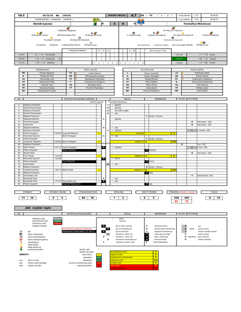 19-3 10.12.16 Sb. (15:31) 4,7 JAKOŚĆ MECZU - 24 11 ( 6 - 8 ) FRANKOWSKI ( WINKLER - HOENIG ) Górnik Łęczna 3 0 0 2-Leandro. .4-Gerson. .15-Grzegorz Bonin 1:15:41 < 8 > 10. .Hernandez 0 1:25:50 < 15 > 9. .Grzelczak 0 1:31:03 < 18 > 19. .Ubiparip 00:48:31 Termalica Nieciecza 11-Patrik Misak. .6-Bartłomiej Babiarz. .25-Szymon Drewniak .3-Aleksander Komor. .6-Paweł Sasin 22-Guilherme. 0 1 1 1 0 0 0 0 1 3 0 0 0 0 0 0 0 0 0 0 0 0 0 0 3 REZERWOWI .28-Vlastimir Jovanović . .7-Samuel Stefanik 25-Mateusz Kupczak 1-Wojciech Małecki 0 00:46:52 (+3) 24-Wojciech Kędziora .45-Przemysław Pitry. 5-Łukasz Tymiński. (+1) II-ga połowa 0 18-Bartosz Śpiączka 8-Grzegorz Piesio. I-sza połowa 2 1 -1 -2 -3 3 2 1 -1 -2 .15-Kornel Osyra. .96-Przemysław Szarek. 80-Krzysztof Pilarz -3 0:55:59 < 7 > 19. .Guba 0:56:05 < 24 > 10. .Gergel 1:08:20 < 6 > 88. .Kowal REZERWOWI POZA KADRĄ .8-Patryk Fryc POZA KADRĄ 79 Prusak Sergiusz 11 Jurisa Slaven 1 Baran Krzysztof 77 9 Grzelczak Piotr 22 Mierzejewski Łukasz 5 Ziajka Sebastian 20 Nowak Dawid 10 Hernandez Javi 77 Danielewicz Krzysztof 10 Gergel Roman 21 Gutkovskis Vladislavs 12 Dzalamidze Nika 7 Vukobratović Dragomir 17 Pleva Dalibor 9 Smuczyński Bartłomiej 19 Ubiparip Vojo 16 Dźwigała Adam 18 Stano Pavol 12 Trela Dariusz 23 Szmatiuk Maciej 17 Pruchnik Radosław 19 Guba David 14 Wróbel Jakub 93 Bogusławski Łukasz 0 0:00:00 88 Kowal Wołodymyr 99 Juhar Martin 0:00:00 0 0:00:00 min. Putiwcew Artem 0 ASYSTA-FAULOWANY-ZAWINIŁ BRAMKARZ AKCJE Górnik Łęczna. WOLNE DYSTANS .Termalica Nieciecza 2 Kędziora Wojciech 0:00:00 0 0 0 1 + główka 0 0 0 0 0 4 Szarek Przemysław 0:00:00 0 0 0 2 - 0 0 0 0 0 6 Kędziora Wojciech 0:00:00 0 0 0 2 0 nie trafił w piłkę 0 0 0 0 0 6 Szarek Przemysław 0:00:00 0 0 0 2 + szp. 0 0 0 0 0 6 Małecki Wojciech 0:00:00 0 0 0 0 0 0 1 strzał + obrona 0 0 0 9 Śpiączka Bartosz 0:00:00 0 0 1 0 - główka 0 0 0 0 0 10 Pitry Przemysław 0:00:00 0 0 0 0 - 0 0 0 0 -2 nad poprz. (20) 24 Guilherme 0:00:00 0 0 0 0 - 0 0 0 0 -2 nad poprz. (25) 27 Śpiączka Bartosz 0:00:00 0 0 2 0 + szp. 0 0 0 0 0 28 Kędziora Wojciech 0:00:00 0 0 0 1 + dystans 0 0 0 1 w środek (20) 30 Piesio Grzegorz 0:29:42 Kupczak Mateusz ż 0 0 0 0 0 38 Drewniak Szymon 0:00:00 Bonin Grzegorz - 3 0 + szp. 0 0 0 0 38 Pilarz Krzysztof 0:00:00 0 0 0 0 0 0 1 strzał + obrona 0 0 0 47 Jovanović Vlastimir 0:46:02 Bonin Grzegorz ż 0 0 49 Kędziora Wojciech 0:00:00 0 0 0 0 - 52 Sasin Paweł 0:51:12 Piesio Grzegorz + 4 0 52 Pilarz Krzysztof 0:00:00 Misak Patrik(3) 0 0 59 Misak Patrik 0:00:00 0 0 61 Fryc Patryk 1:00:50 0 63 Drewniak Szymon 63 główka 4 kopnięcie 0 0 0 0 0 0 -2 0 mur (18) + dystans 0 0 0 3 w bok (25) 0 0 0 -1 dystans 0 0 0 0 0 - 0 0 -2 nad poprz. (20) ż 0 0 0 0 0 1:02:08 0 0 6 0 + karny 0 0 0 0 Pilarz Krzysztof 0:00:00 Fryc Patryk(3) 0 0 0 0 0 -1 karny 0 0 0 79 Guba David 0:00:00 0 0 0 3 + sns. 0 0 0 0 79 Małecki Wojciech 0:00:00 0 0 0 0 0 0 2 strzał + obrona 0 0 0 85 Tymiński Łukasz 1:24:17 Misak Patrik ż 0 0 0 0 0 85 Małecki Wojciech 0:00:00 0 0 0 0 0 0 -1 wdp. 0 0 0 90 Hernandez Javi 0:00:00 0 0 0 0 - 0 0 0 0 -1 obok słupka (20) 91 Grzelczak Piotr 0:00:00 0 0 2 0 - szp. 0 0 0 0 0 92 Grzelczak Piotr 1:31:37 Hernandez Javi + 6 0 + szp. 0 0 0 0 0 92 Pilarz Krzysztof 0:00:00 Kupczak Mateusz(3) 0 0 0 0 0 -1 szp. 0 0 0 RZUTY ROŻNE PODANIA (PONIŻEJ % CELNE) STRZAŁY 11 STRZAŁY CELNE 12 6 4 0 0 2 zagranie ręką 0 0 3,5 wejście w nogi POSIADANIE PIŁKI 84 3,5 wślizg w nogi 0 SPALONE 16 1 3 2 5 438 383 81 73 FAULE 8 Jak czytać wpis min. ASYSTA lub FAULOWANY dokładny czas szacunkowy czas zmieniony czas (odjęto przerwę) 0 0 0 gol błąd i utrata gola karny wykorzystany karny niewykorzystany samobójczy żółta kartka żółta kartka x2 anulowana katka SKRÓTY 0 sns szp wdp sam na sam strzał z pola karnego wyjście do piłki AKCJE + - 0:00:00 0:00:00 0:00:00 6 gol w 100% sytuacji 5 na czerwono zagrożony kartkami Zawalił gola (skala błędu 1,2, lub 3) 4 3 asysta i gol asysta bez gola niewykorz. 200% syt. niewykorz. 100% syt. 2 1 gol w trudnijszej syt. gol zza pola kar. 3 niewykorz.trudniejszej syt. niewykorz. strzał z dyst. + ż nie wiadomo za co zagranie ręką aulowana ż niesportowe zachowanie aulowana cz cz cz niegroźny faul brutalny faul dwie żółte żółta kartka czerwona kartka/druga żółta czerwona kartka BRAMKARZ WOLNE DYSTANS celne niecelne czerwona kartka 3 2 1 -1 -2 -3 F obroniony karny bardzo dobra interwencja poprawna interwencja utrata gola lub błąd błąd i utrata gola kompromitacja brak interwencji 1 2 3 3,5 4 5 6 3 2 celne 1 -1 -2 niecelne -3 gol grożny strzał strzał w światło bramki grożny strzał dość niecelny bardzo niecelny 15 0 x 0