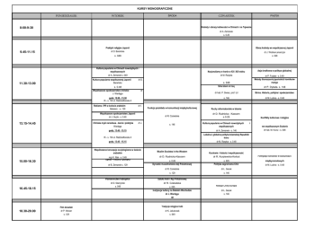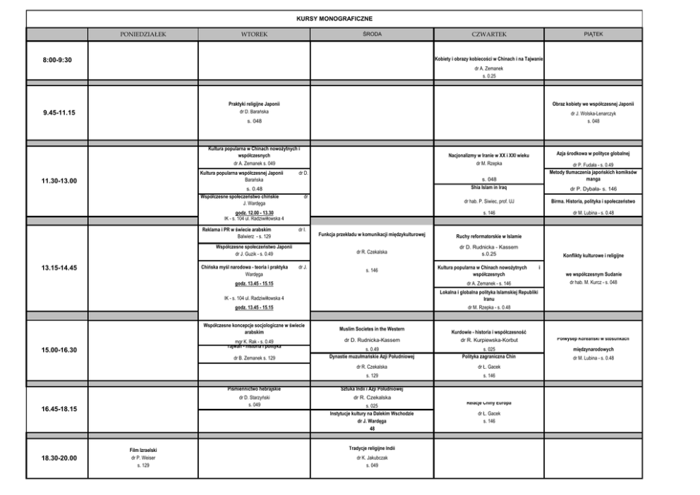KURSY MONOGRAFICZNE PONIEDZIAŁEK WTOREK ŚRODA CZWARTEK PIĄTEK Kobiety i obrazy kobiecości w Chinach i na Tajwanie 8:00-9:30 dr A. Zemanek s. 0.25 Praktyki religijne Japonii dr D. Barańska 9.45-11.15 Obraz kobiety we współczesnej Japonii dr J. Wolska-Lenarczyk s. 048 s. 048 Kultura popularna w Chinach nowożytnych i współczesnych Nacjonalizmy w Iranie w XX i XXI wieku Azja środkowa w polityce globalnej dr A. Zemanek s. 049 dr M. Rzepka dr P. Fudała - s. 0.49 Metody tłumaczenia japońskich komiksów manga Kultura popularna współczesnej Japonii Barańska 11.30-13.00 s. 0.48 Współczesne społeczeństwo chińskie J. Wardęga dr D. s. 048 Shia Islam in Iraq dr godz. 12.00 - 13.30 IK - s. 104 ul. Radziwiłłowska 4 Reklama i PR w świecie arabskim Balwierz - s. 129 dr I. Współczesne społeczeństwo Japonii dr J. Guzik - s. 0.49 Chińska myśl narodowa - teoria i praktyka Wardęga 13.15-14.45 dr J. Film Izraelski dr P. Weiser s. 129 Ruchy reformatorskie w Islamie dr R. Czekalska dr D. Rudnicka - Kassem s.0.25 Kultura popularna w Chinach nowożytnych współczesnych IK - s. 104 ul. Radziwiłłowska 4 Lokalna i globalna polityka Islamskiej Republiki Iranu godz. 13.45 - 15.15 dr M. Rzepka - s. 0.48 dr B. Zemanek s. 129 18.30-20.00 dr M. Lubina - s. 0.48 dr A. Zemanek - s. 146 mgr K. Rak - s. 0.49 Tajwan - historia i polityka 16.45-18.15 Birma. Historia, polityka i społeczeństwo s. 146 godz. 13.45 - 15.15 Współczesne koncepcje socjologiczne w świecie arabskim 15.00-16.30 dr hab. P. Siwiec, prof. UJ Funkcja przekładu w komunikacji międzykulturowej s. 146 Muslim Societes in the Western dr P. Dybała- s. 146 Konflikty kulturowe i religijne i we współczesnym Sudanie dr hab. M. Kurcz - s. 048 Kurdowie - historia i współczesność dr D. Rudnicka-Kassem dr R. Kurpiewska-Korbut Półwysep Koreański w stosunkach s. 0.49 Dynastie muzułmańskie Azji Południowej s. 025 Polityka zagraniczna Chin dr M. Lubina - s. 0.48 dr R. Czekalska dr Ł. Gacek s. 129 s. 146 Piśmiennictwo hebrajskie Sztuka Indii i Azji Południowej dr D. Starzyński s. 049 dr R. Czekalska s. 025 Instytucje kultury na Dalekim Wschodzie dr J. Wardęga 48 Tradycje religijne Indii dr K. Jakubczak s. 049 Relacje Chiny Europa dr Ł. Gacek s. 146 międzynarodowych